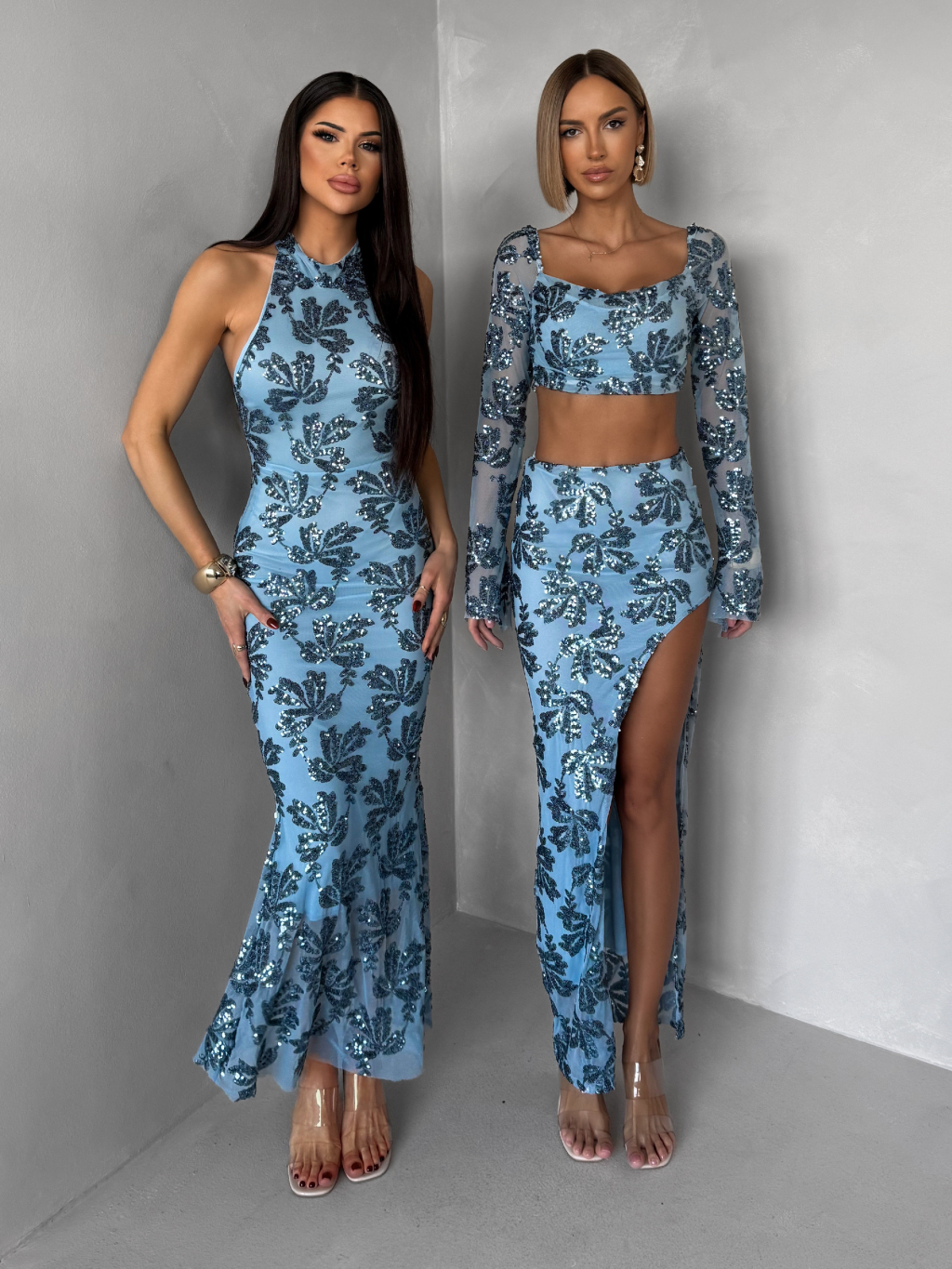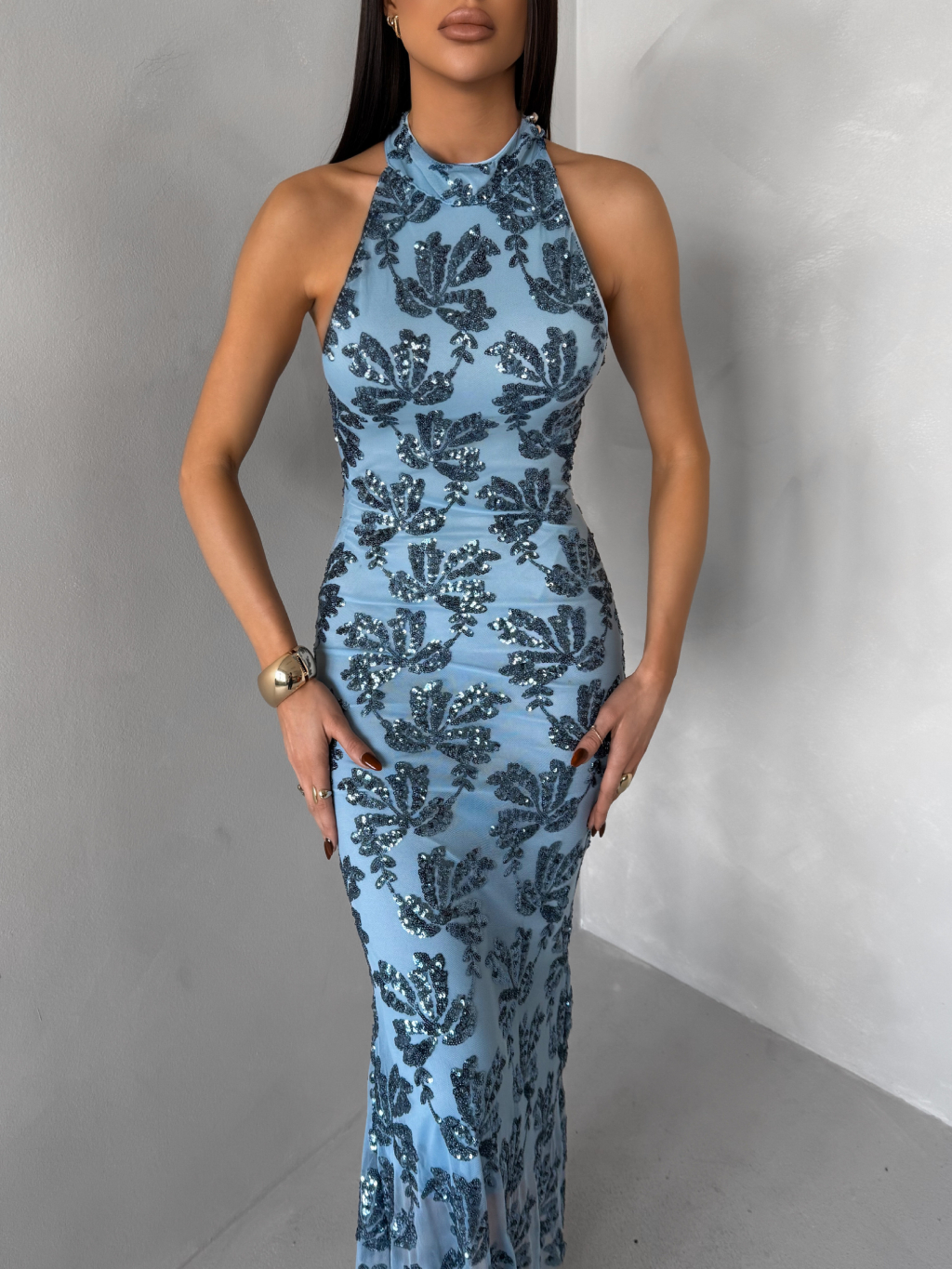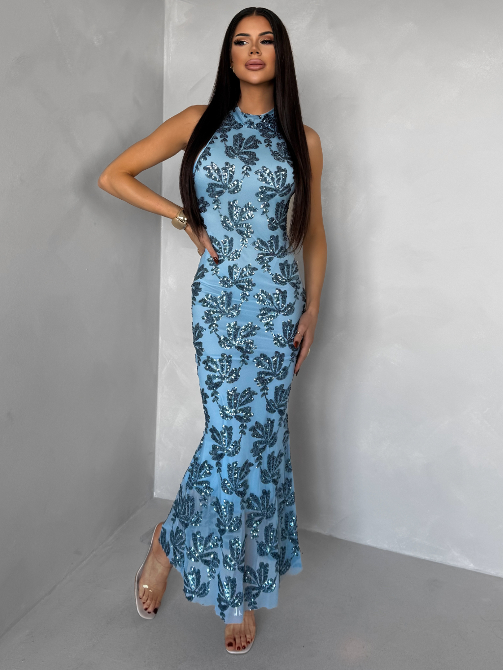 Modré společenské dlouhé flitrované šaty SOLVAYA