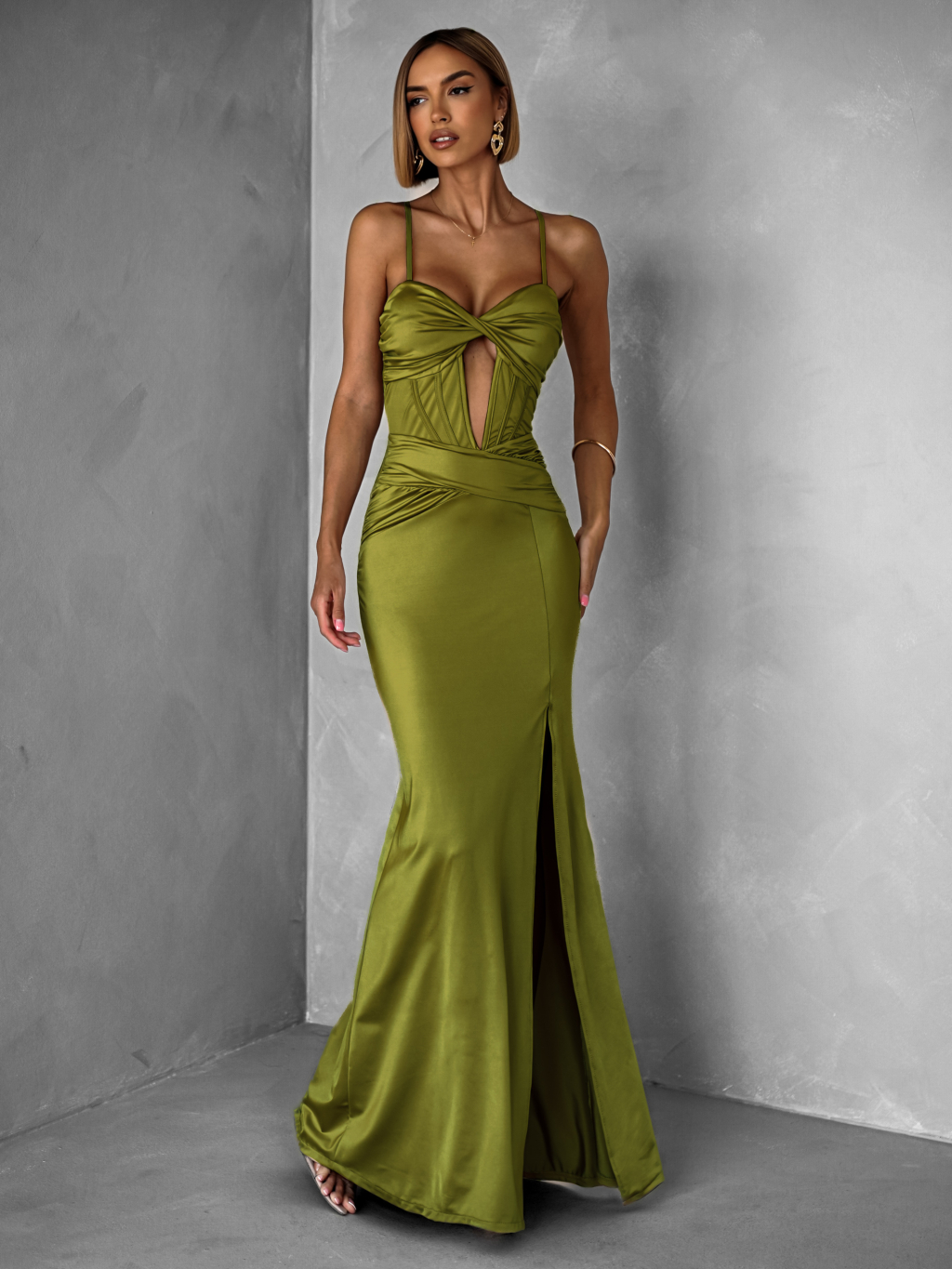 Olivové dlouhé společenské šaty LIMONA s rozparkem