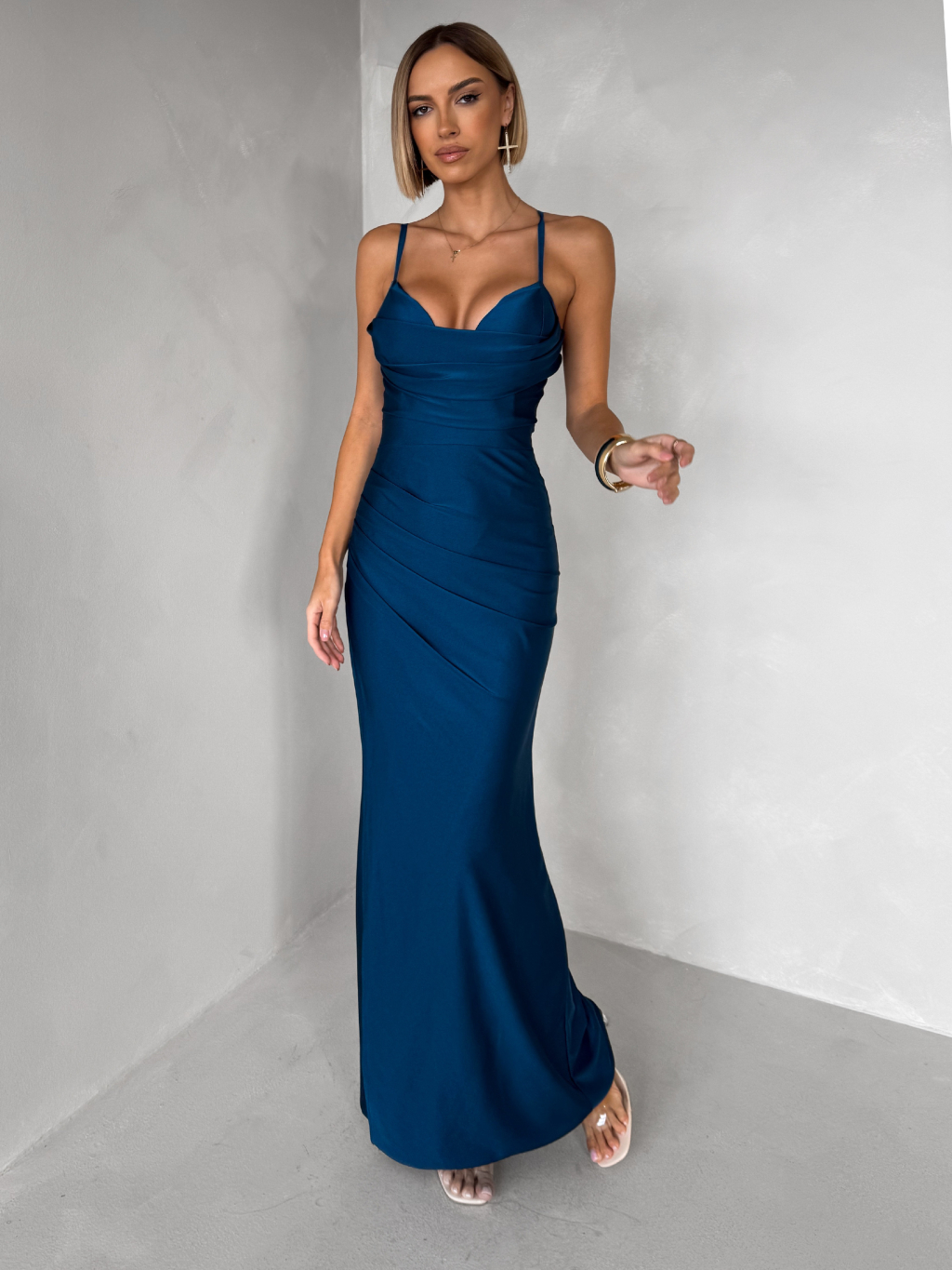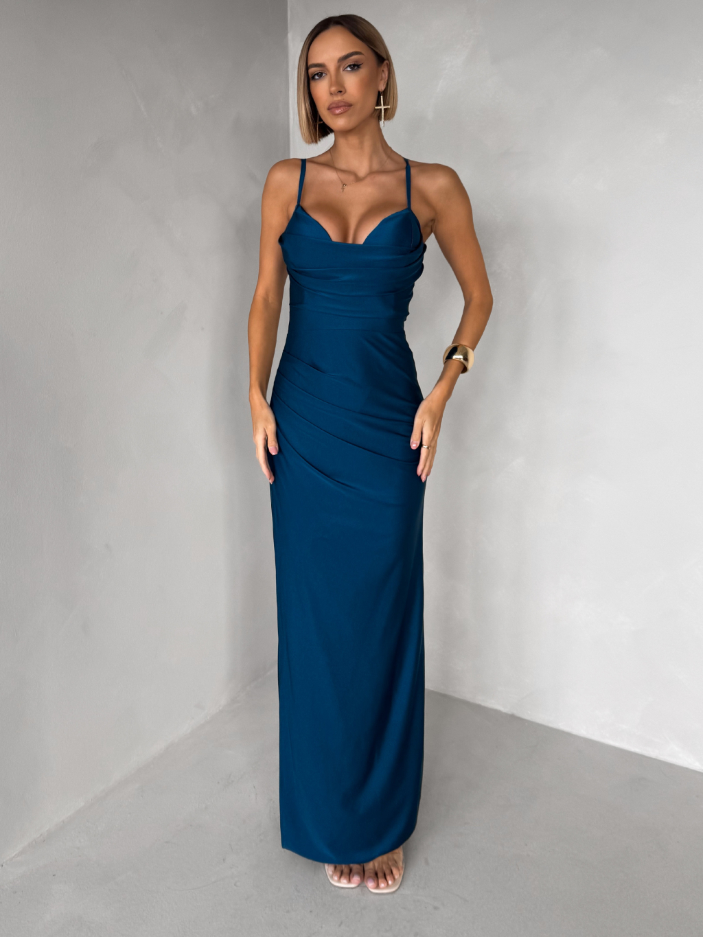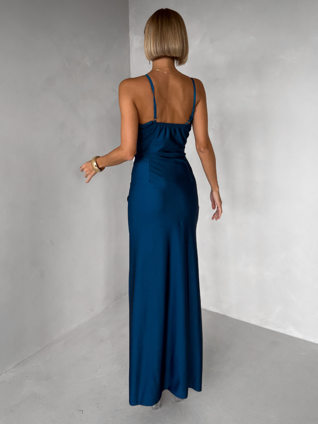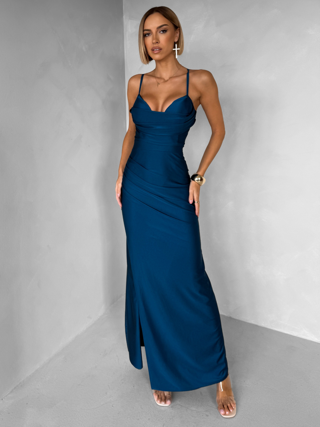 Petrolejová dlouhé saténové společenské šaty ORIXY s výstřihem