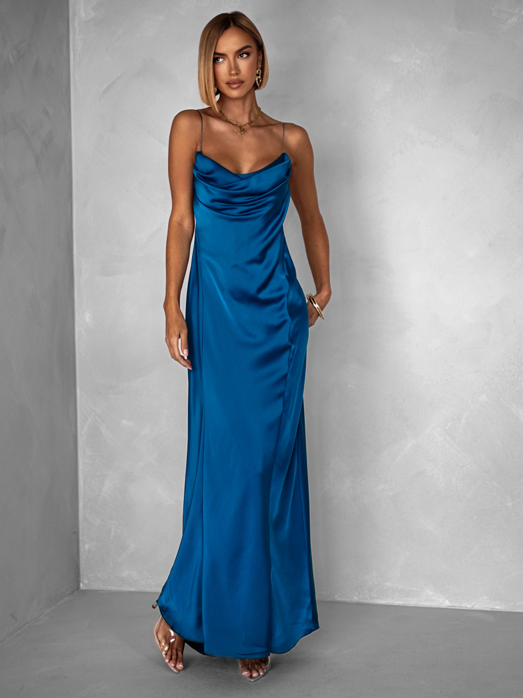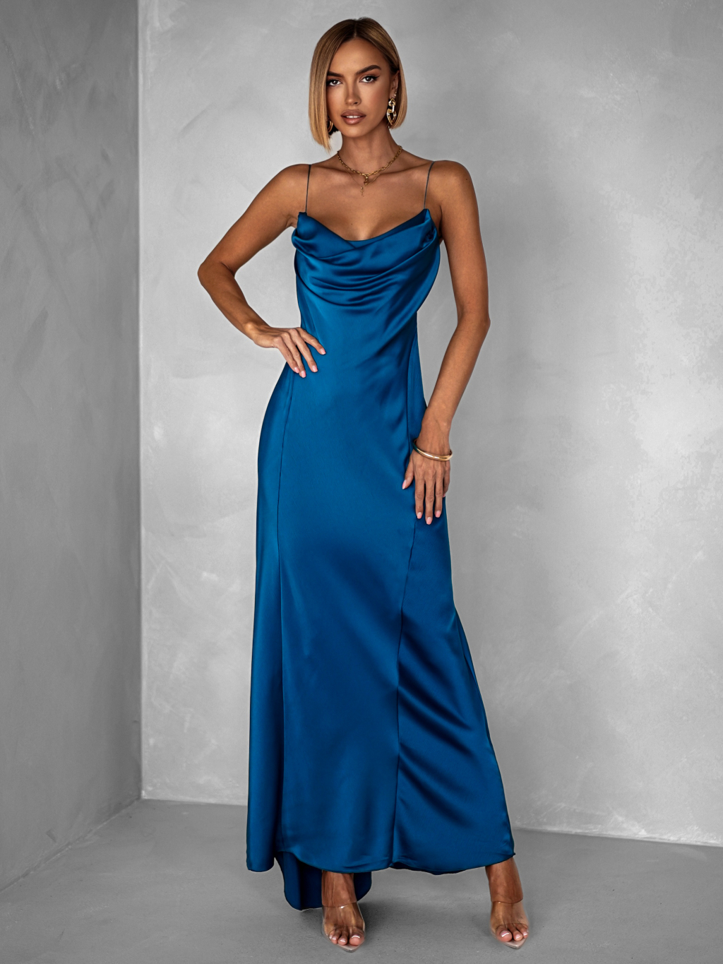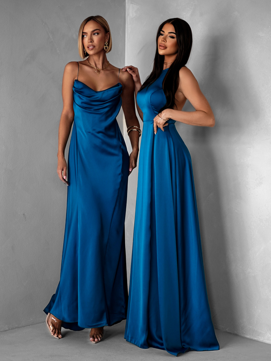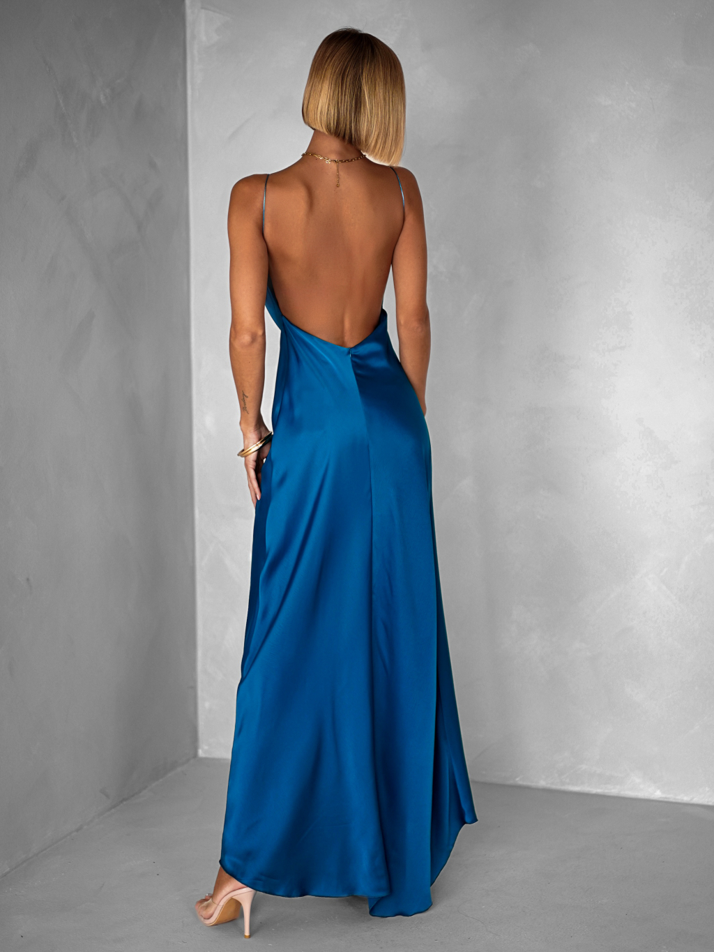 Petrolejové dlouhé saténové šaty UNUTA s odhalenými zády