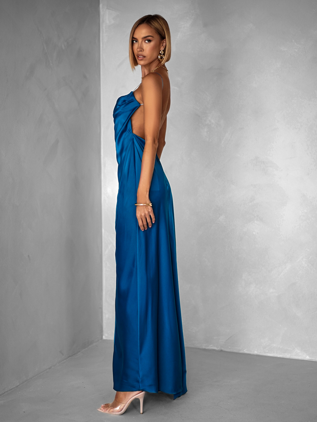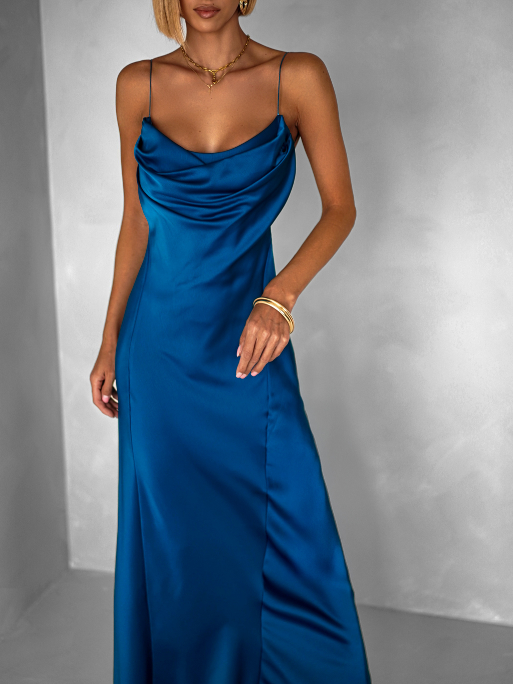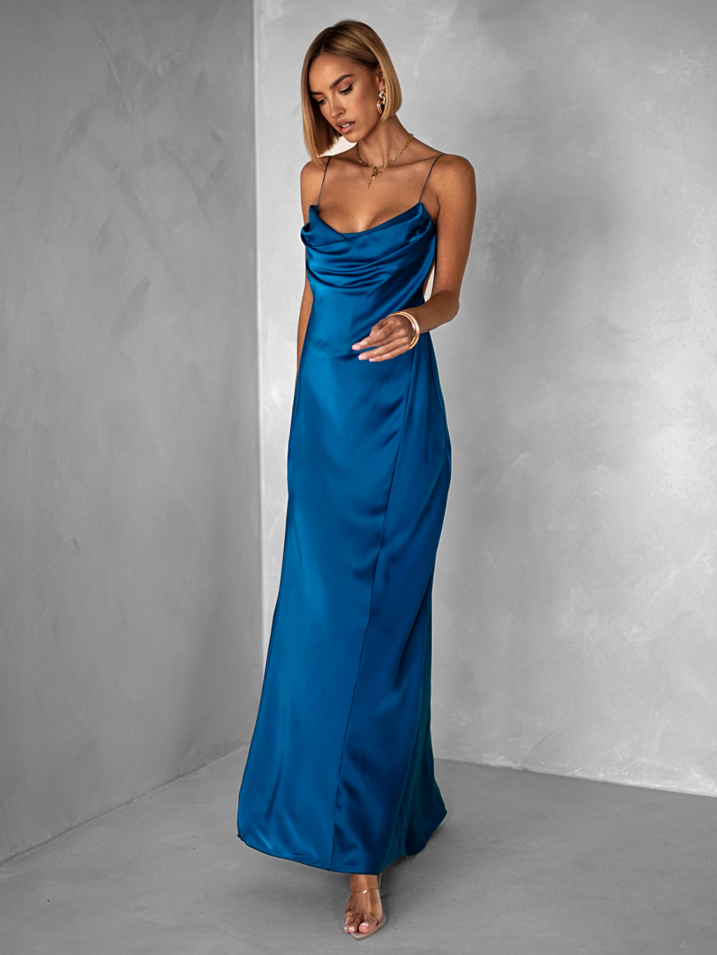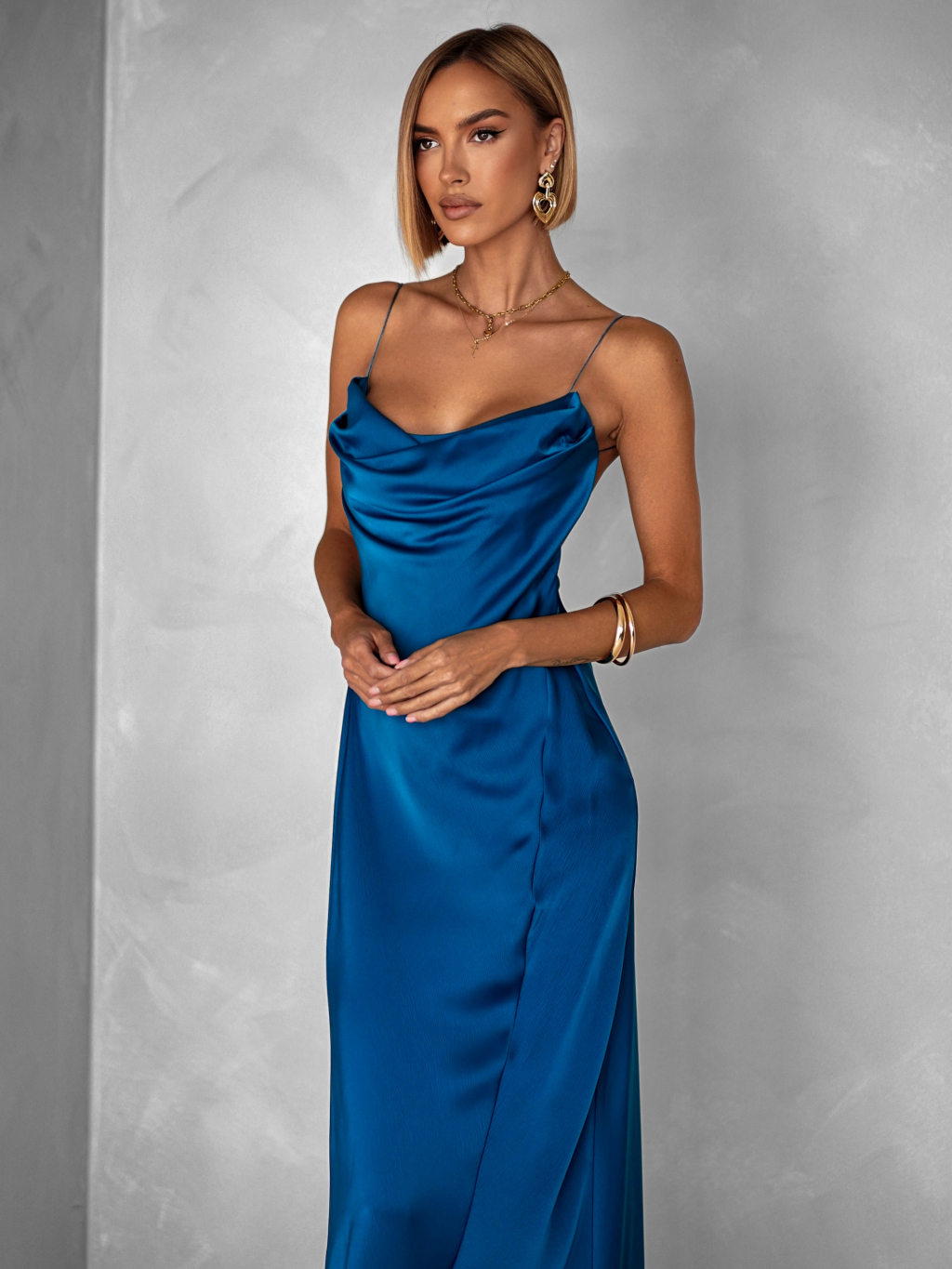 Petrolejové dlouhé saténové šaty UNUTA s odhalenými zády