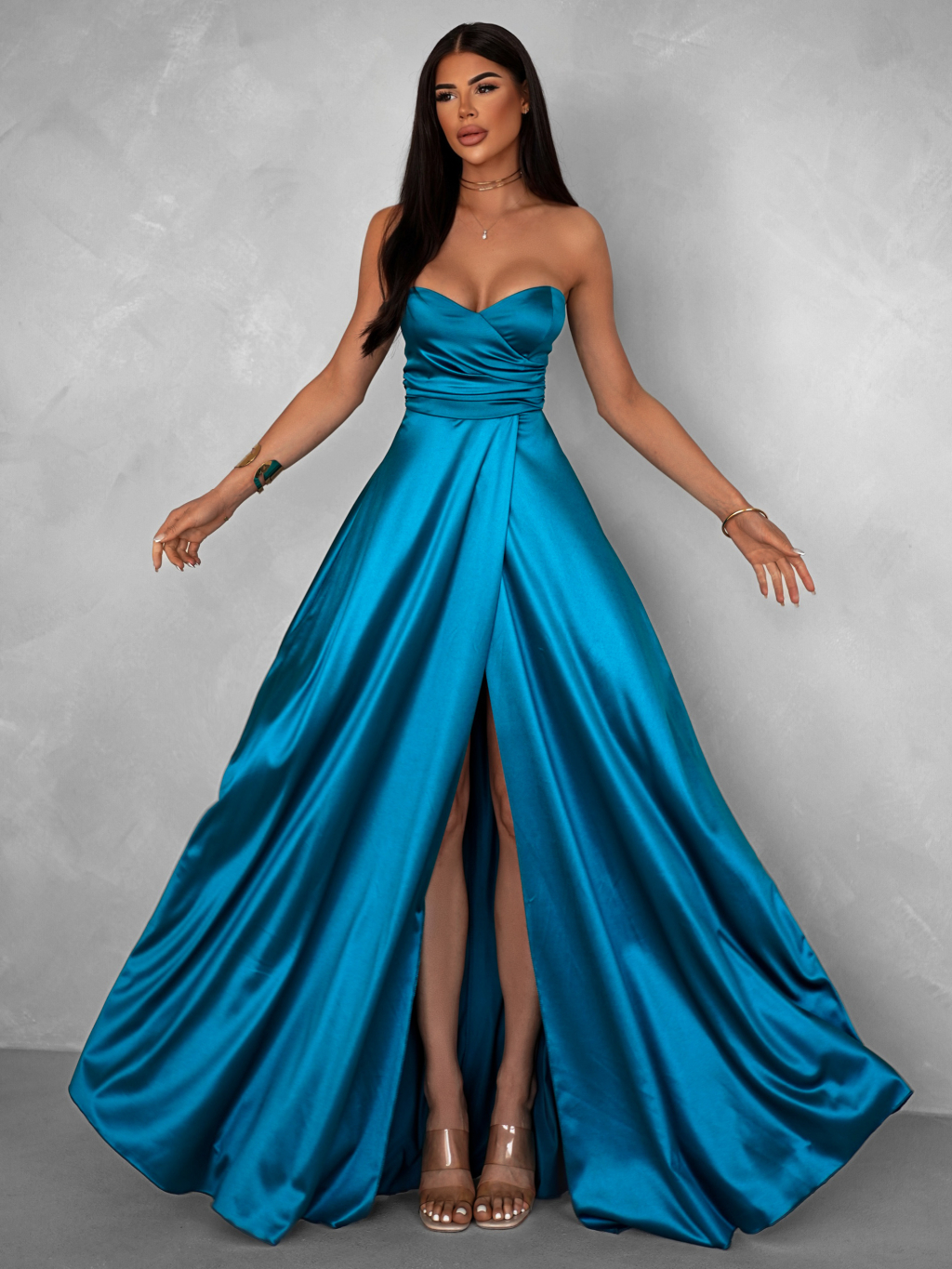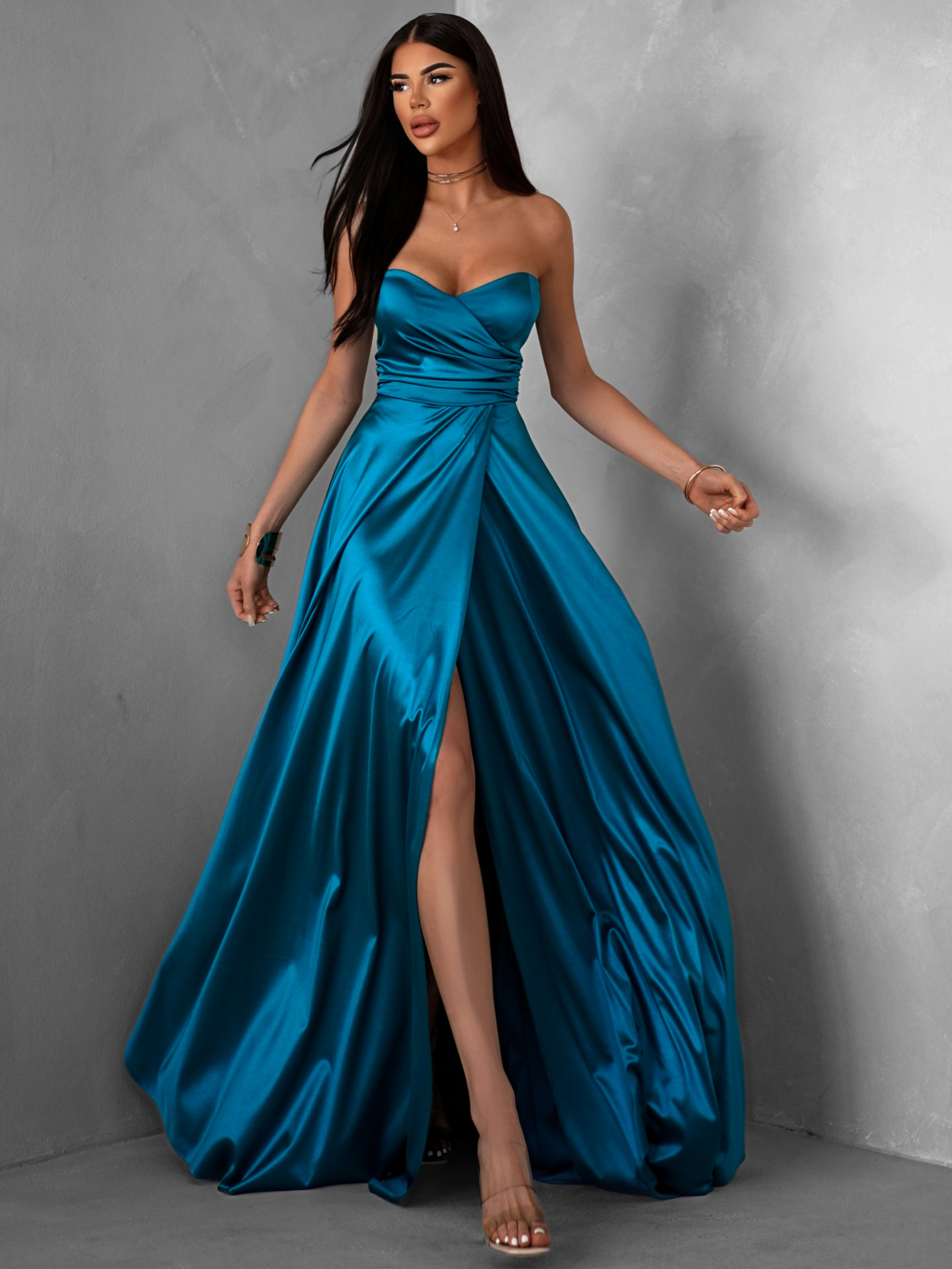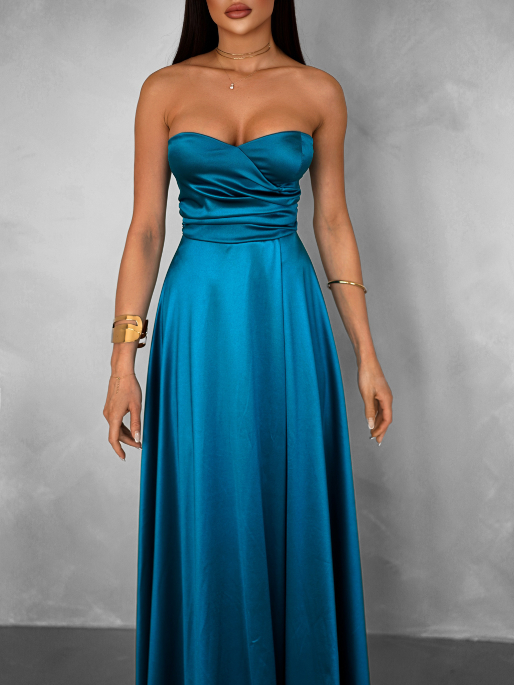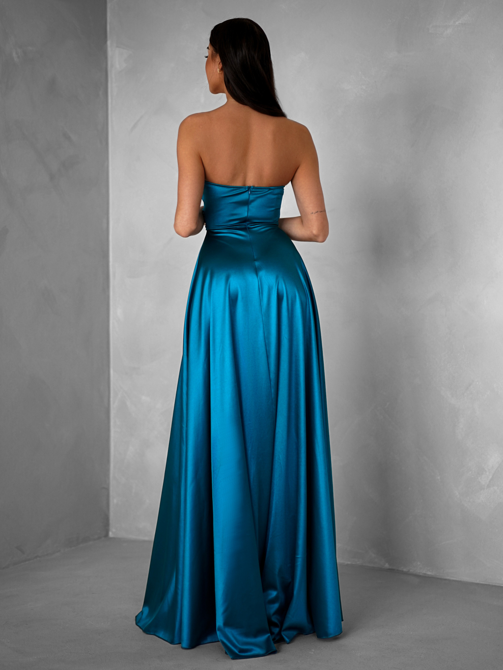 Petrolejové saténové dlouhé společenské šaty SYCHAEUS bez ramínek