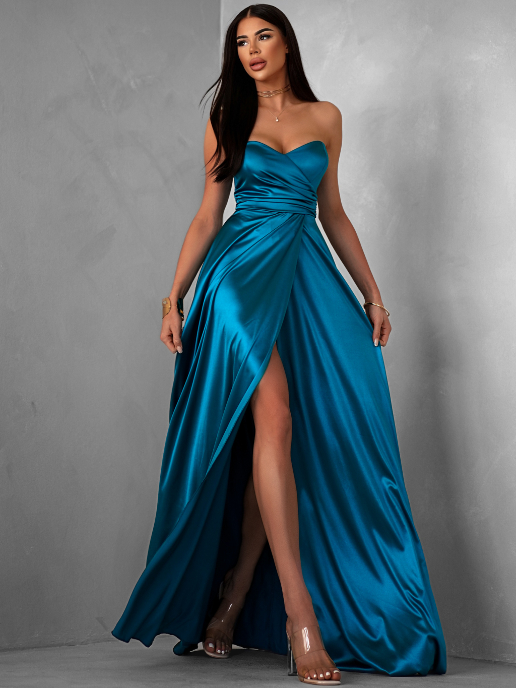 Dopřejte si jedinečný vzhled v saténových společenských šatech, které podtrhnou vaši ženskost a šarm. Šaty mají smyslný střih bez ramínek, jemné řasení v oblasti pasu a výrazný rozparek, který dodává outfitu odvážný i sofistikovaný nádech. Lehký saténový materiál krásně splývá, pohodlně se nosí a působí luxusně. Skvěle se hodí na plesy, večerní akce, svatby či jiné slavnostní příležitosti.