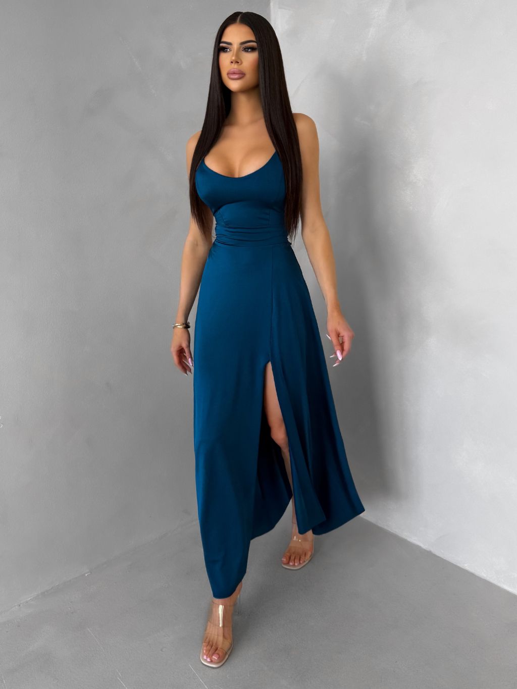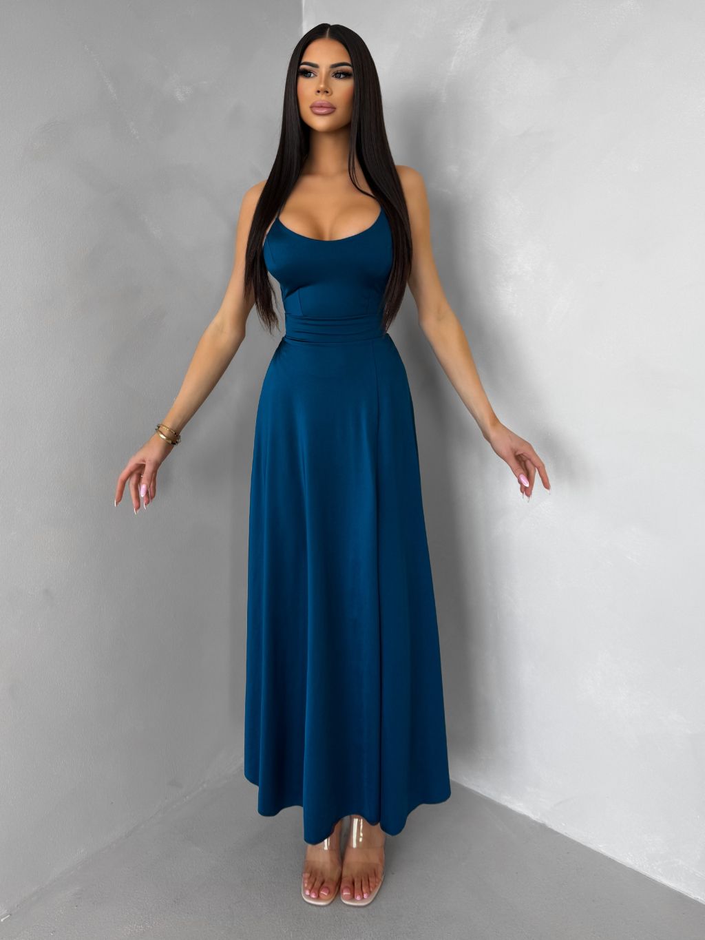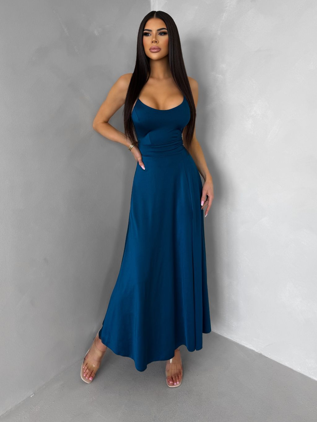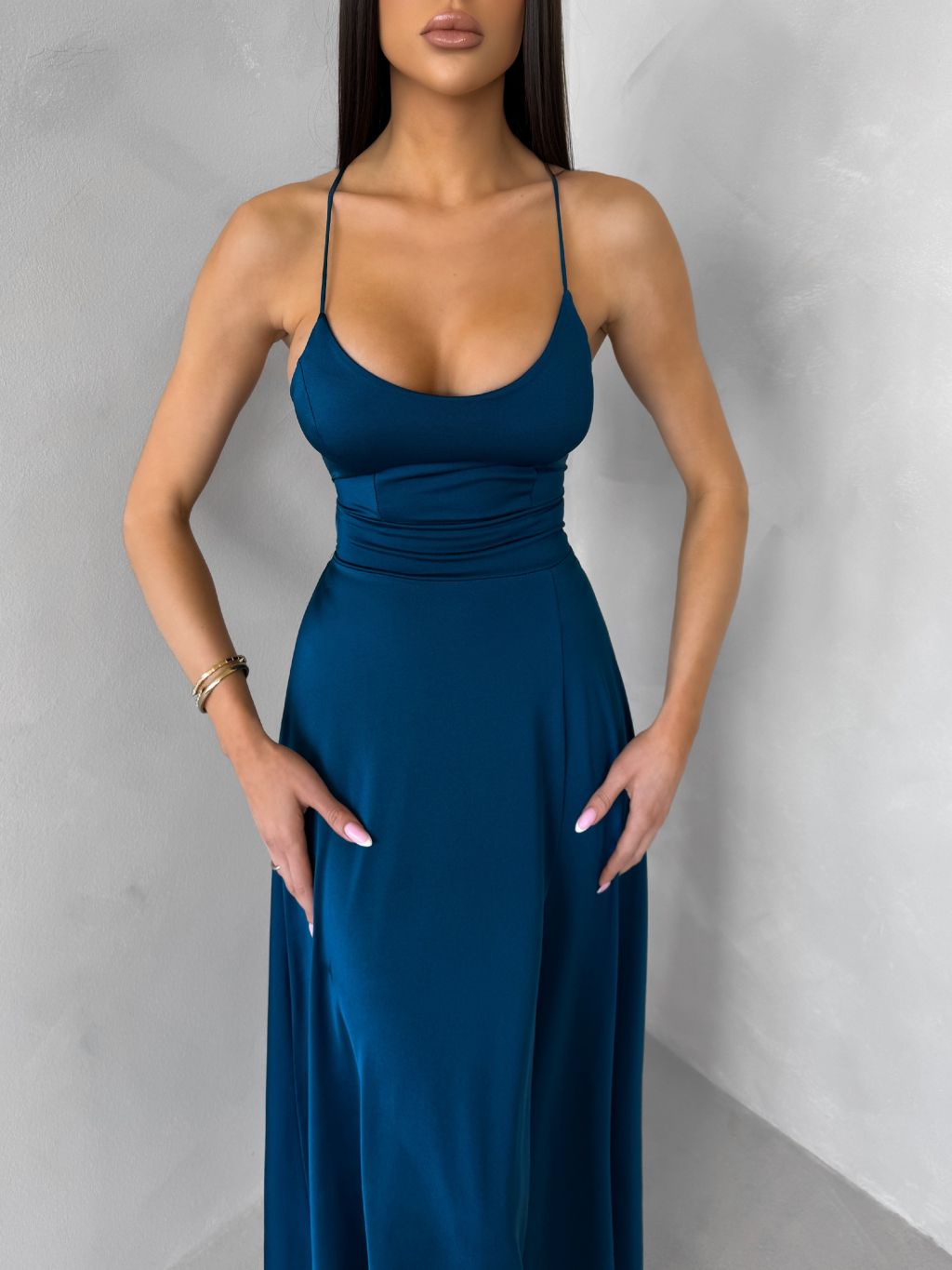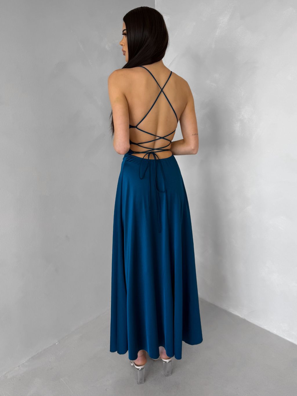 Petrolejové saténové elegantní midi šaty SIMUEL se šněrováním