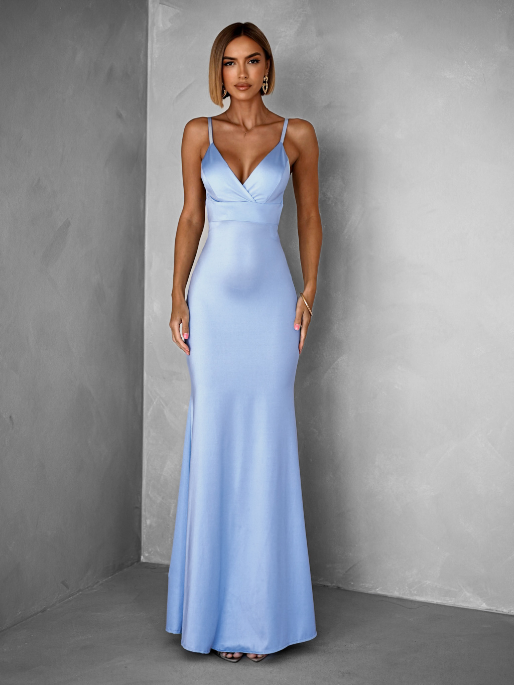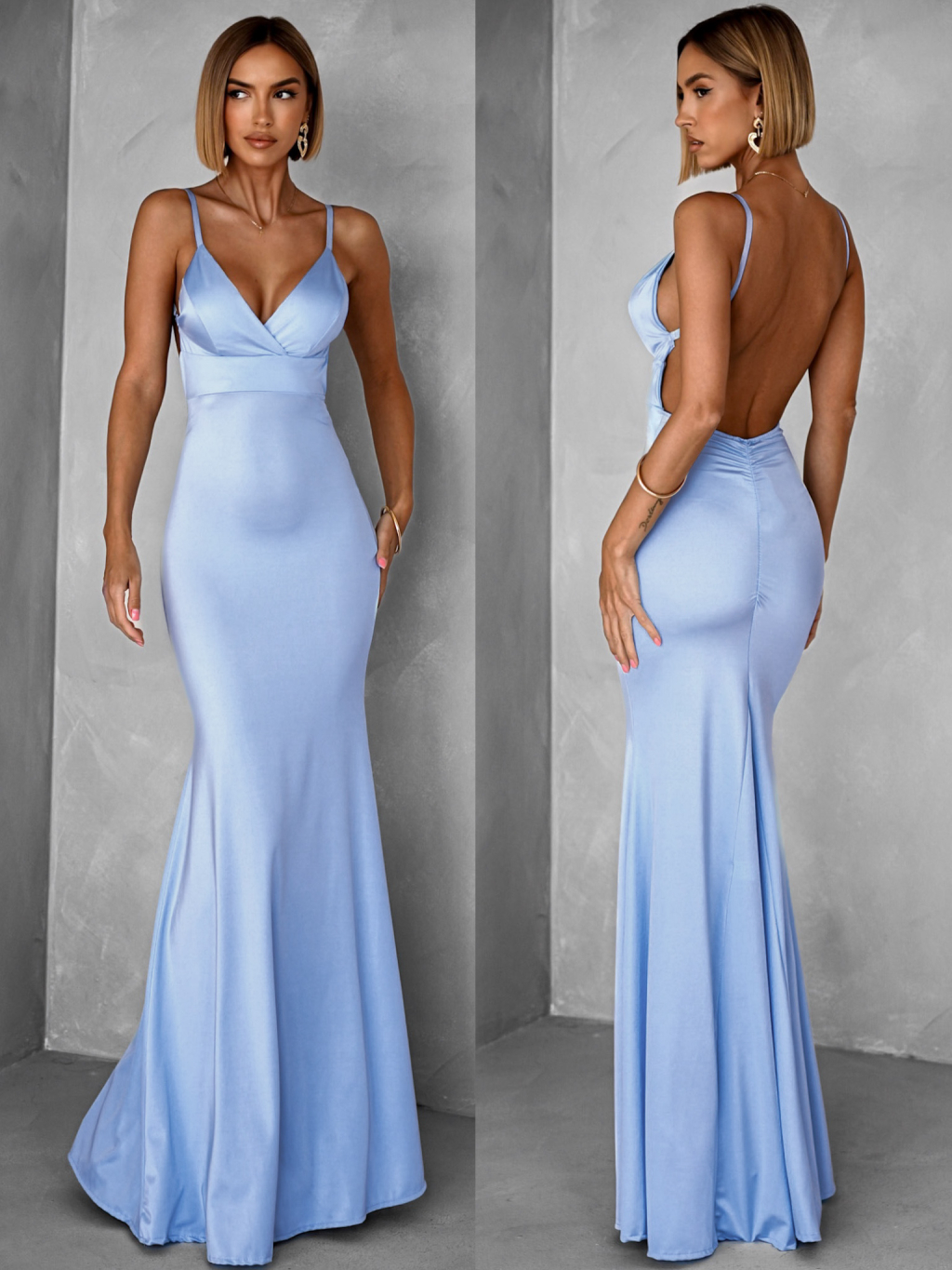 Pomněnkové dlouhé saténové šaty MARSELLE s odhalenými zády