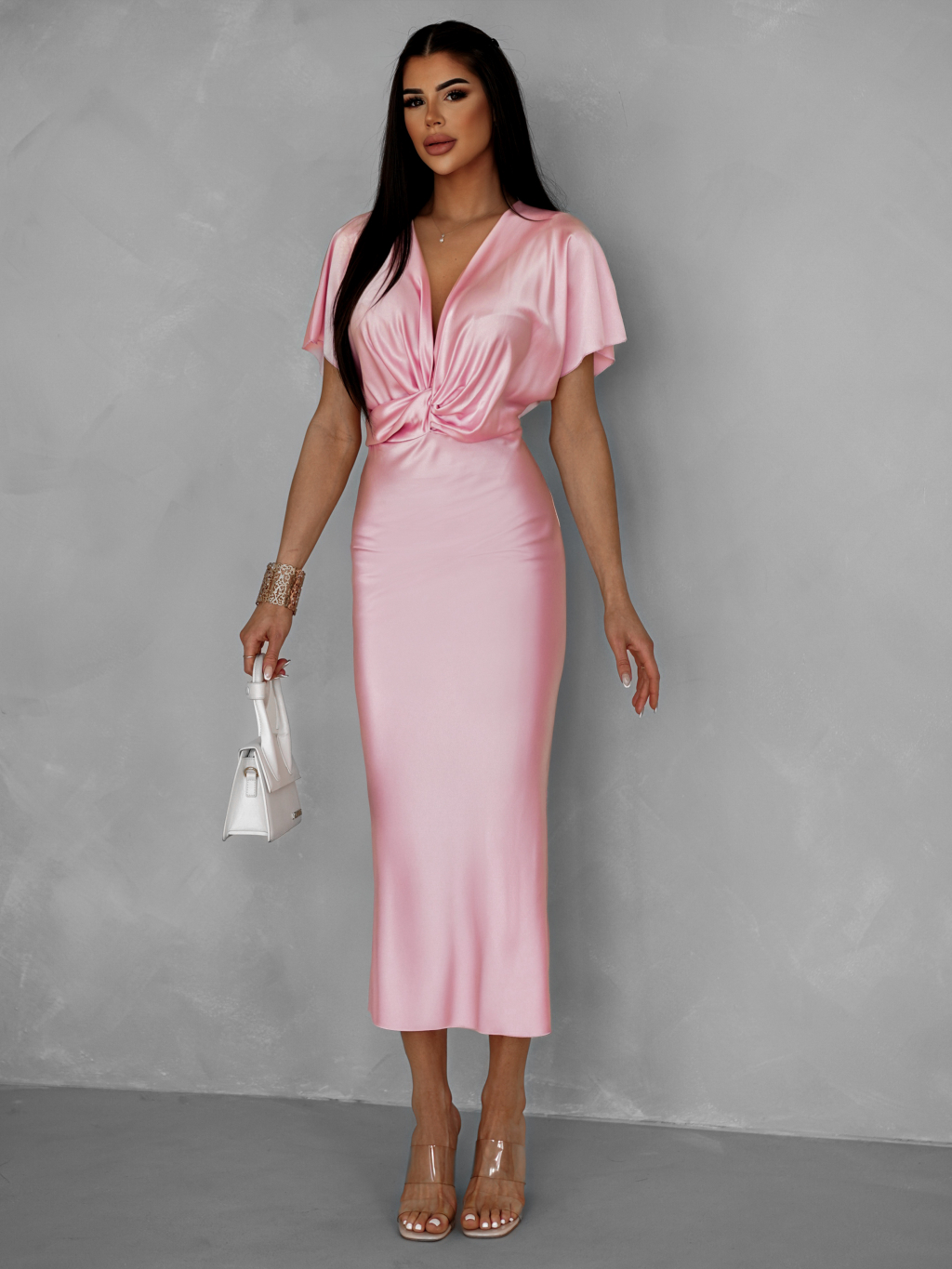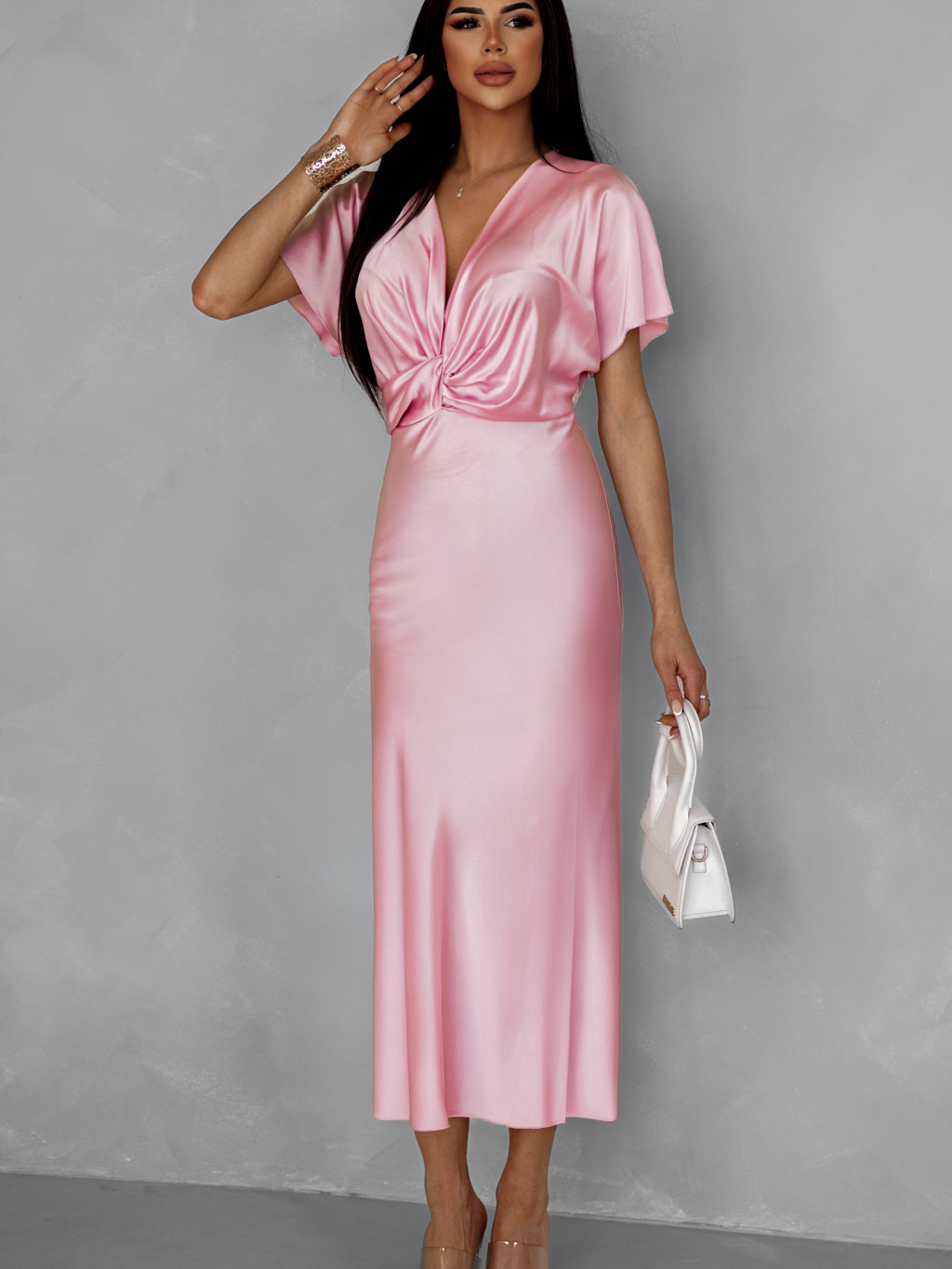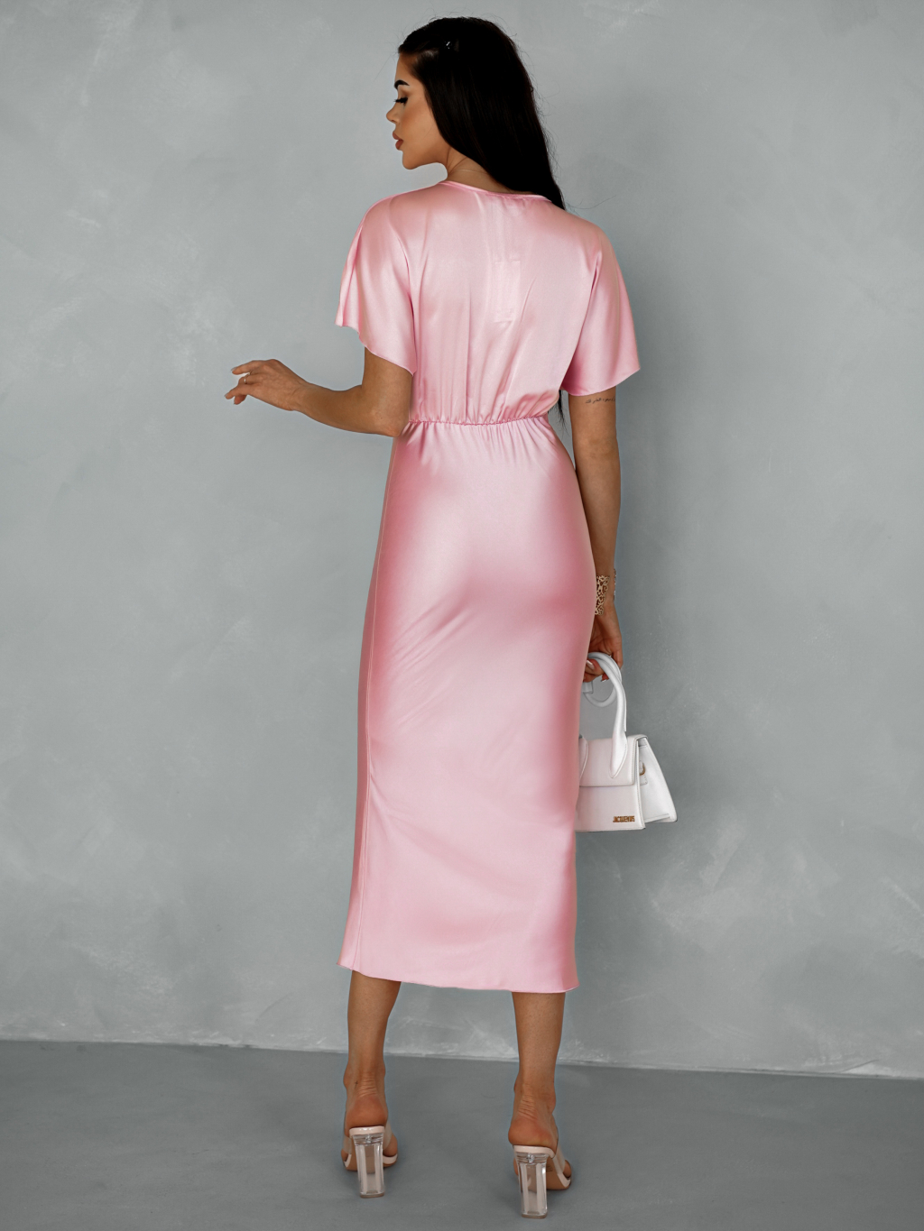Růžové saténové midi šaty MIRIAM s krátkým rukávem
