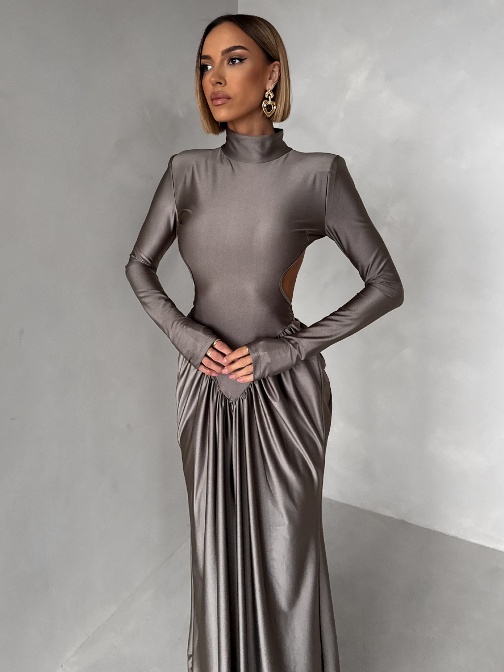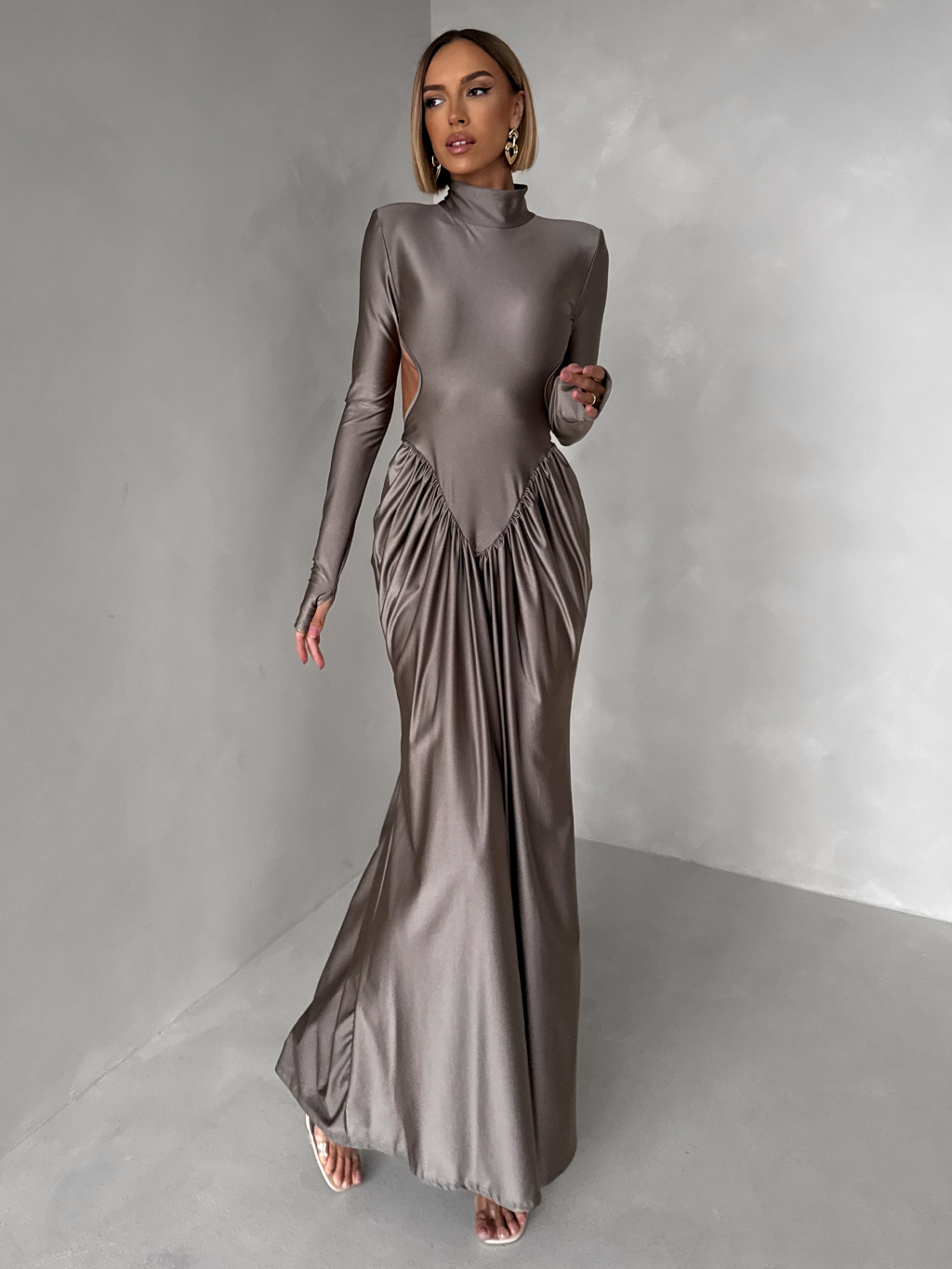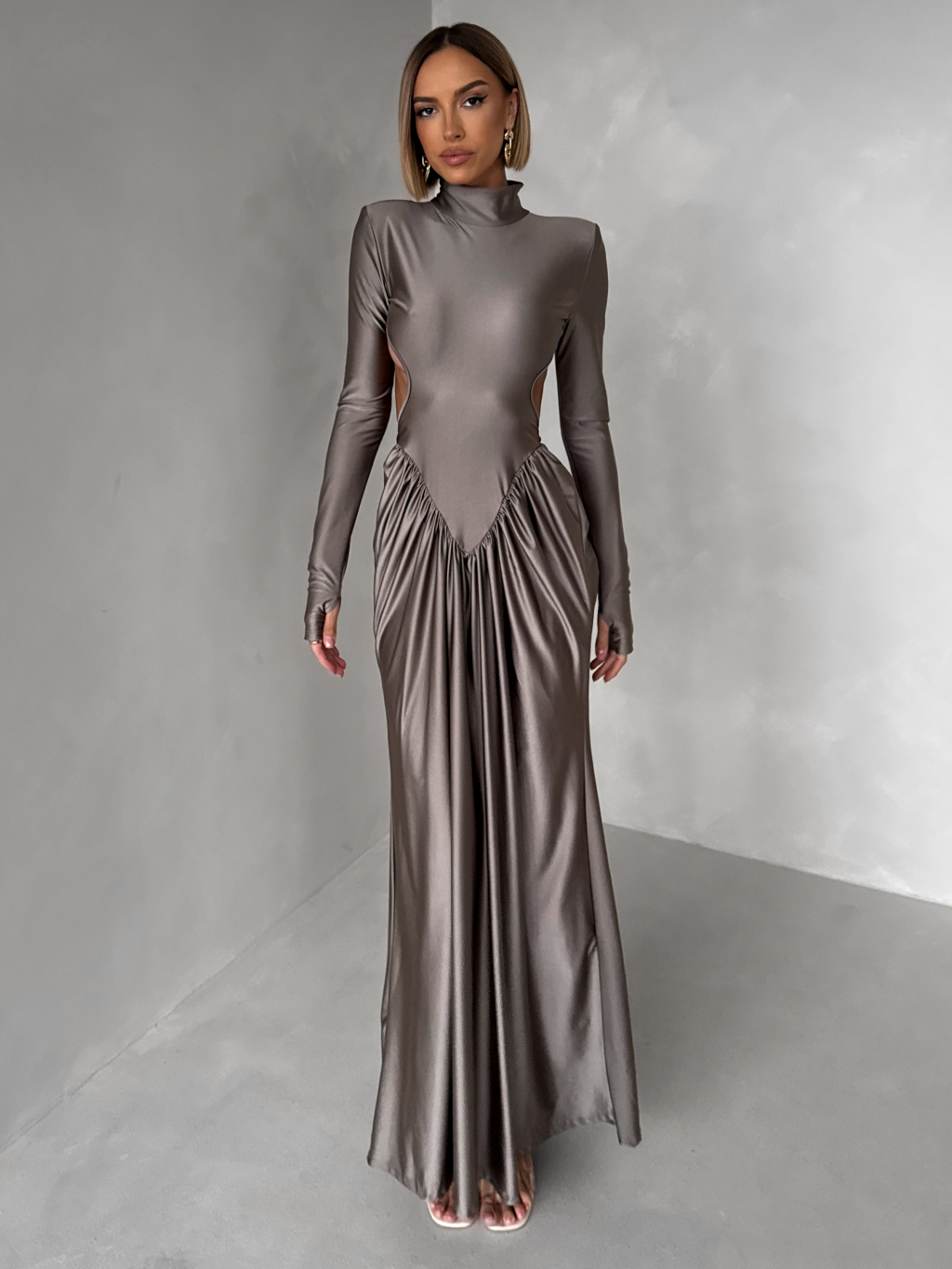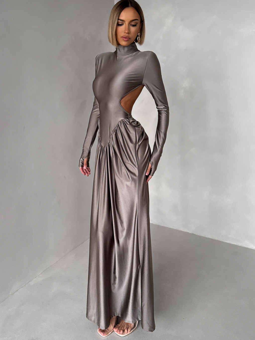 Šedé společenské tvarující šaty RELANIO s průstřihy
