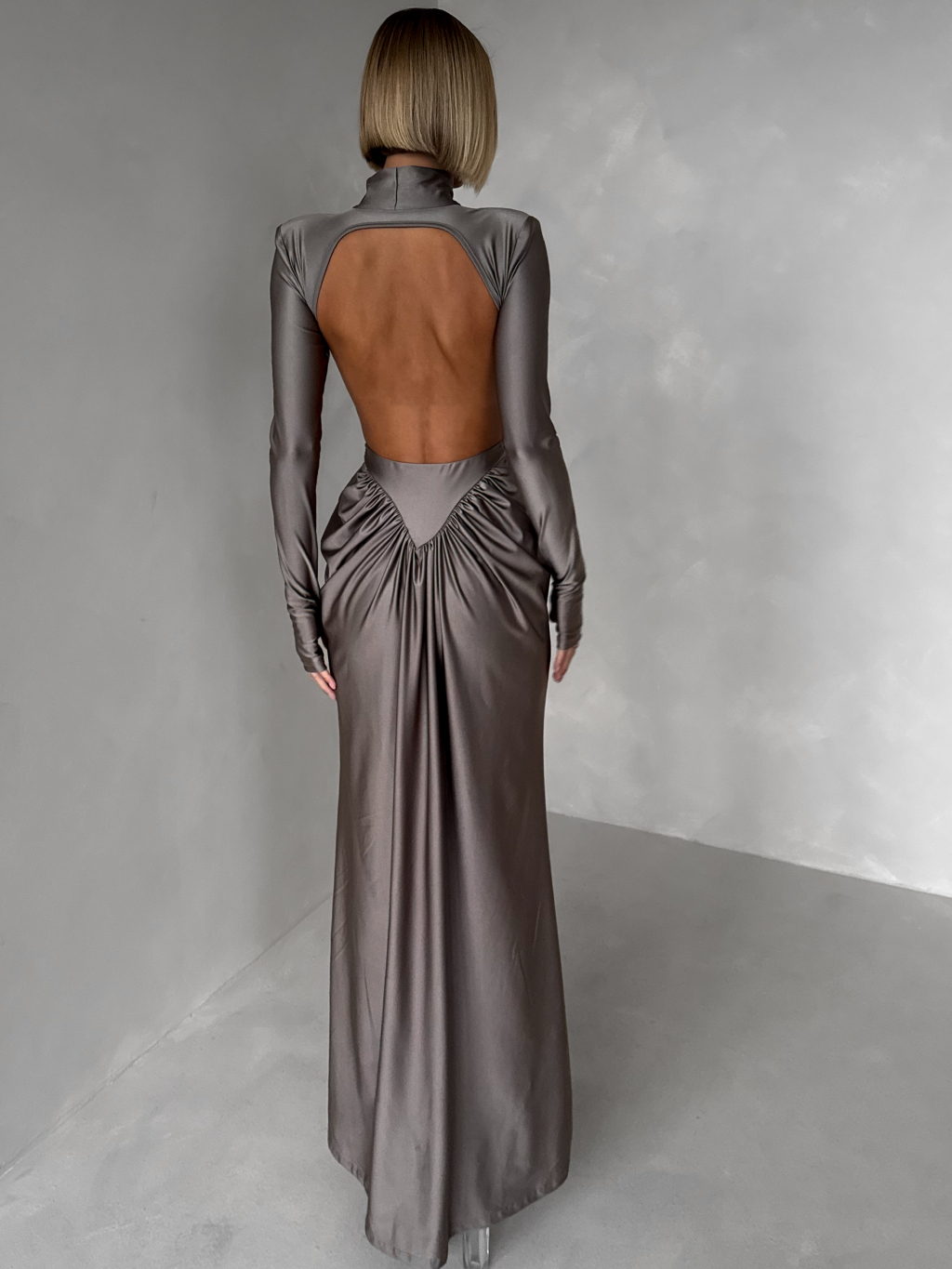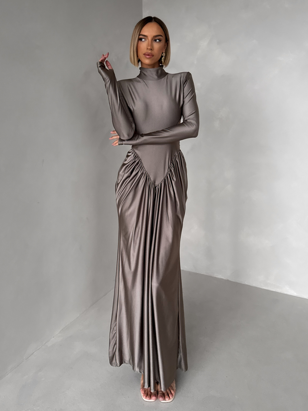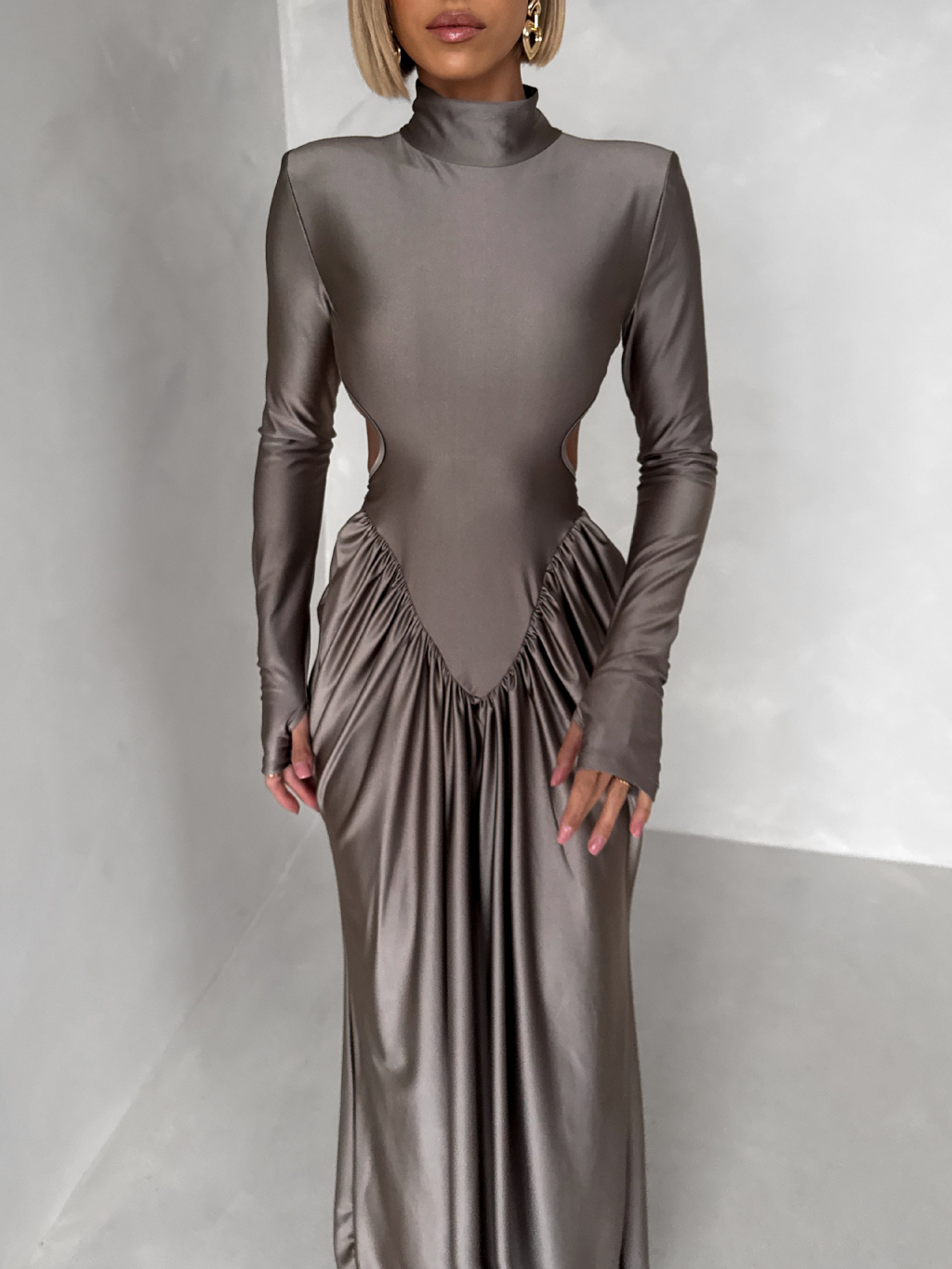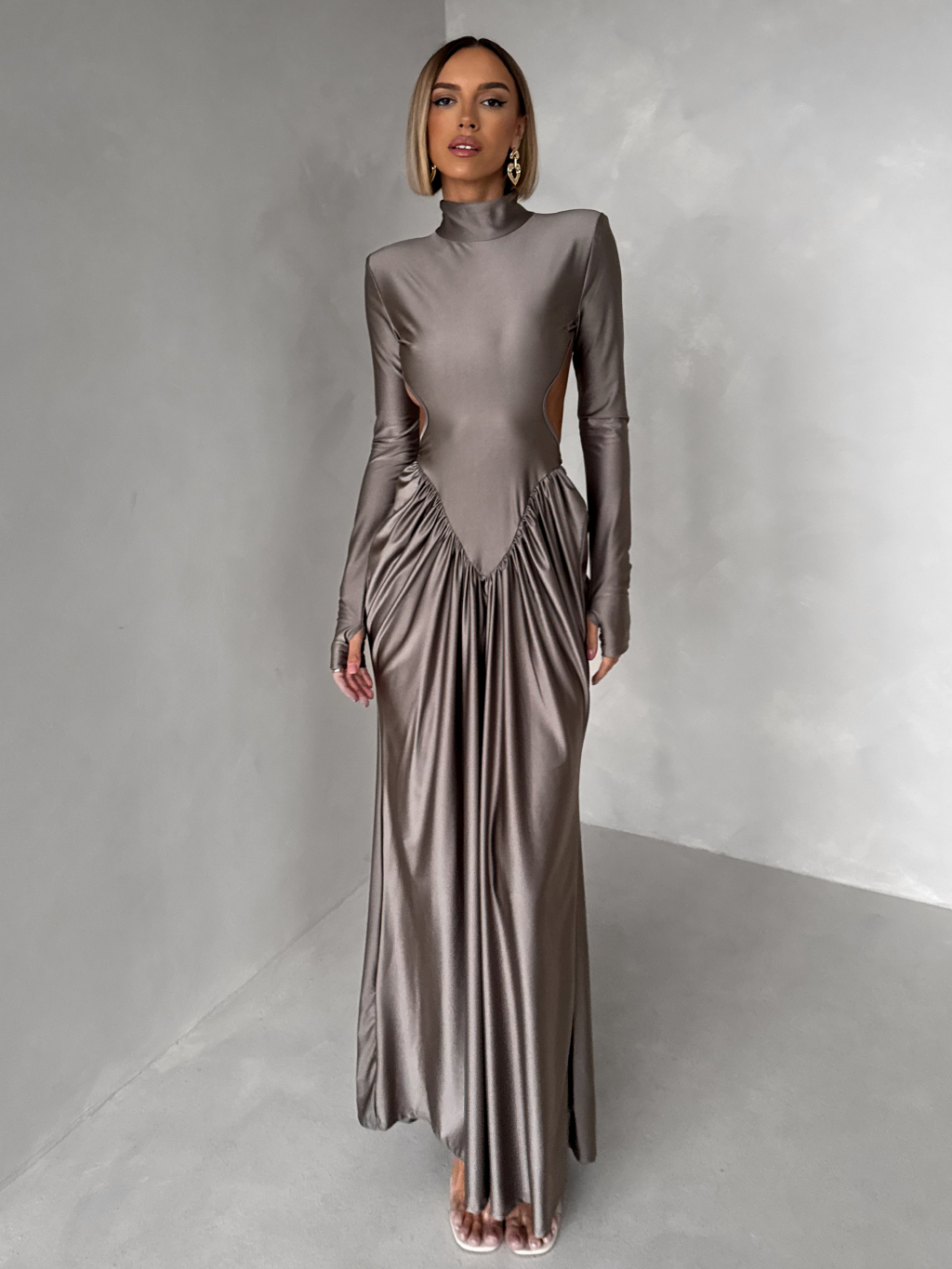 Šedé společenské tvarující šaty RELANIO s průstřihy