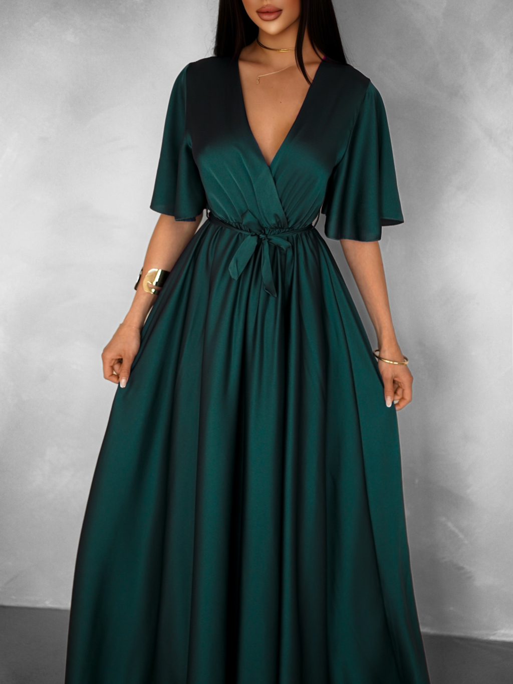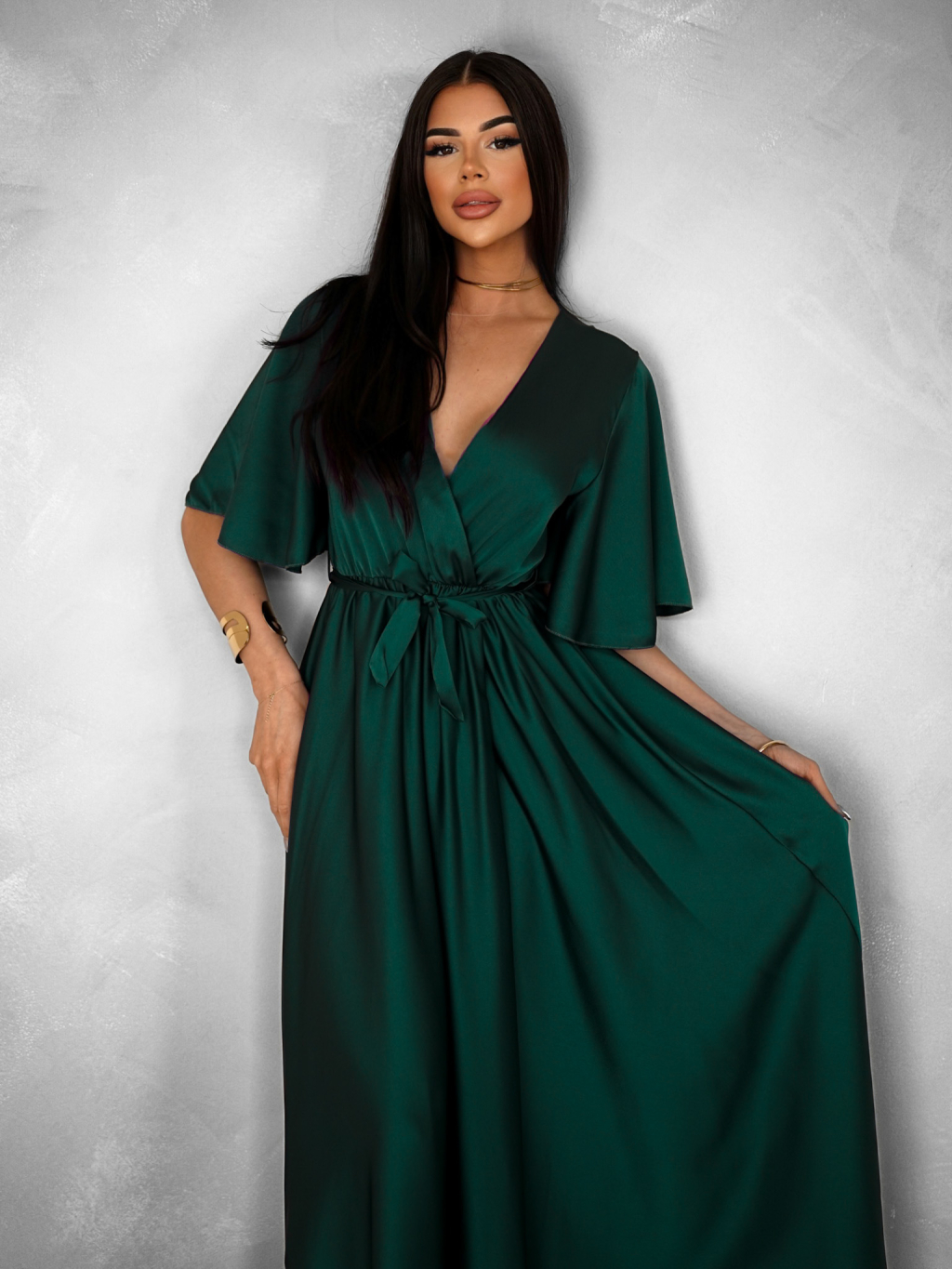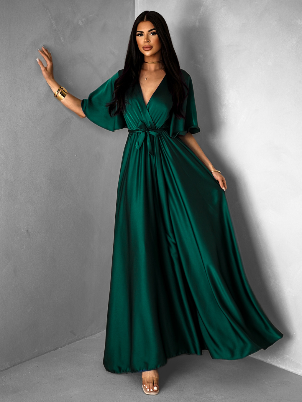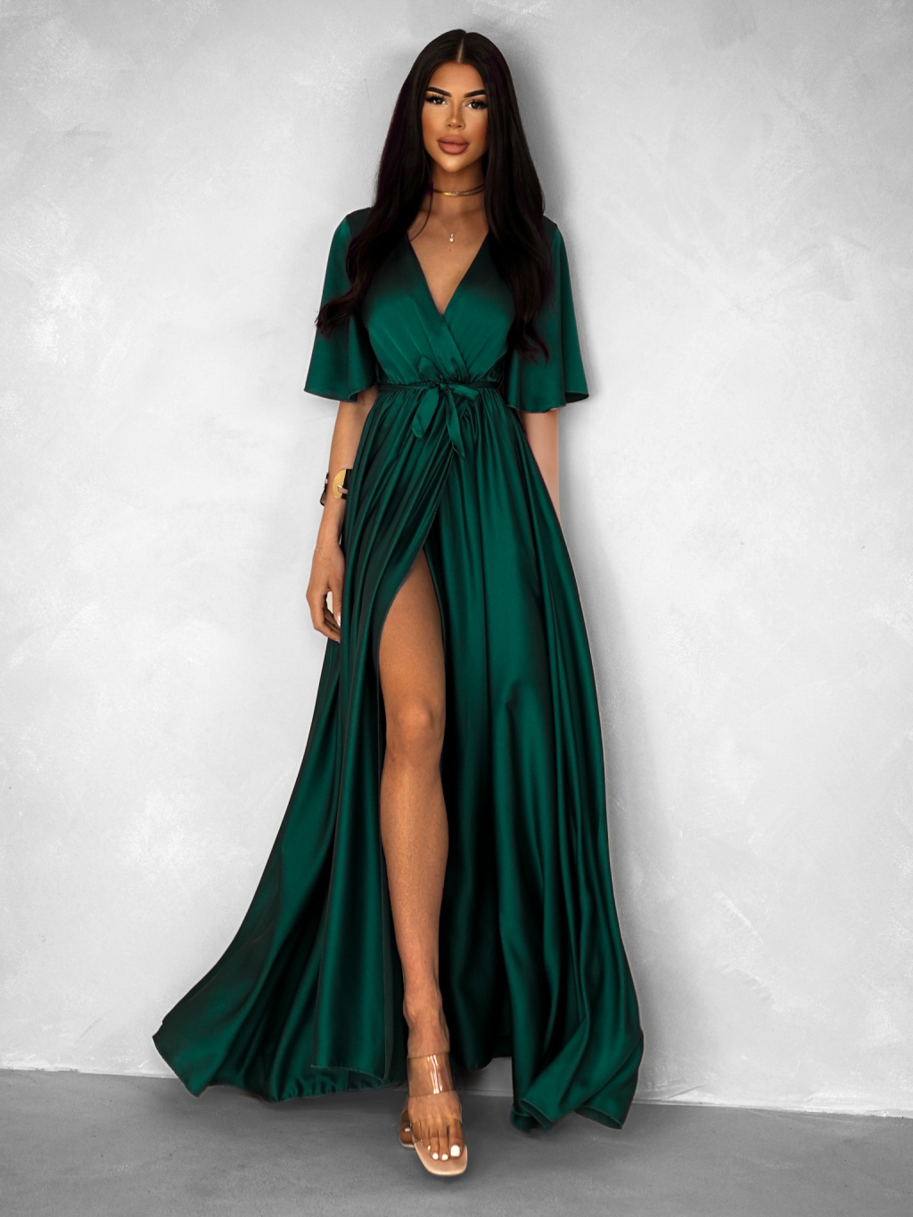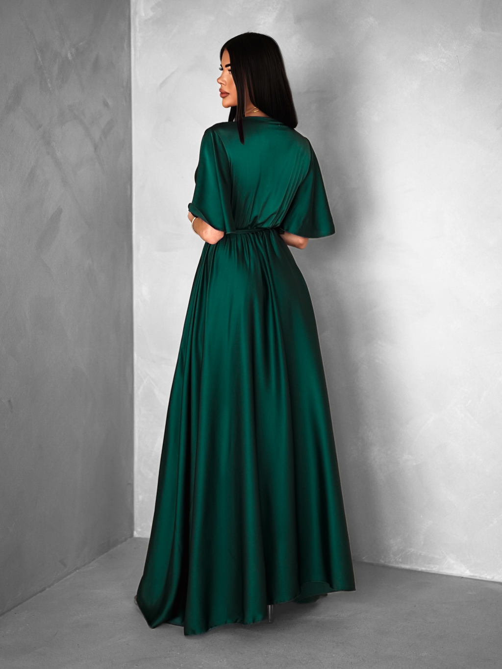 Smaragdové saténové dlouhé šaty GO HOME s výstřihem