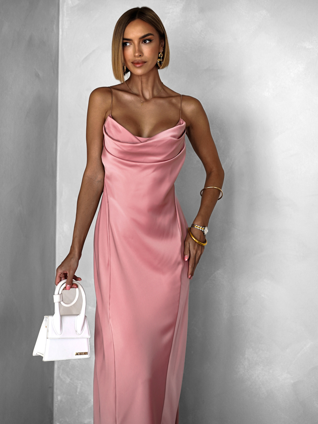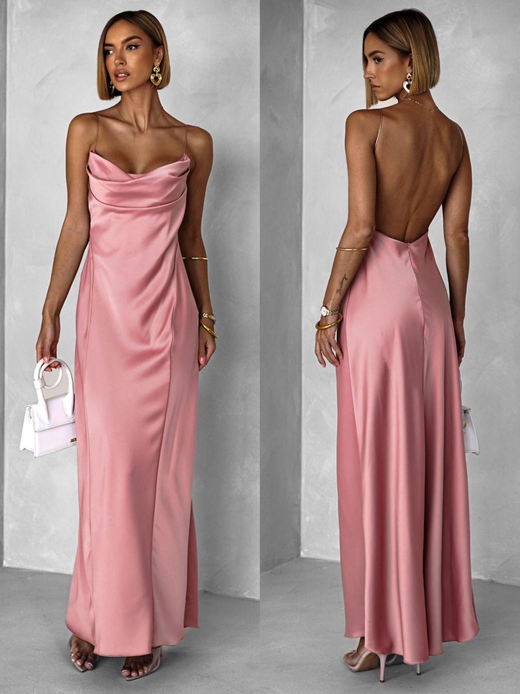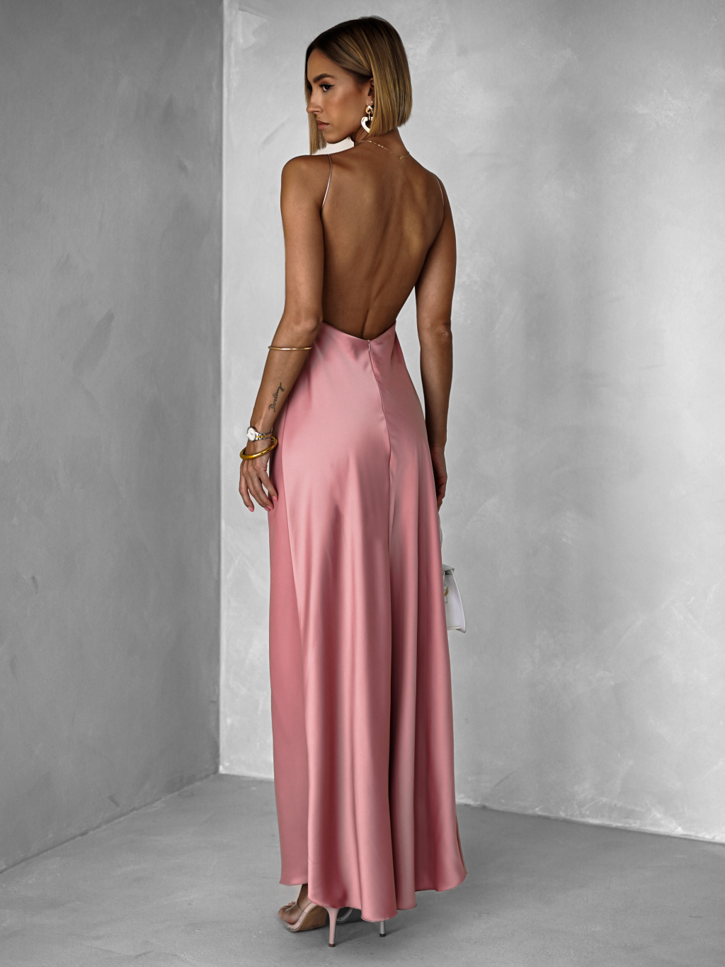 Starorůžové dlouhé saténové šaty UNUTA s odhalenými zády