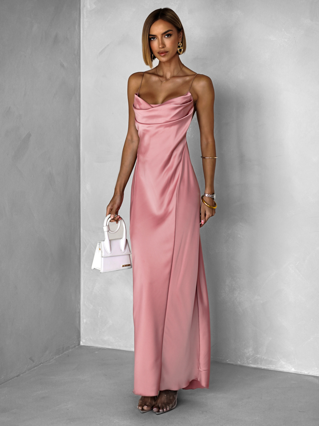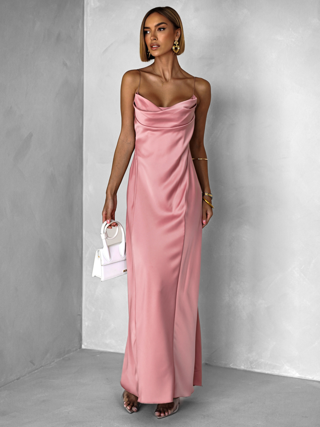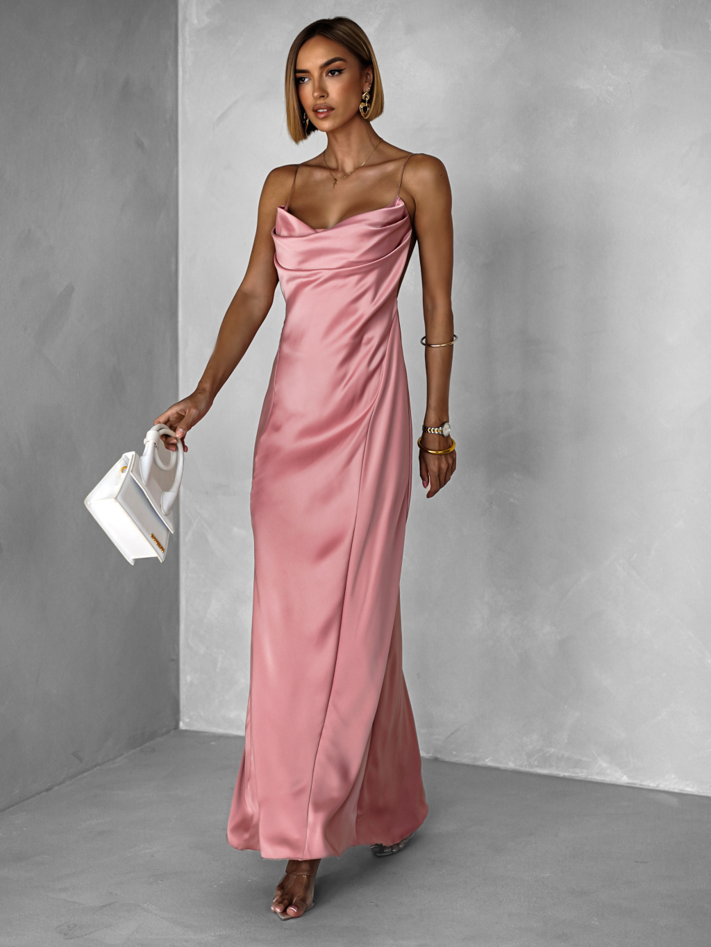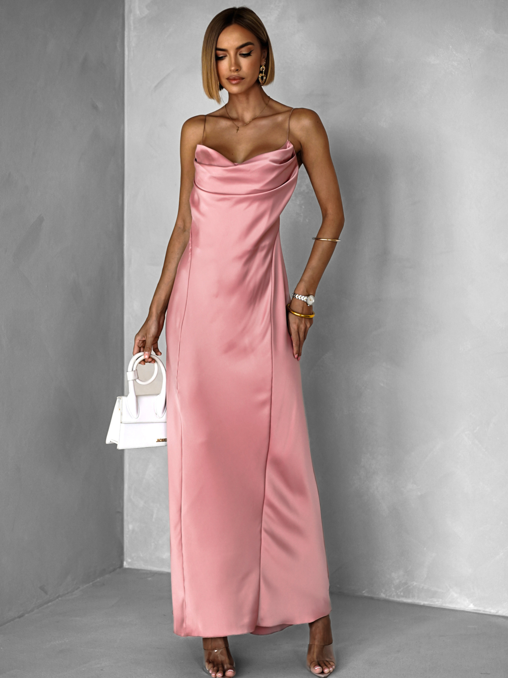 Starorůžové dlouhé saténové šaty UNUTA s odhalenými zády