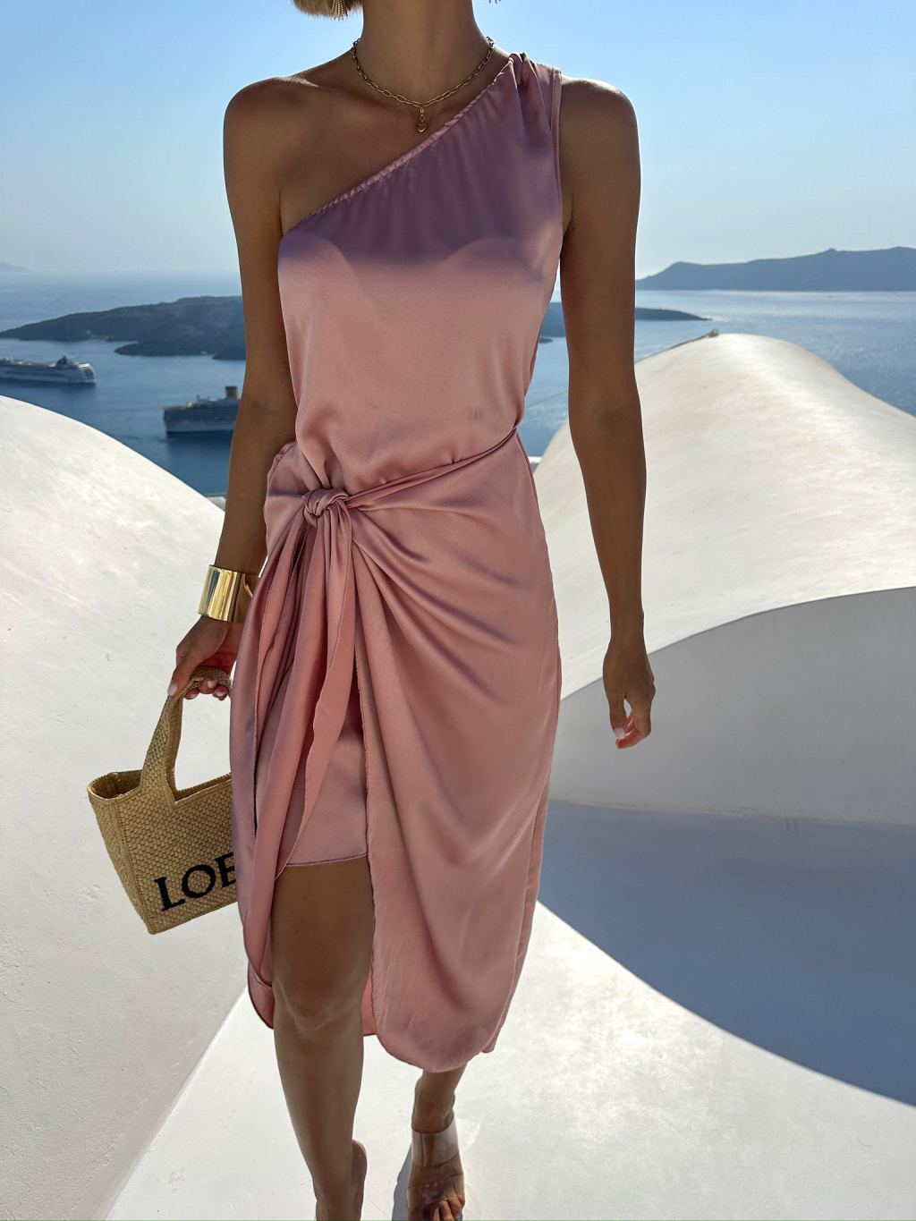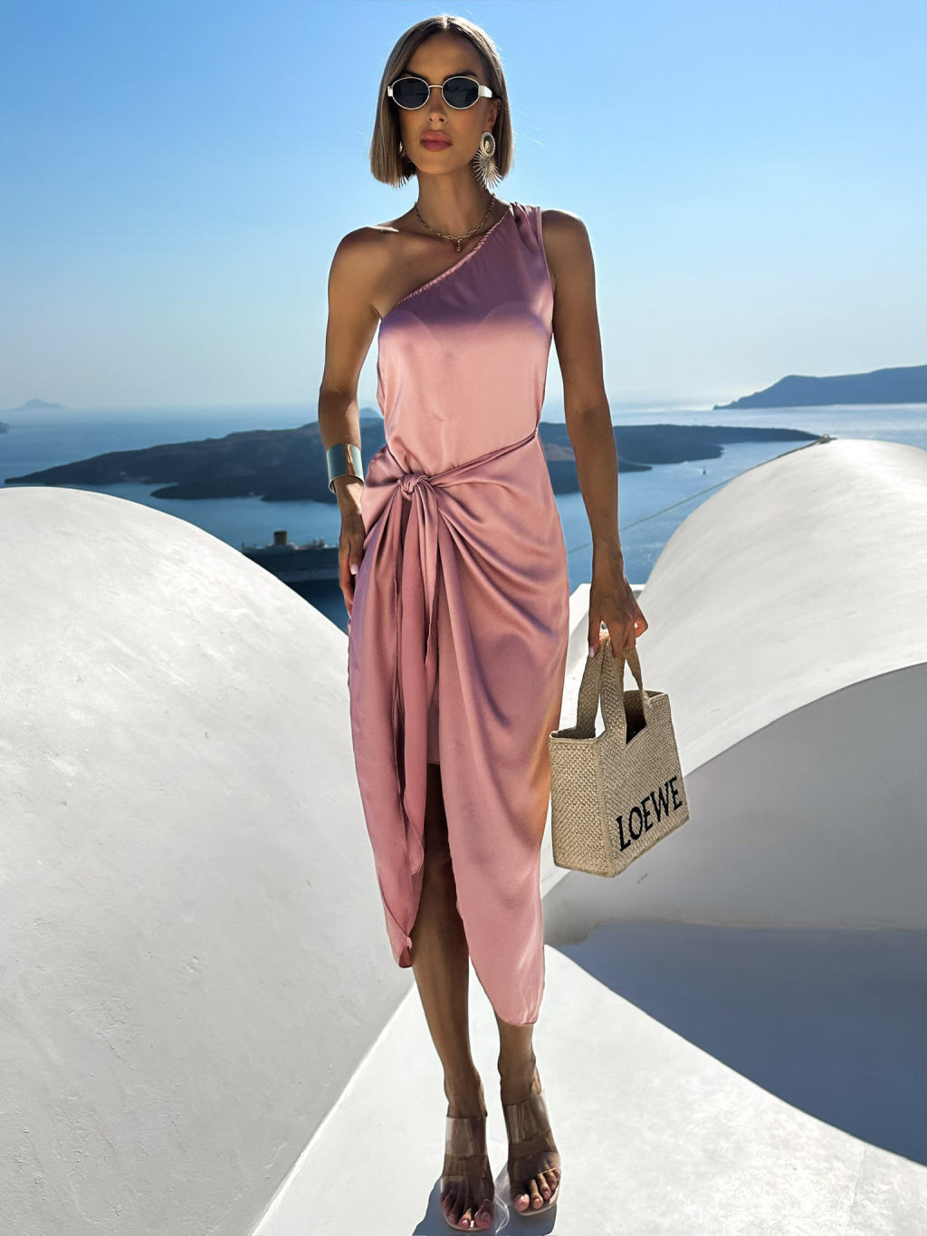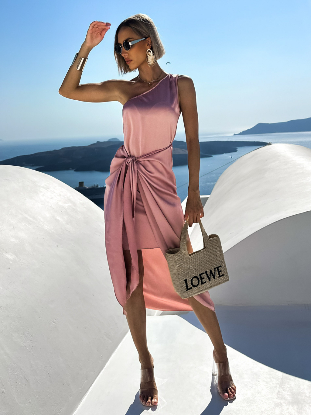 Starorůžové saténové elegantní šaty LIBIOSI na jedno rameno