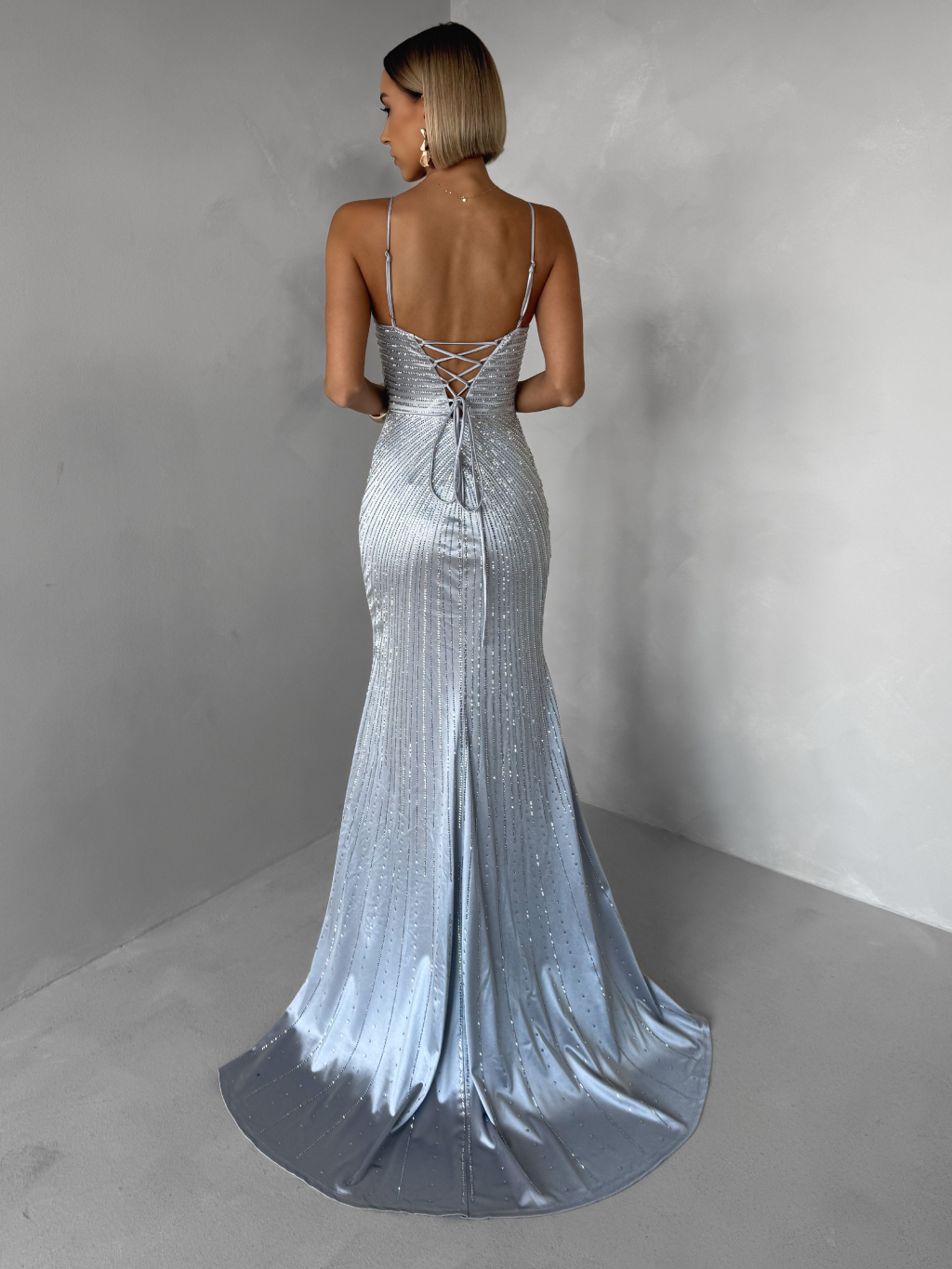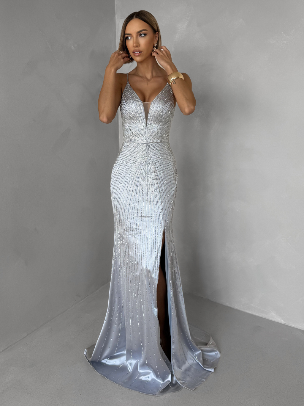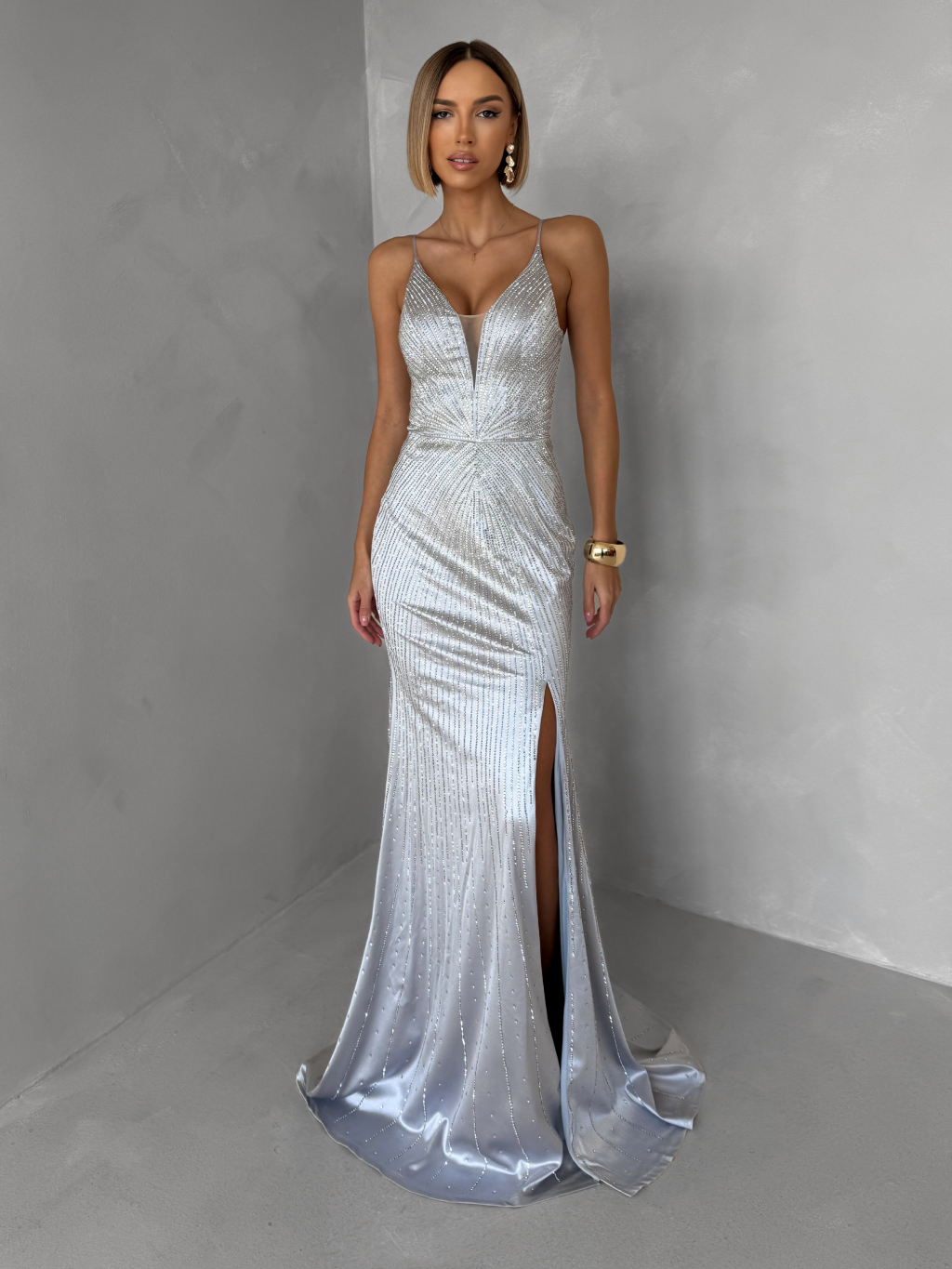 Stříbrné plesové třpytivé šaty RAVELLE s rozparkem