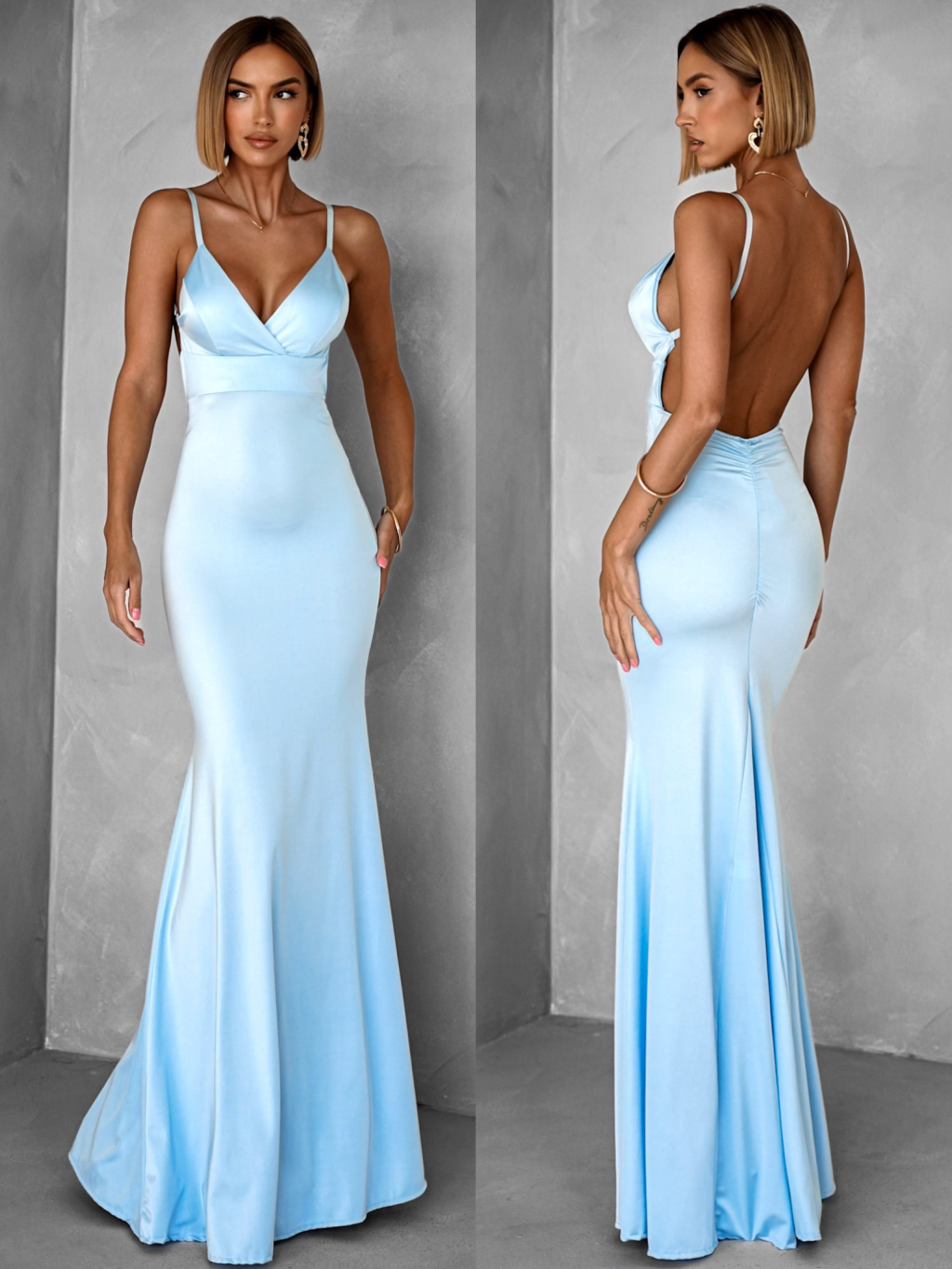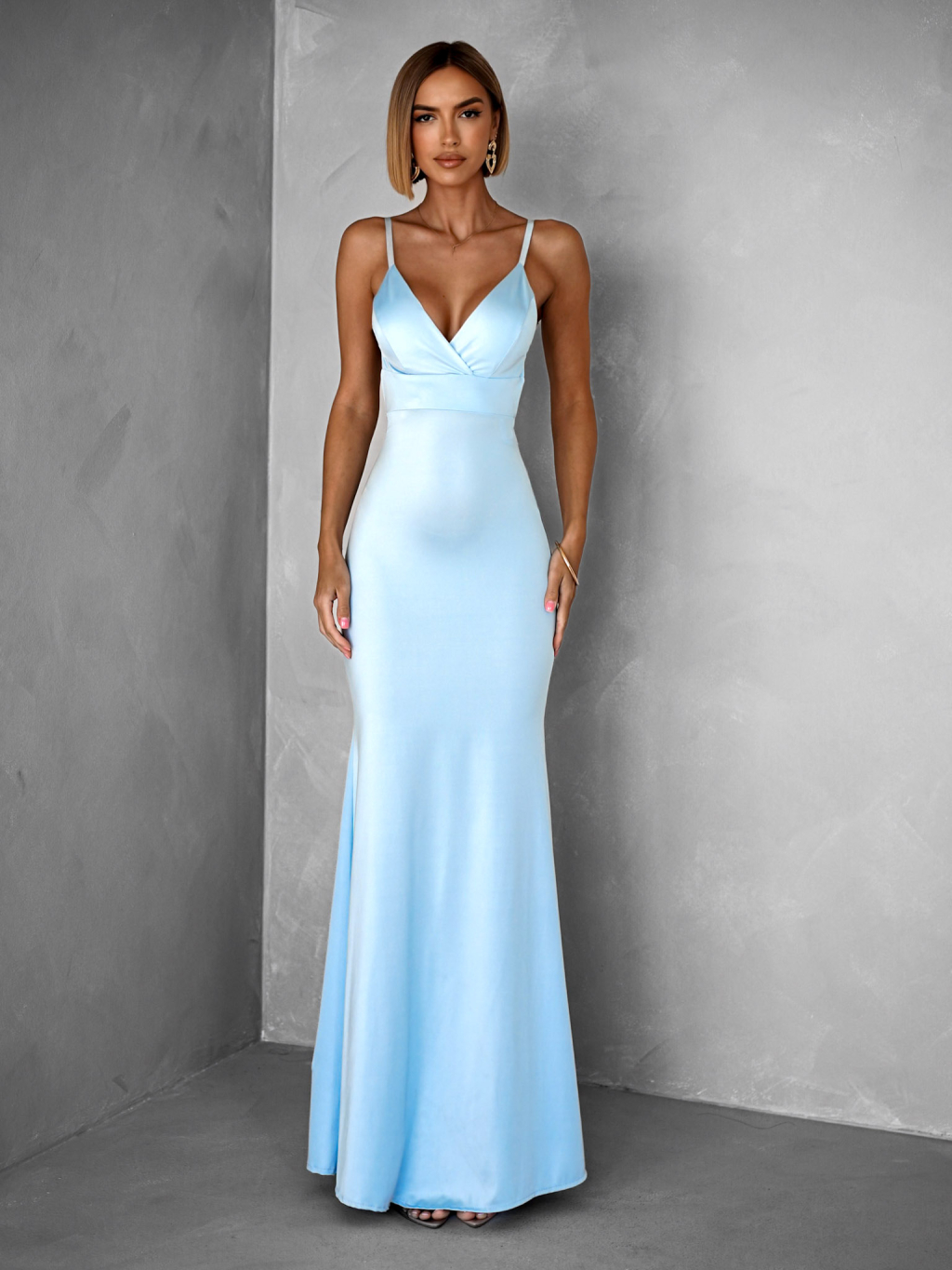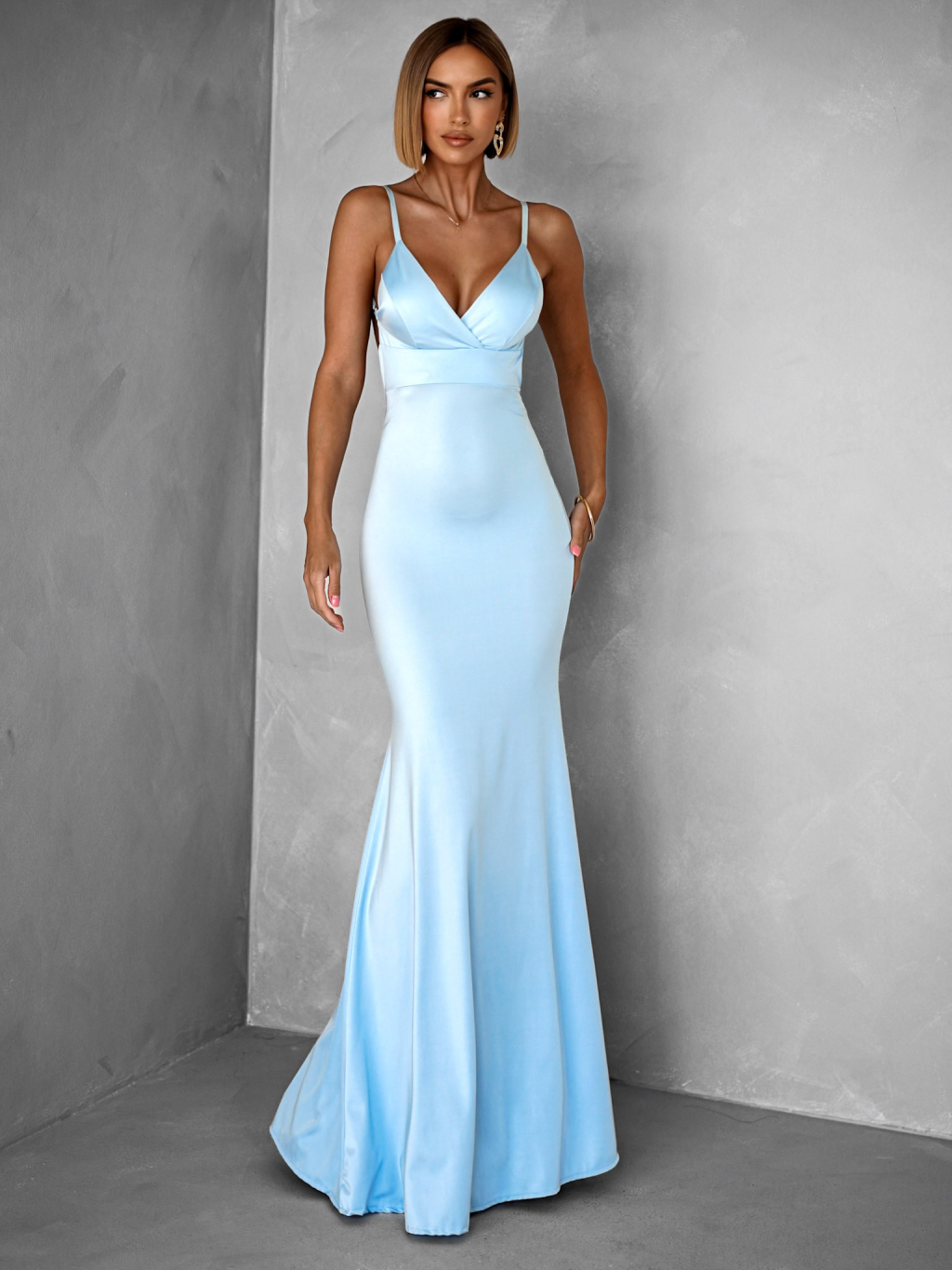 Světle modré dlouhé saténové šaty MARSELLE s odhalenými zády