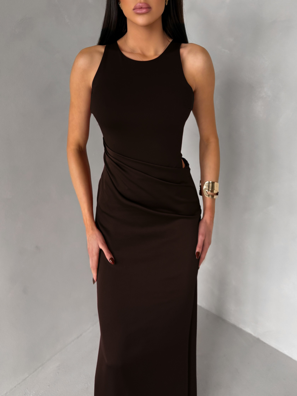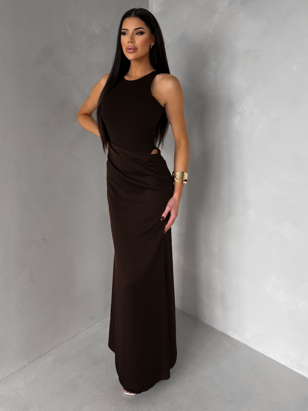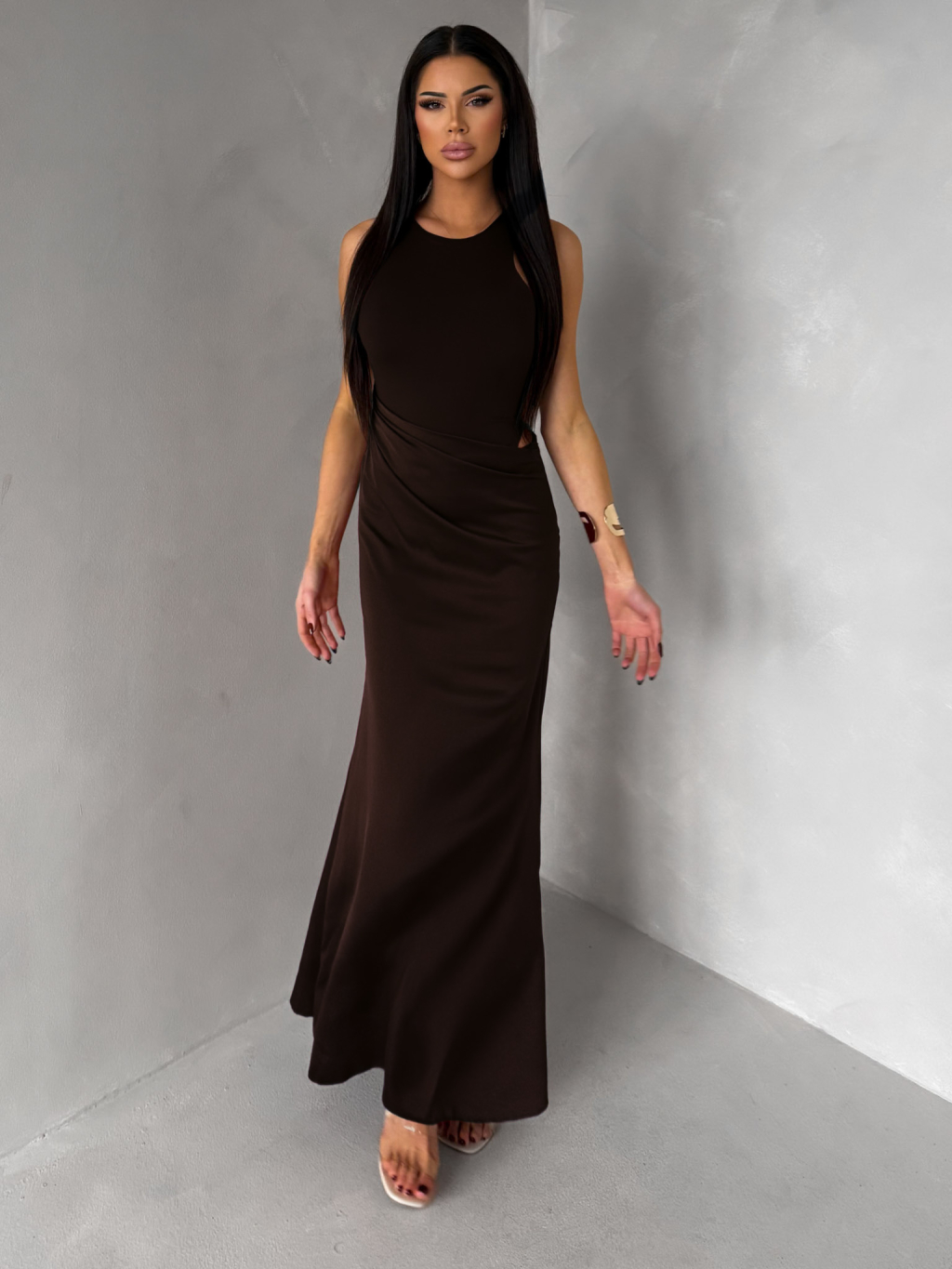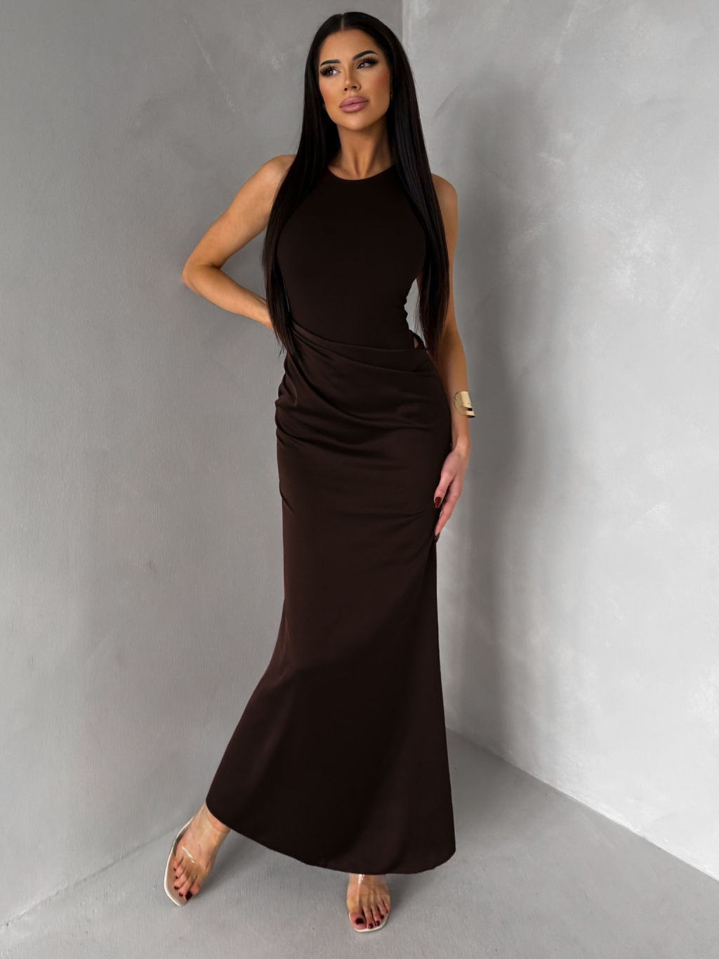 Tmavě hnědé elegantní saténové šaty VELMORO s body