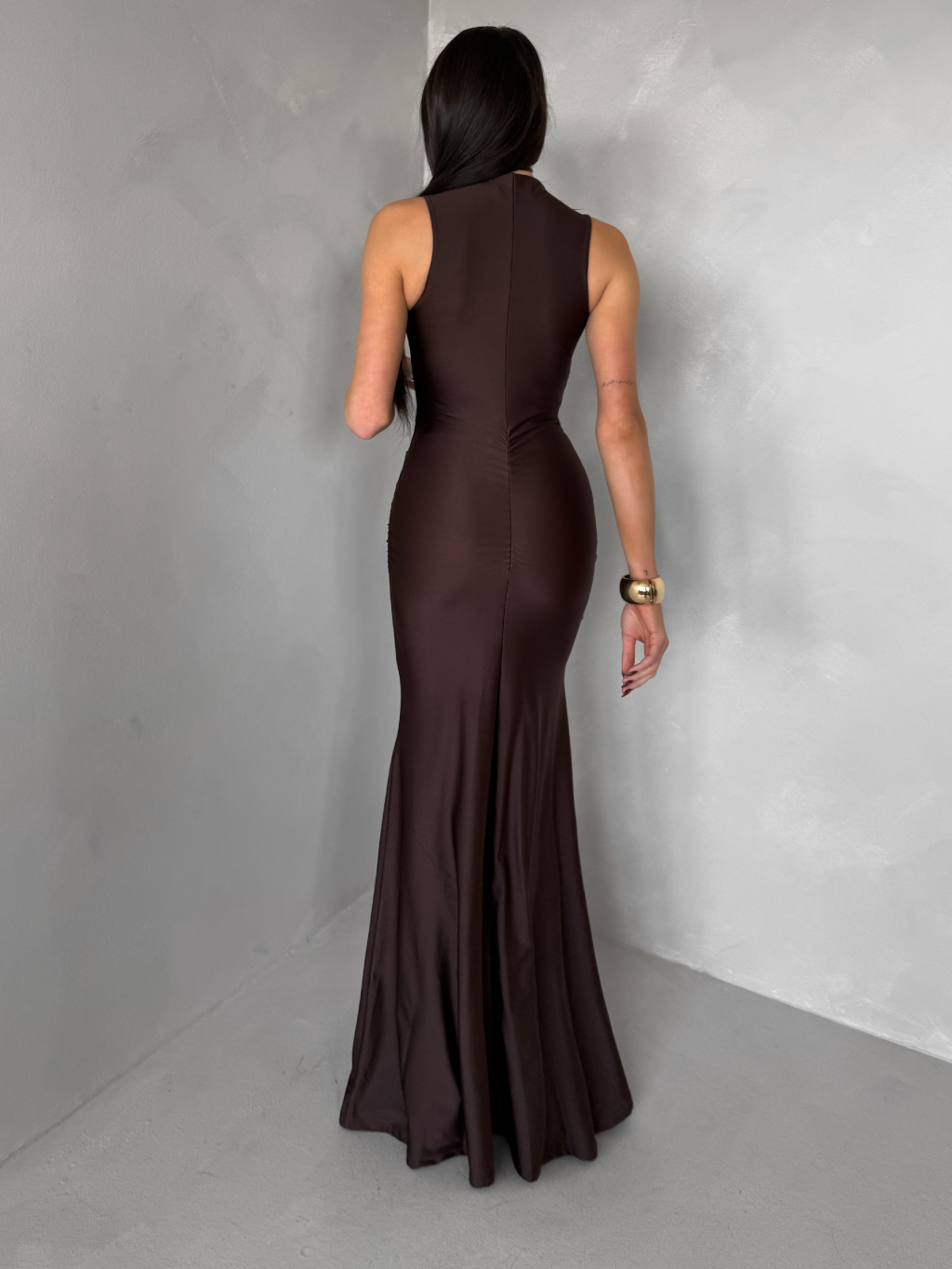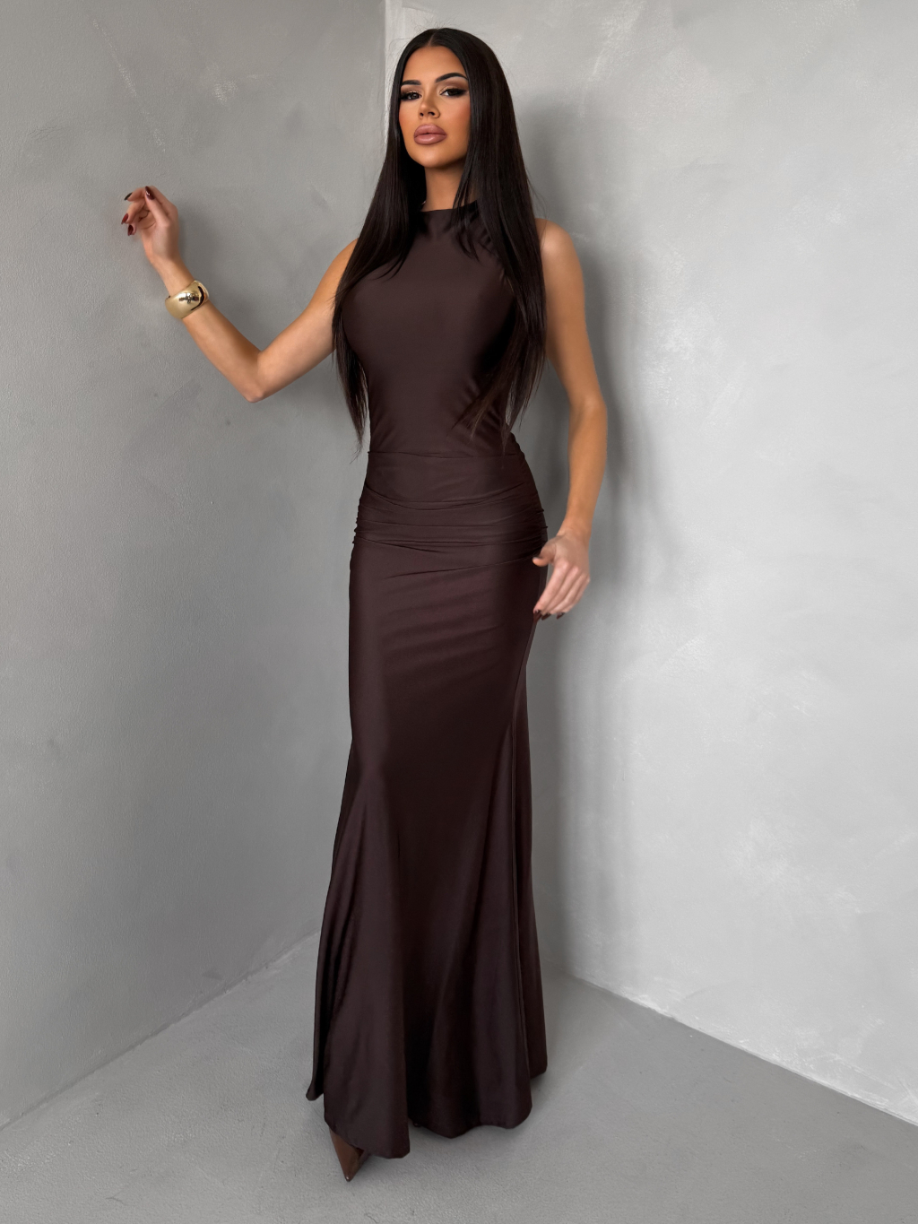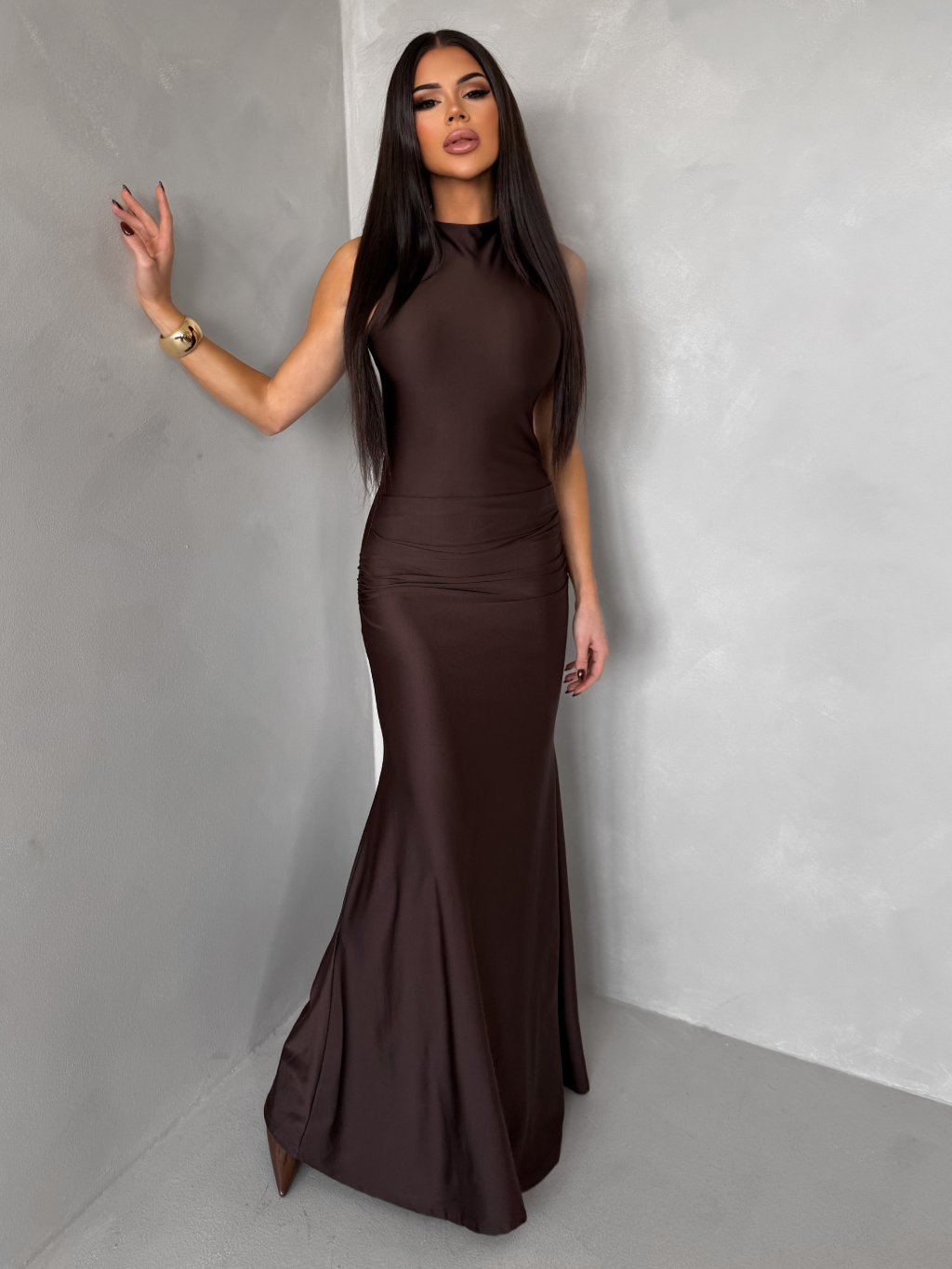 Tmavě hnědé saténové dlouhé společenské šaty LETERA s řasením