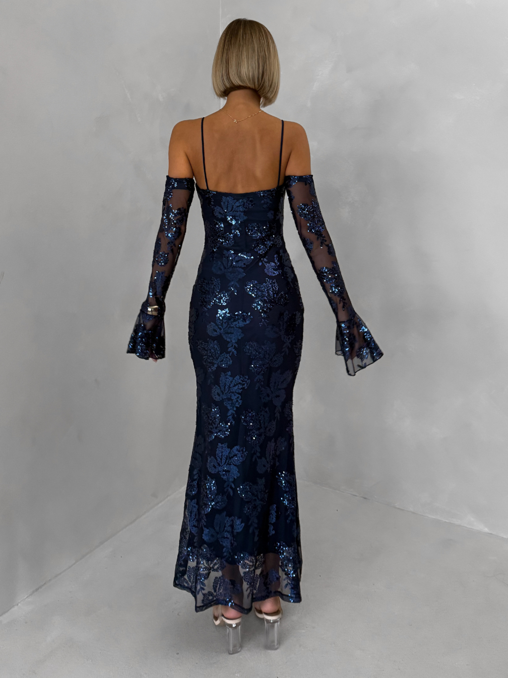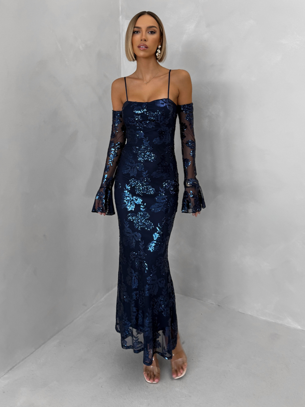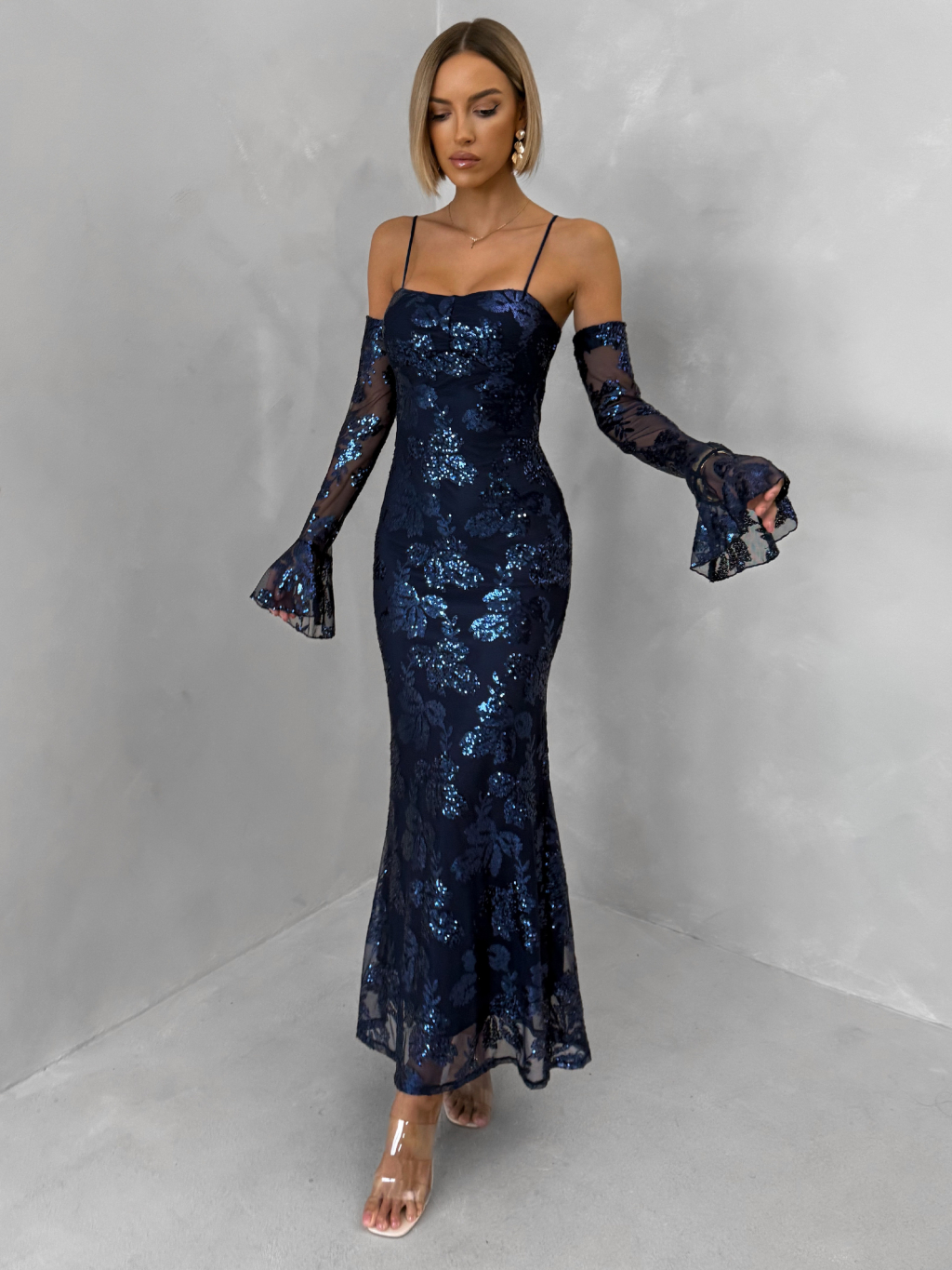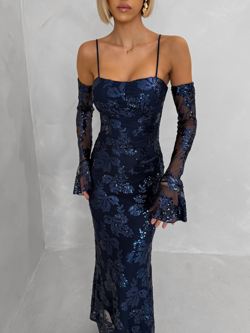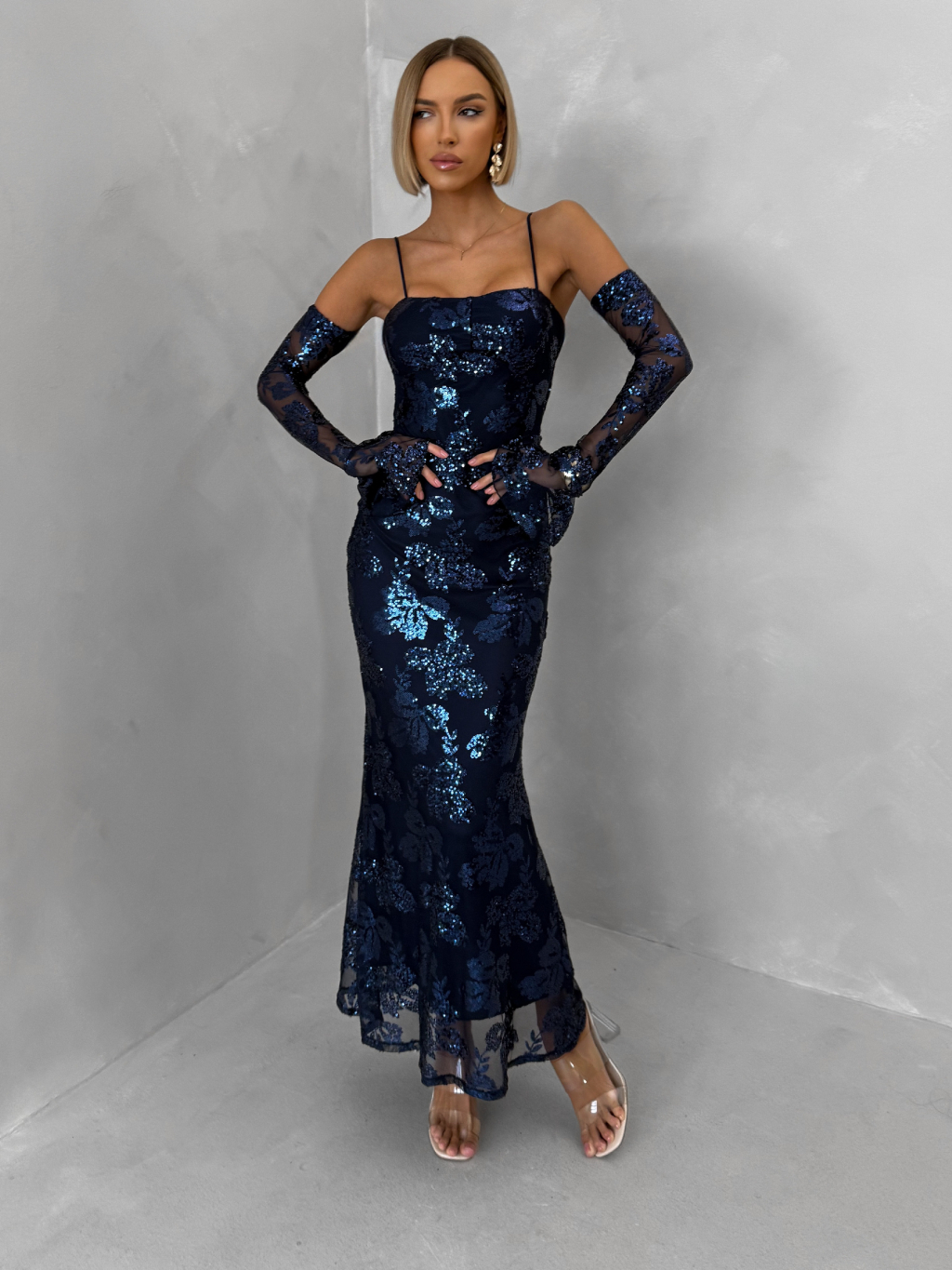 Tmavě modré elegantní třpytivé šaty LARKINO s rukávky
