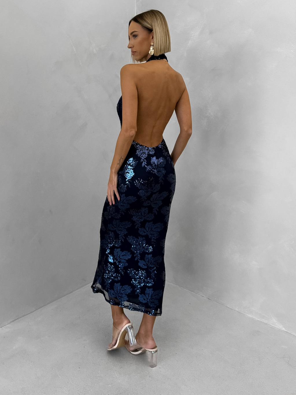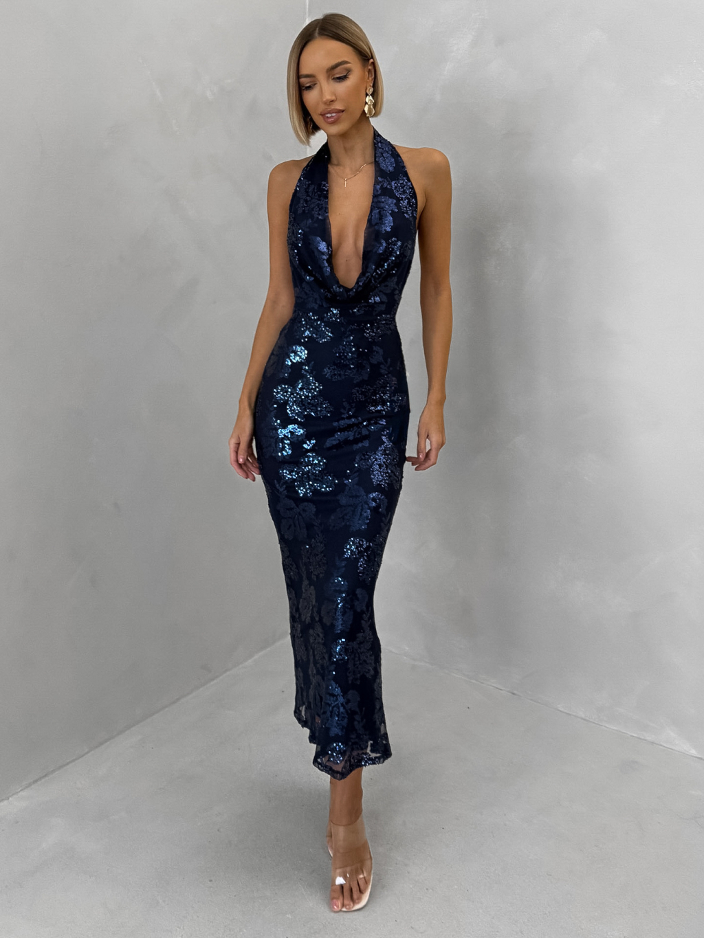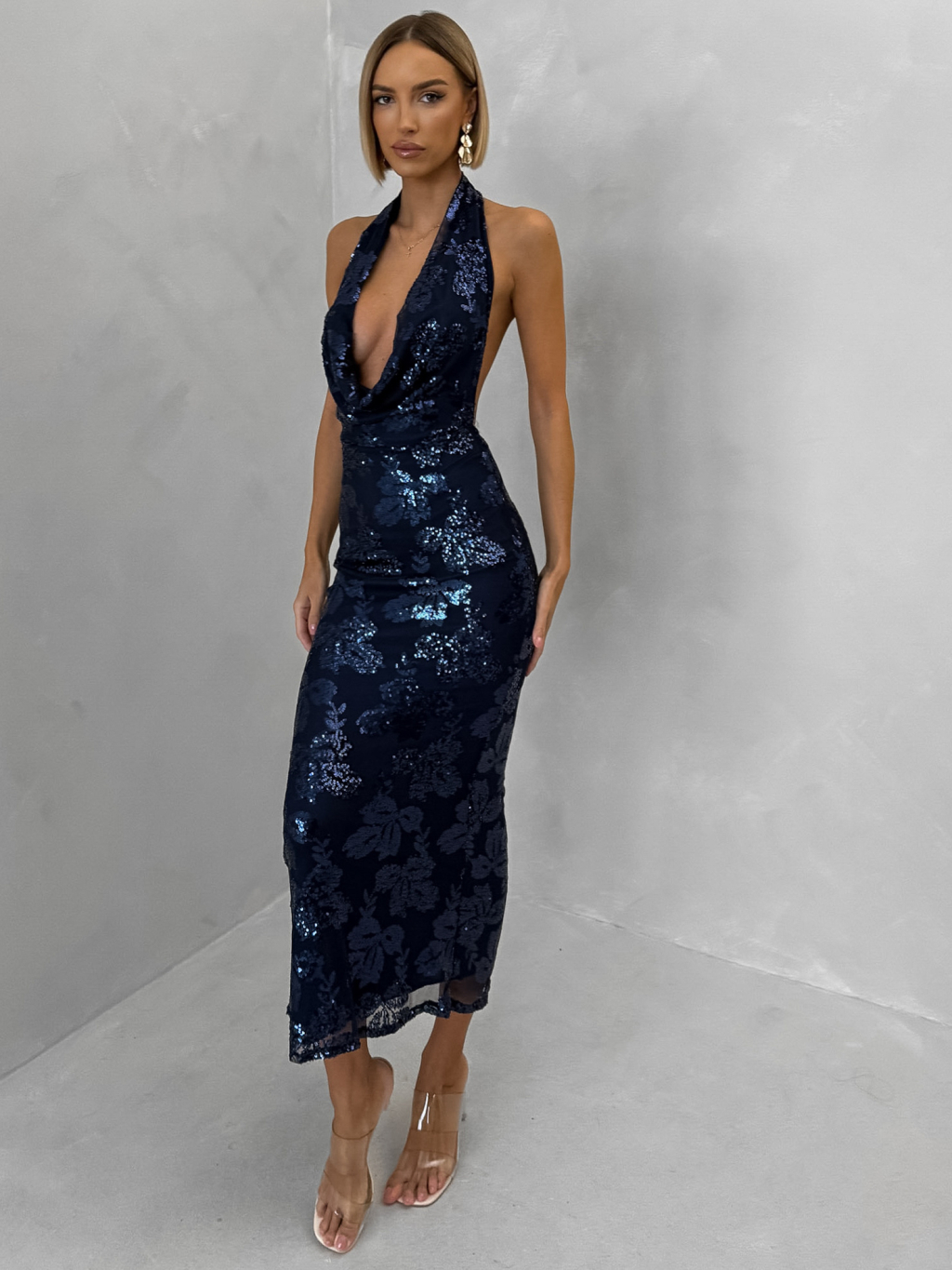 Tmavě modré třpytivé společenské šaty ZUNETRA s výstřihem
