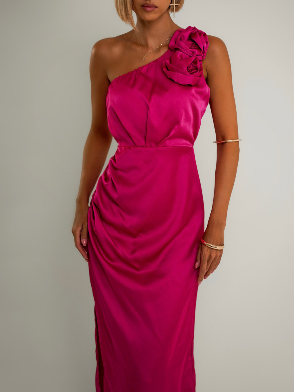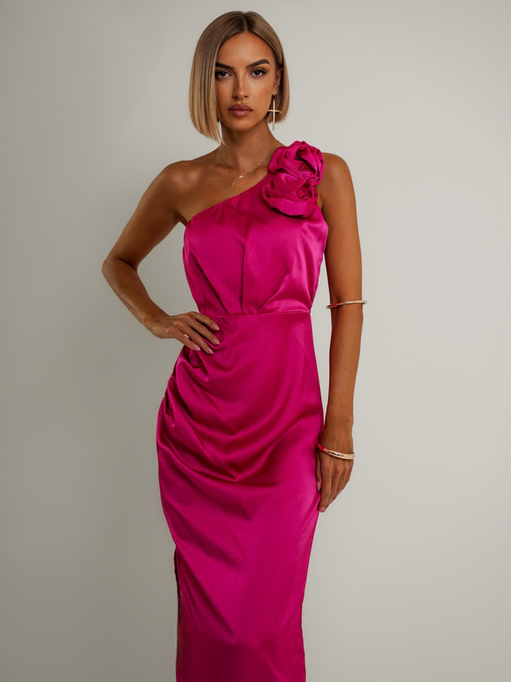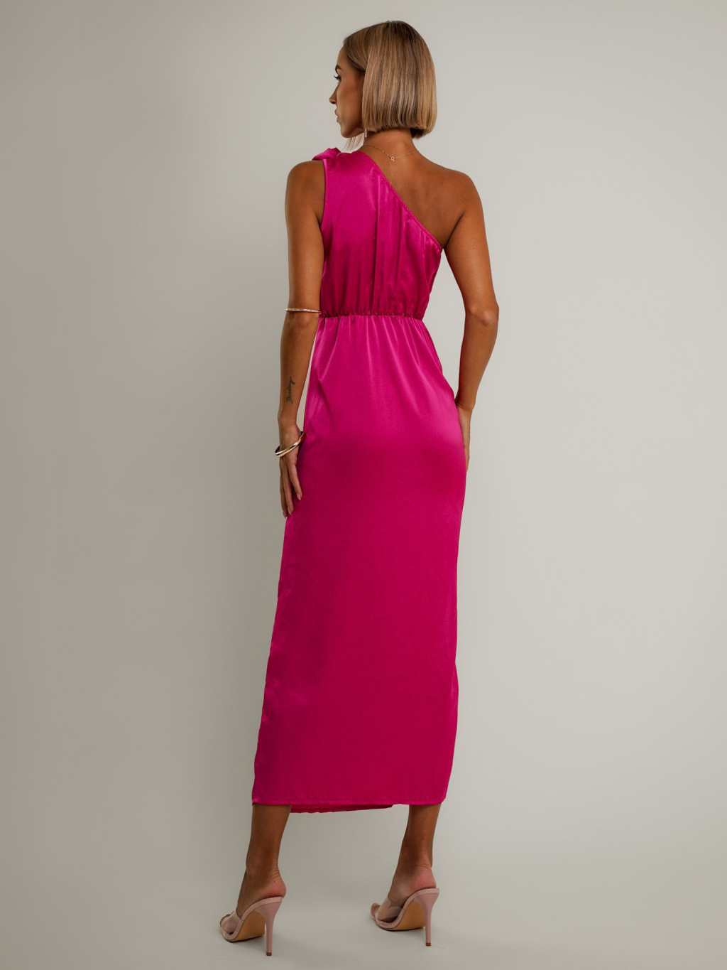 Tmavě růžové asymetrické saténové šaty ROULES