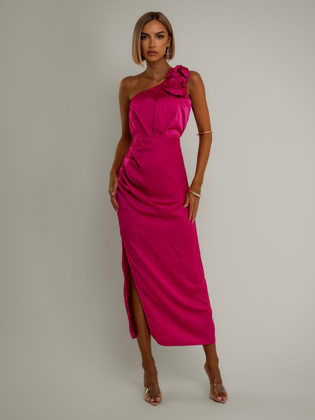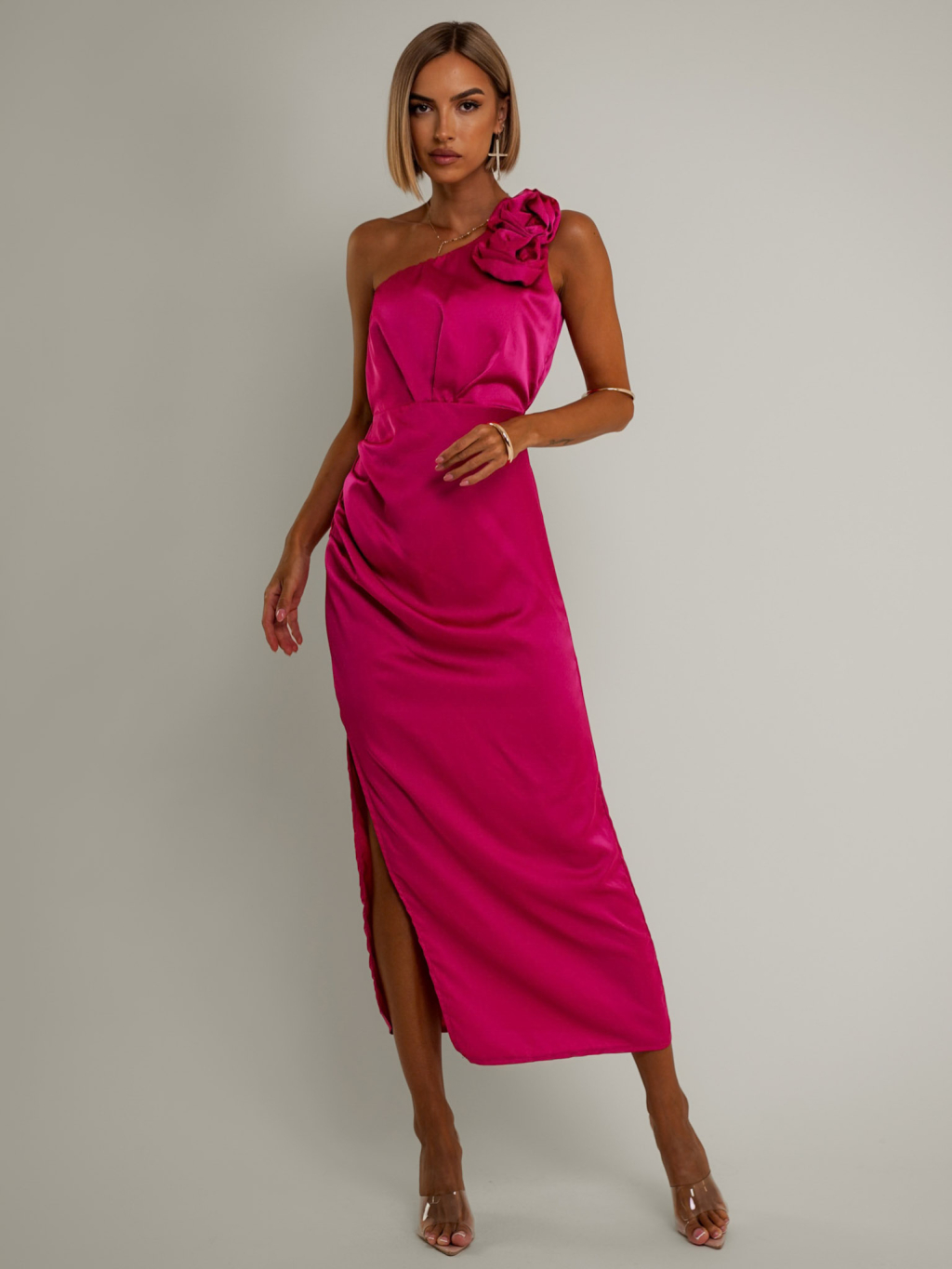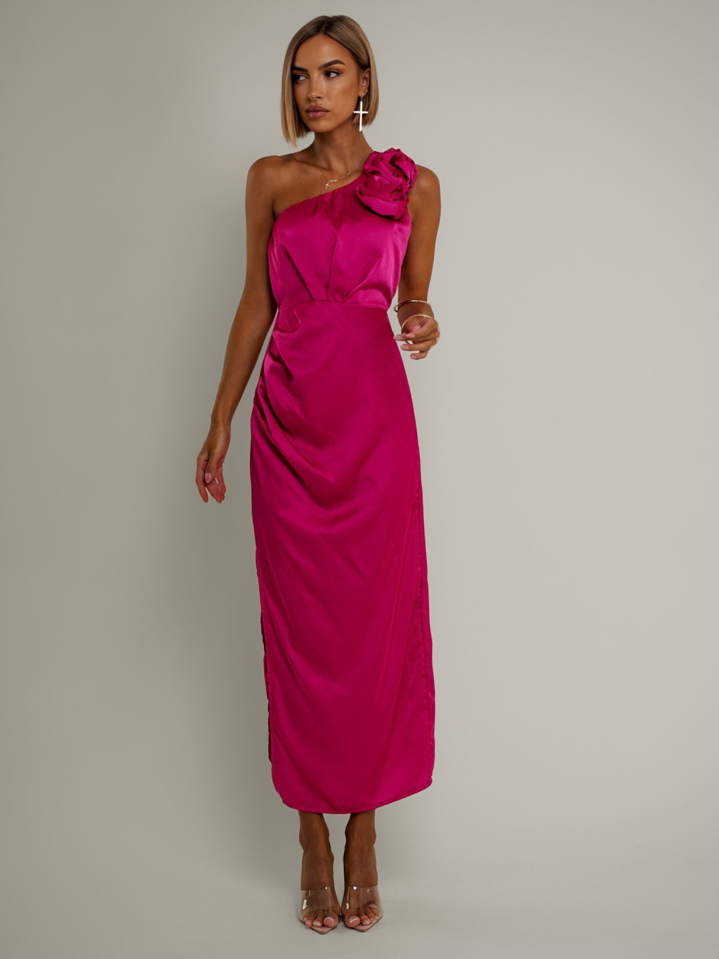 Tmavě růžové asymetrické saténové šaty ROULES