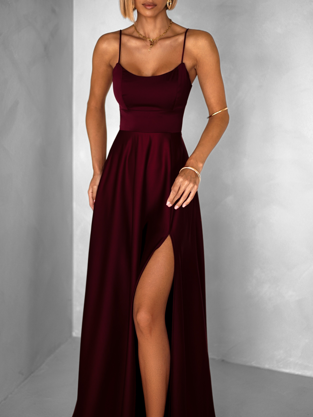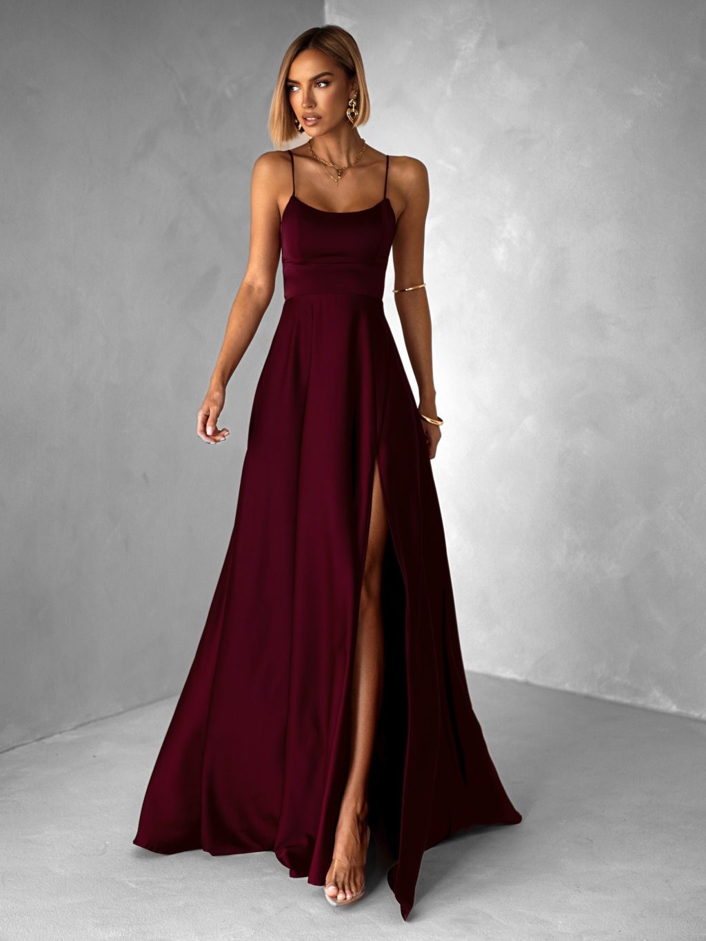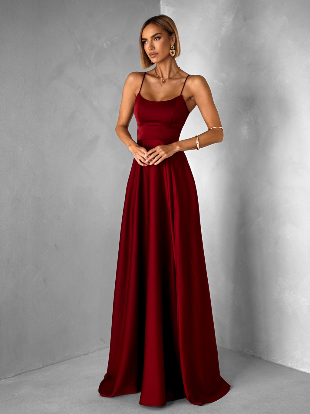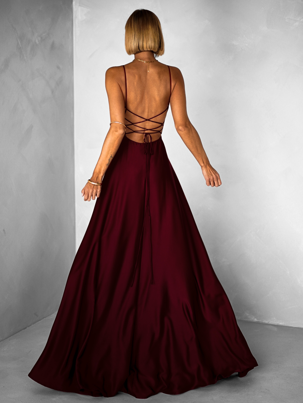 Vínové dlouhé plesové šaty CELLINES se šněrováním a rozparkem