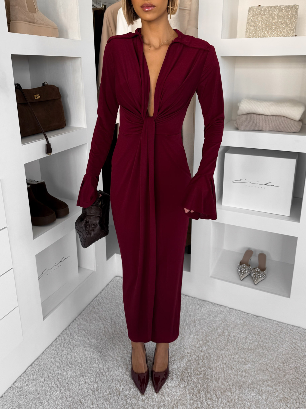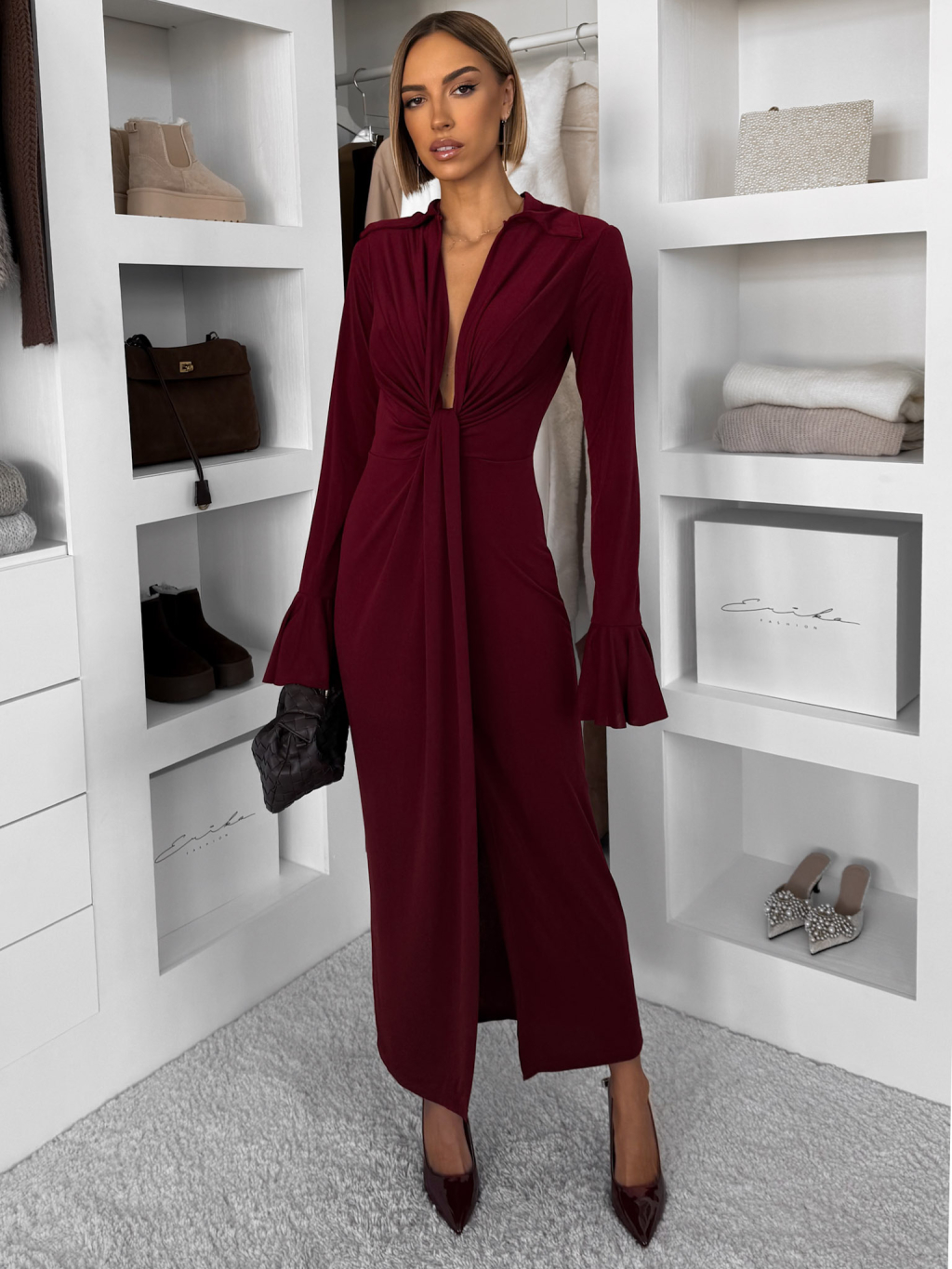Vínové dlouhé společenské šaty OSTIVEN s výstřihem