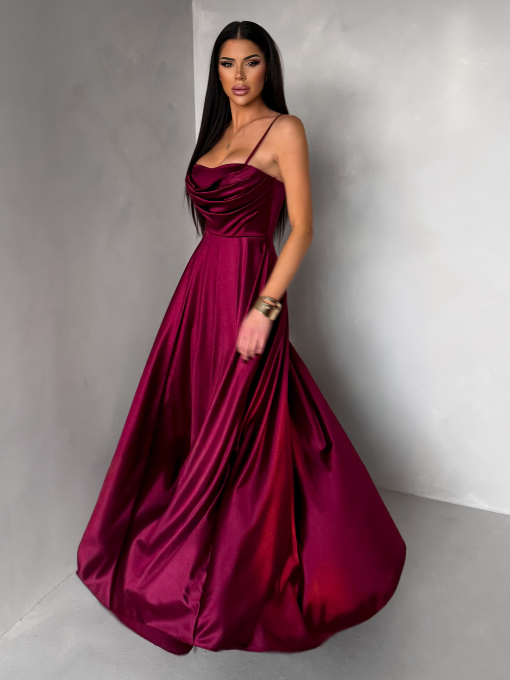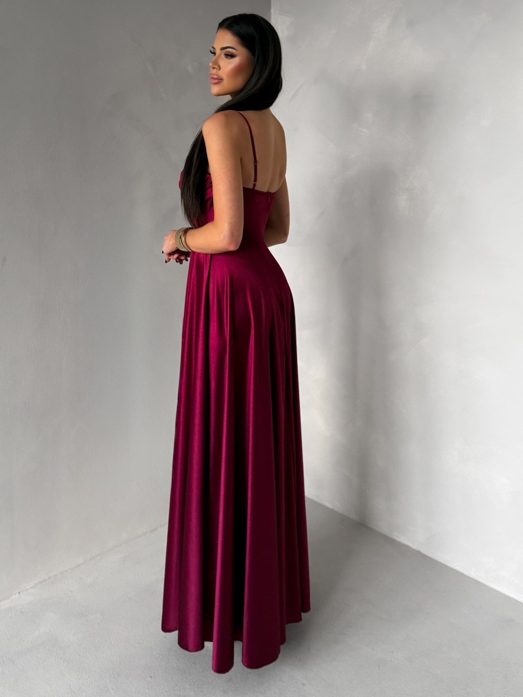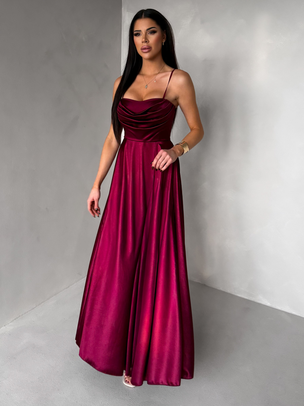 Vínové saténové dlouhé společenské šaty LUNOREX