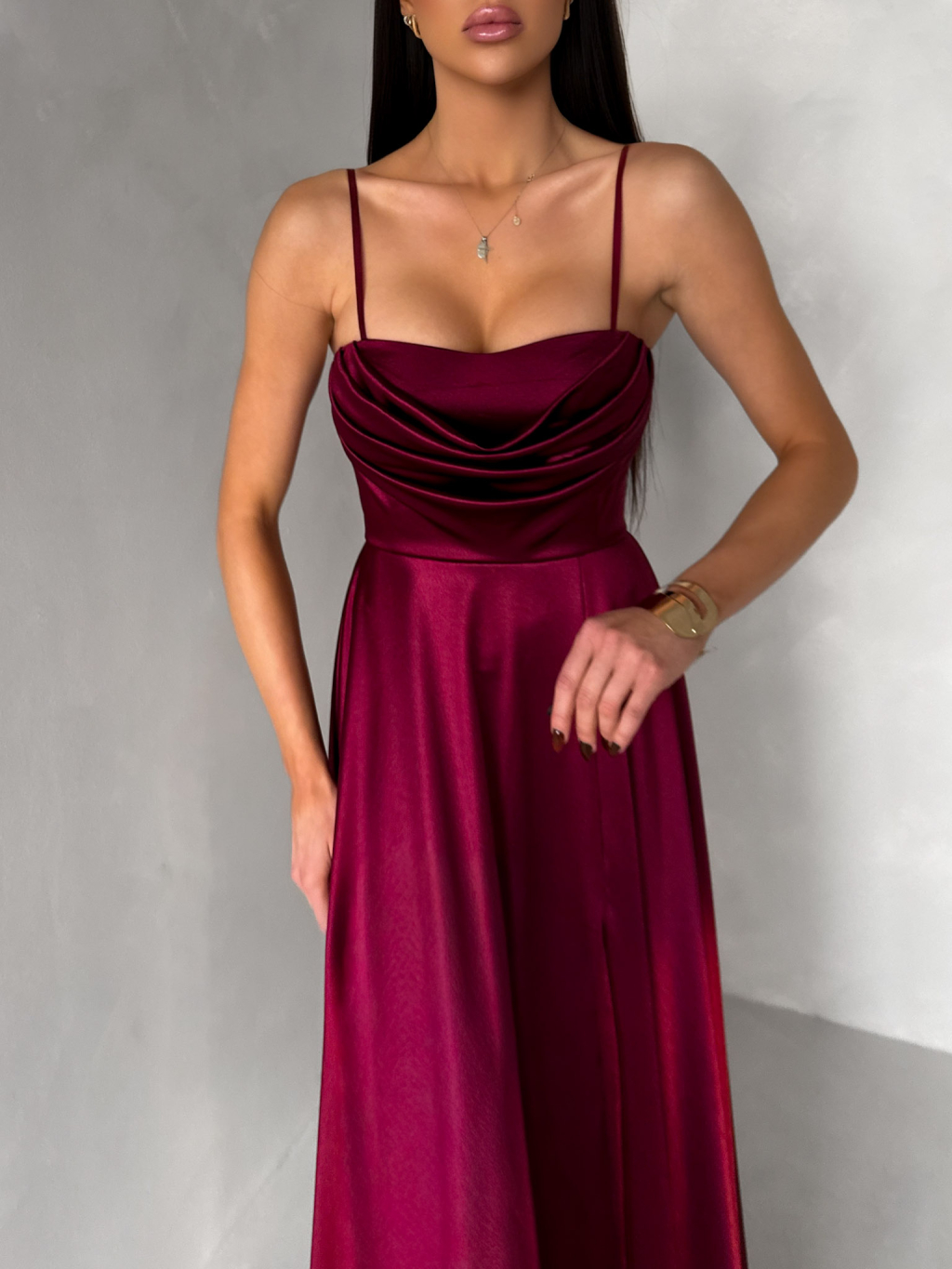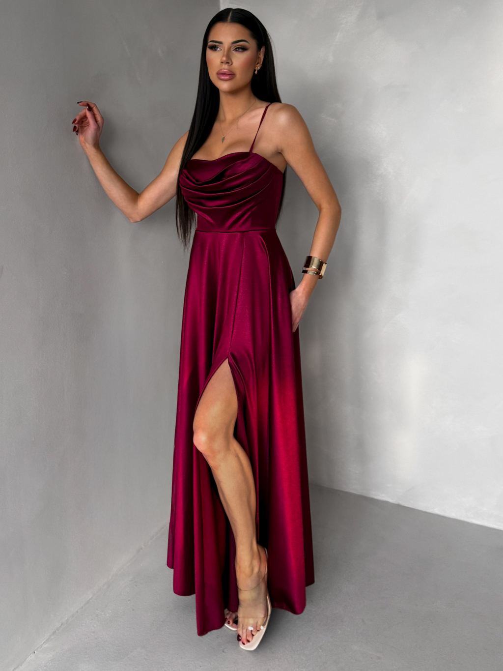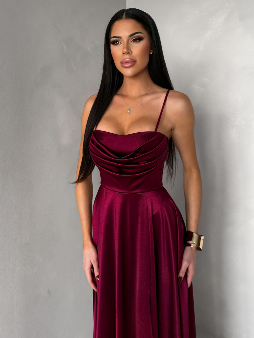 Vínové saténové dlouhé společenské šaty LUNOREX