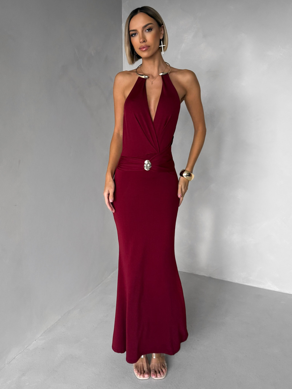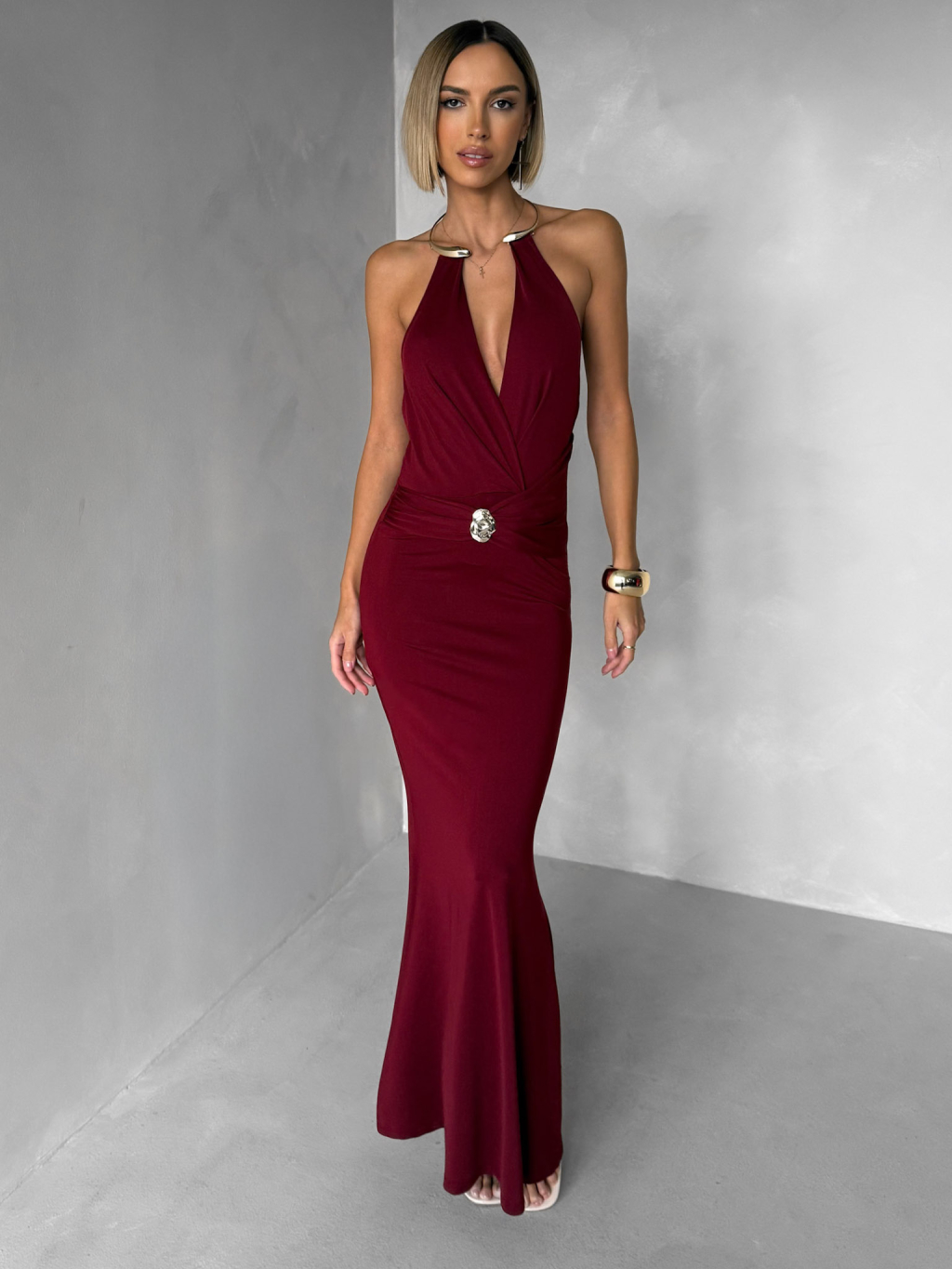 Vínové společenské dlouhé šaty ARKENY s ozdobou