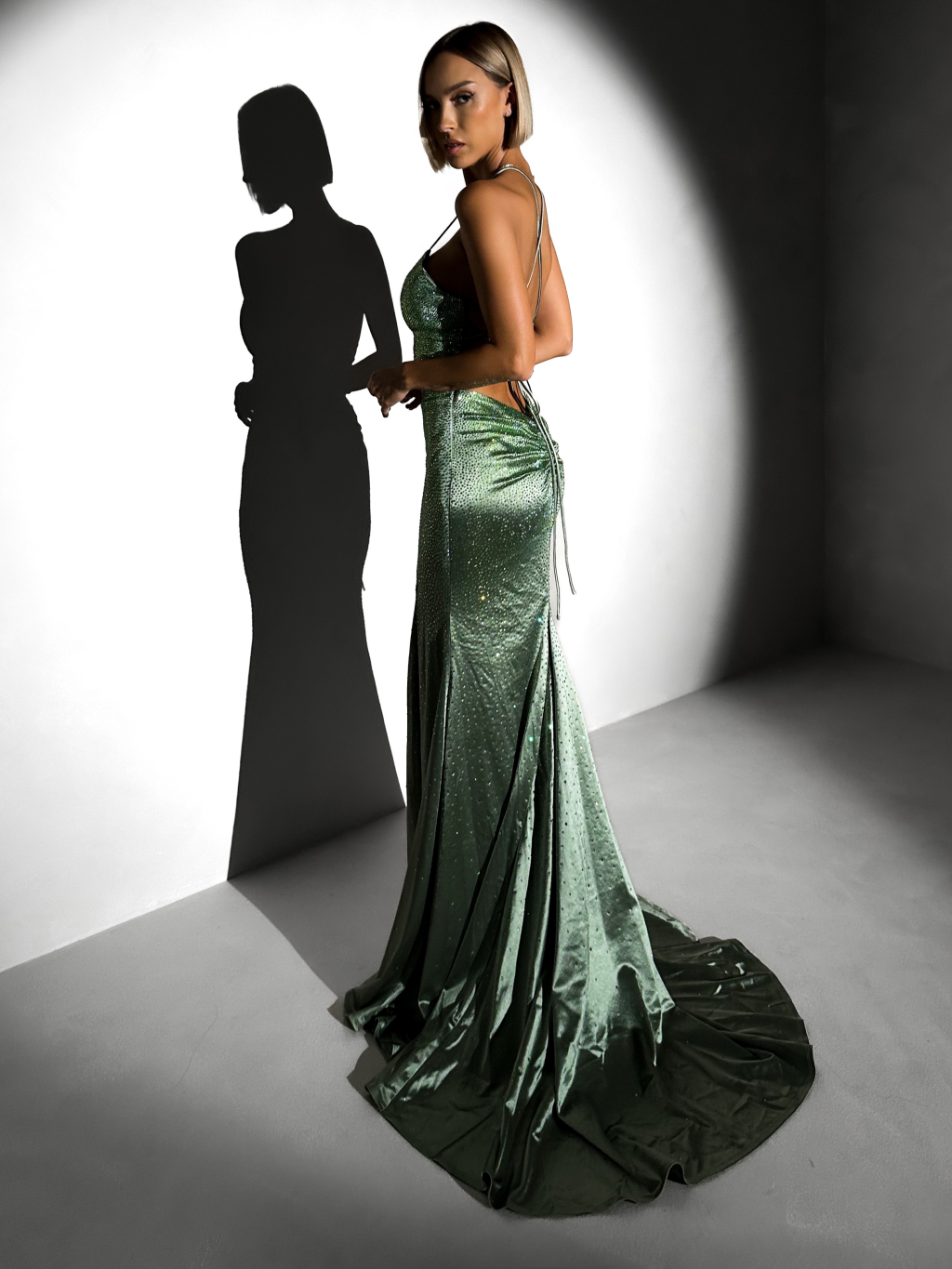 Zelené plesové dlouhé třpytivé šaty ELUREYA s rozparkem