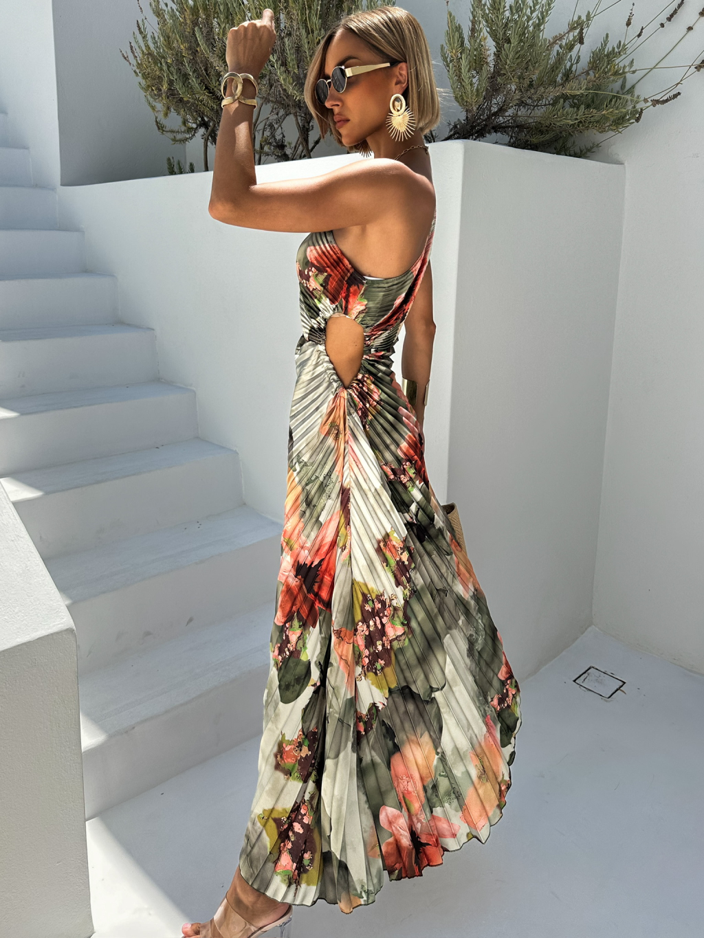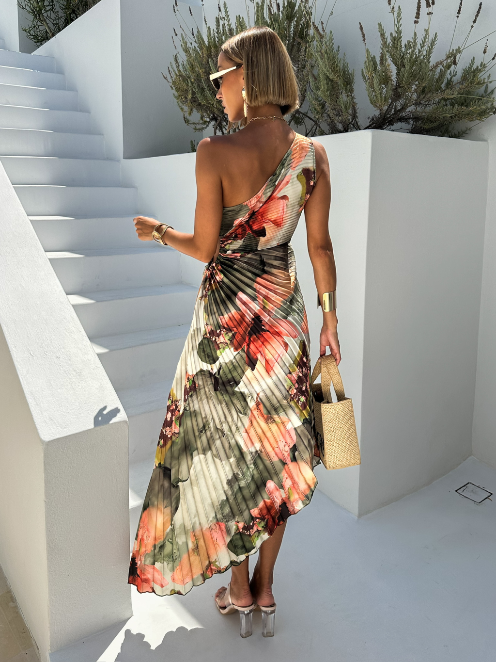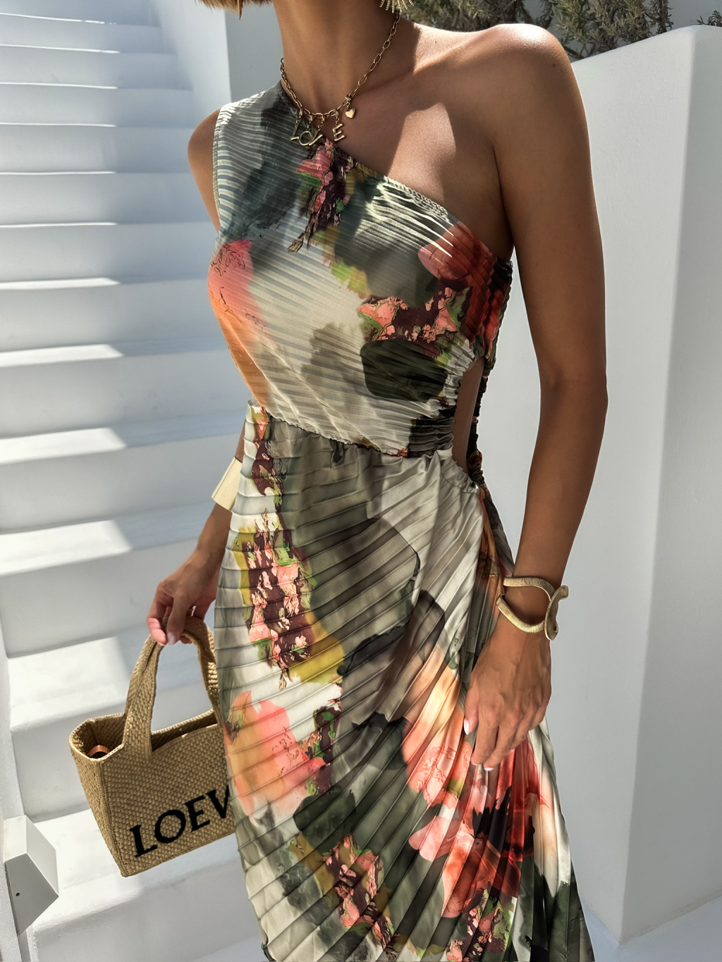 Zelené saténové plisované šaty AESTIL na jedno rameno