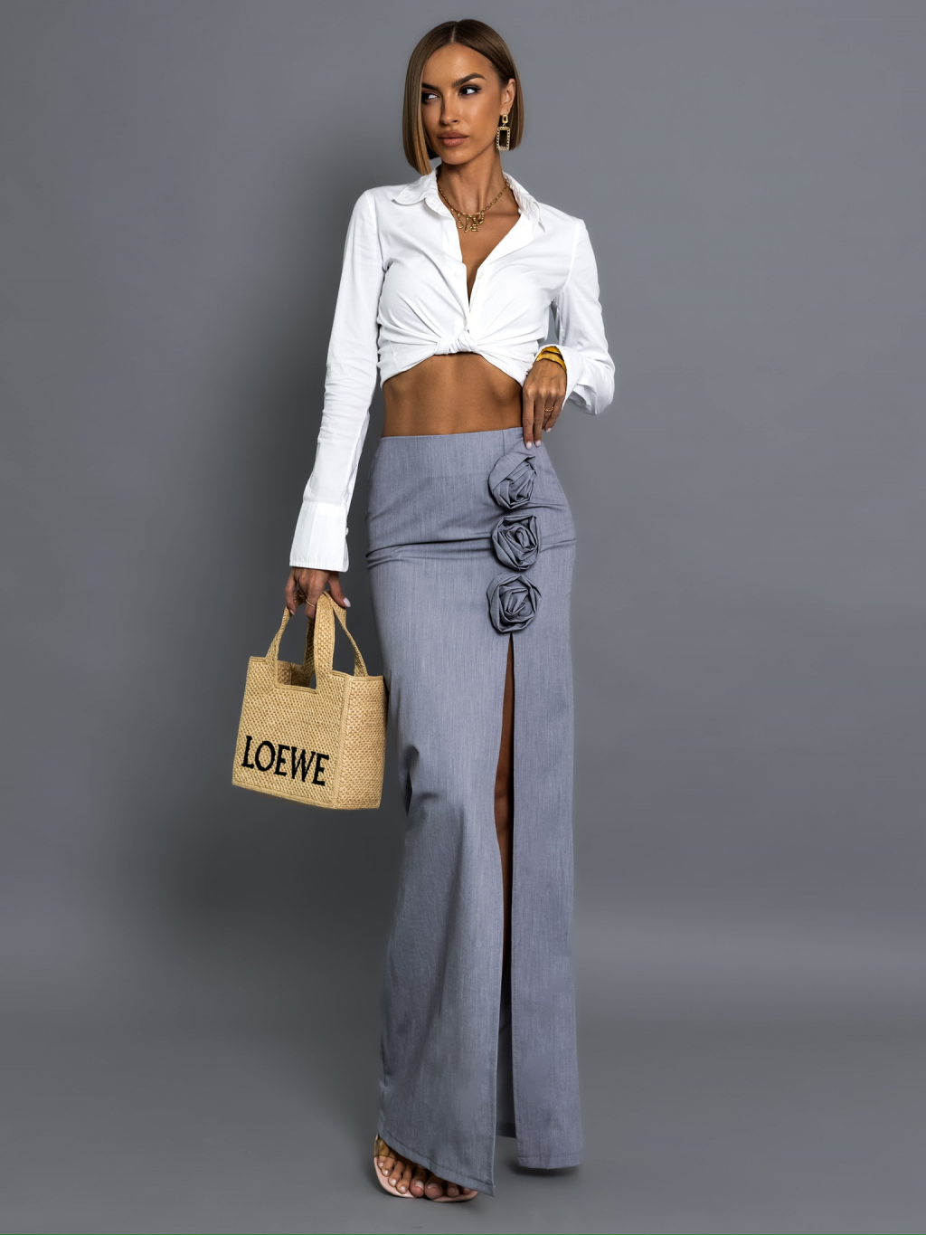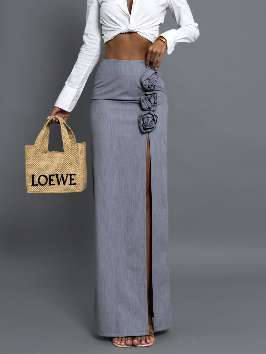 Šedá dlouhá sukně ELOTE s květinami a rozparkem