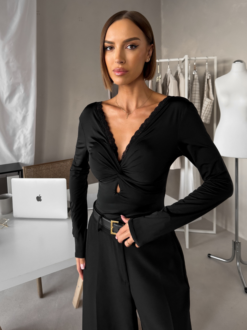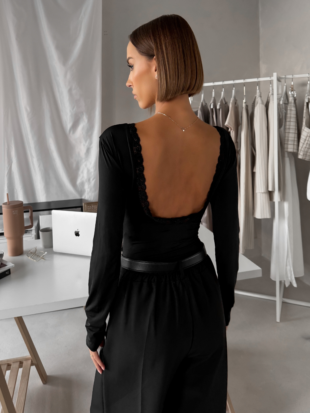 Černé elegantní body LORIEN s dlouhým rukávem a krajkou