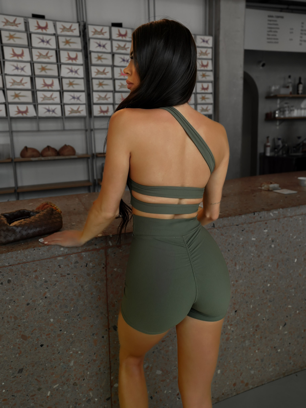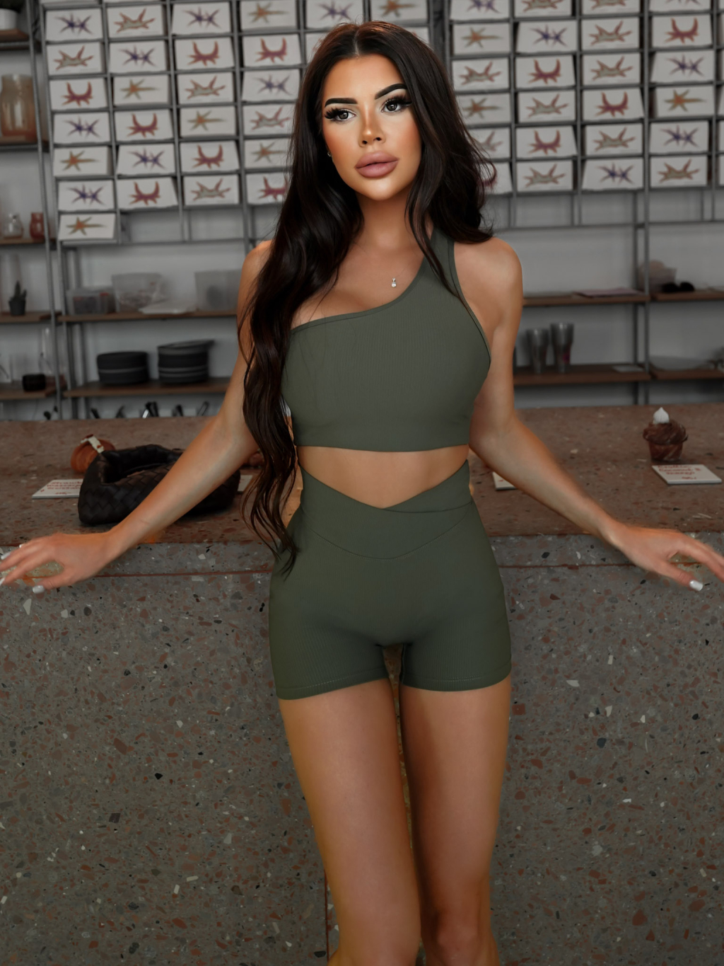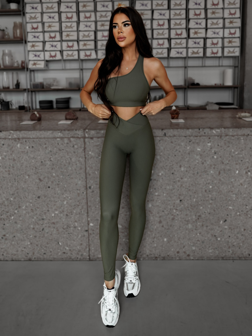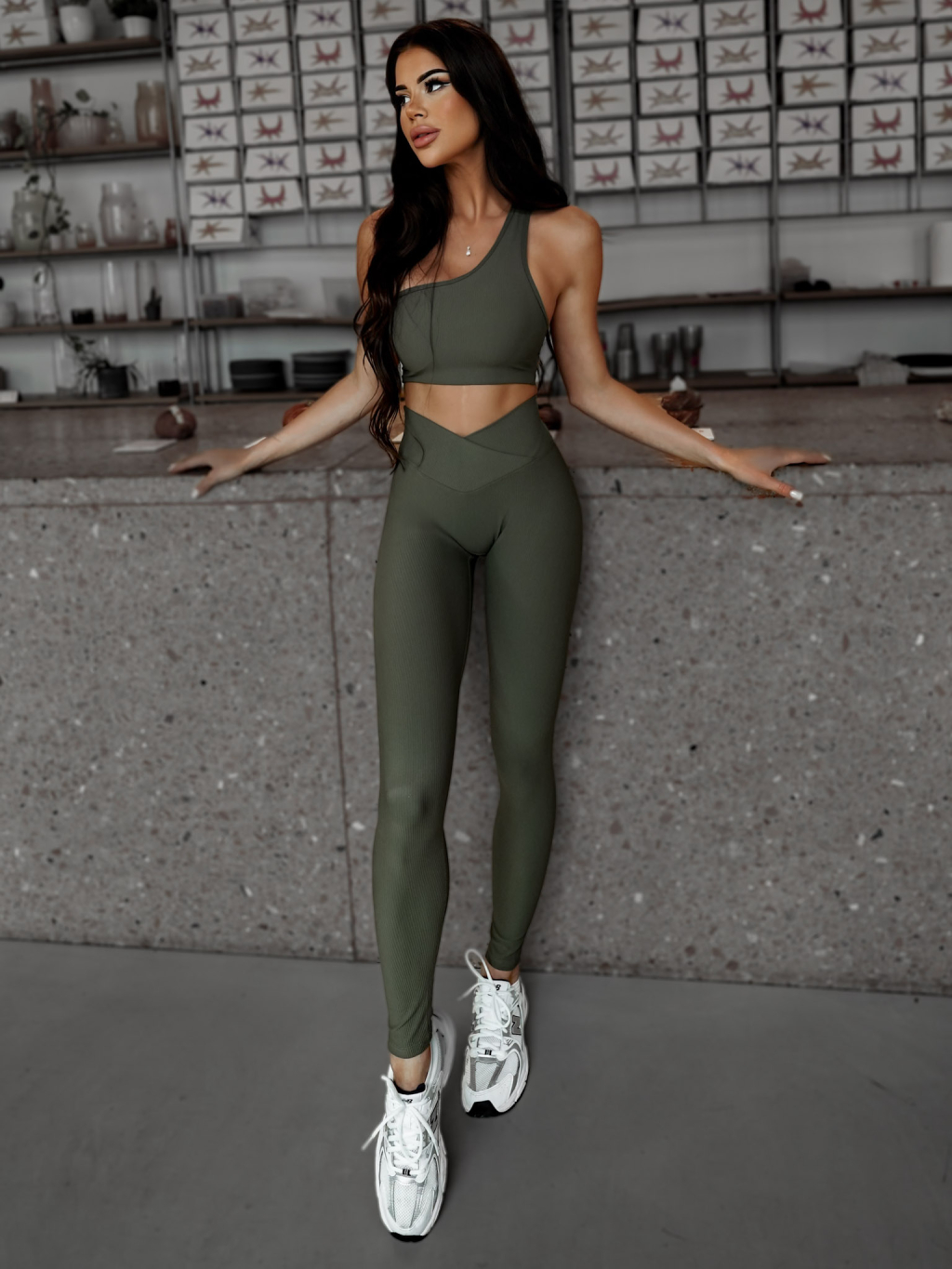 Khaki sportovní žebrovaná asymetrická podprsenka ENETEL