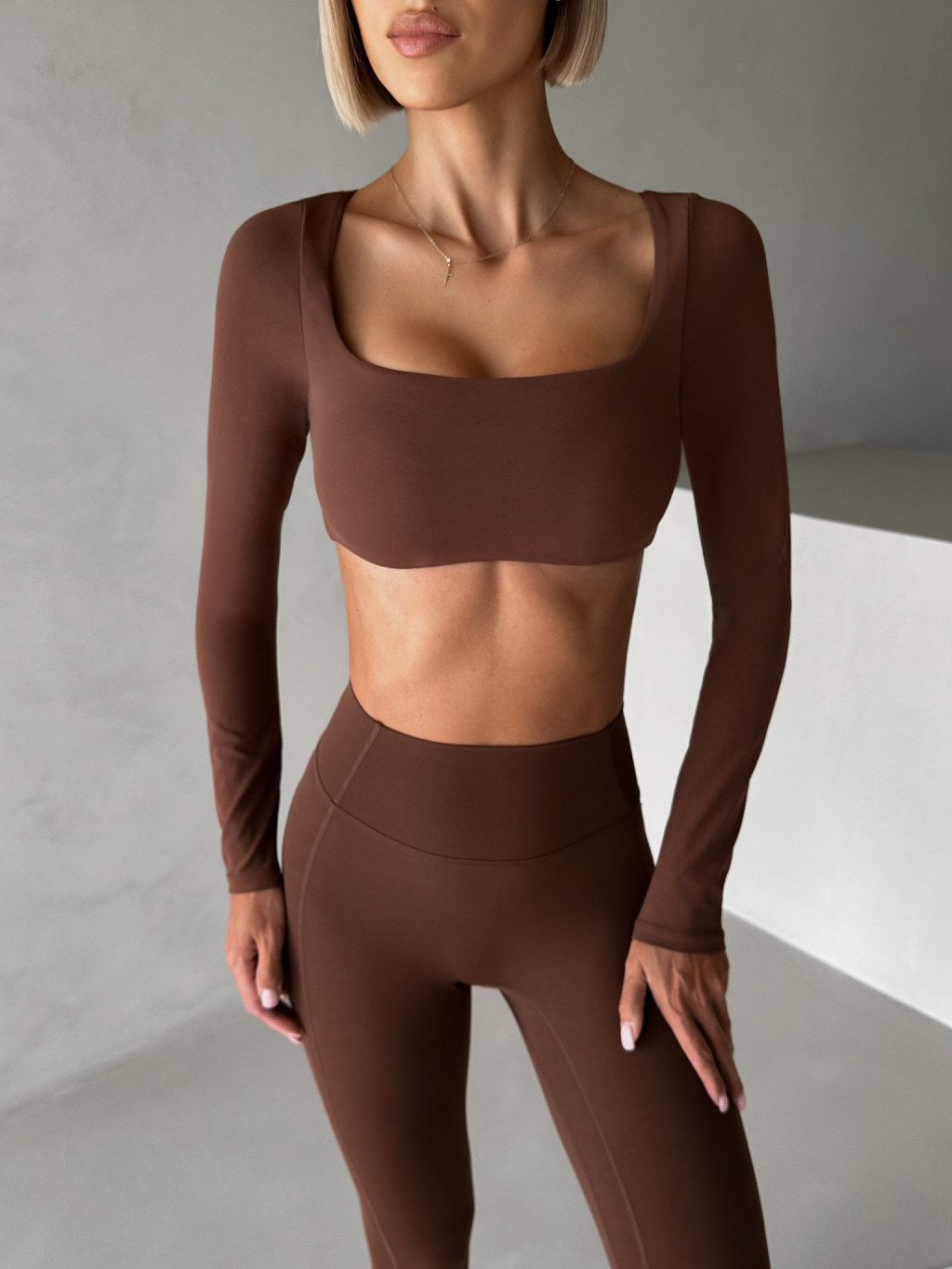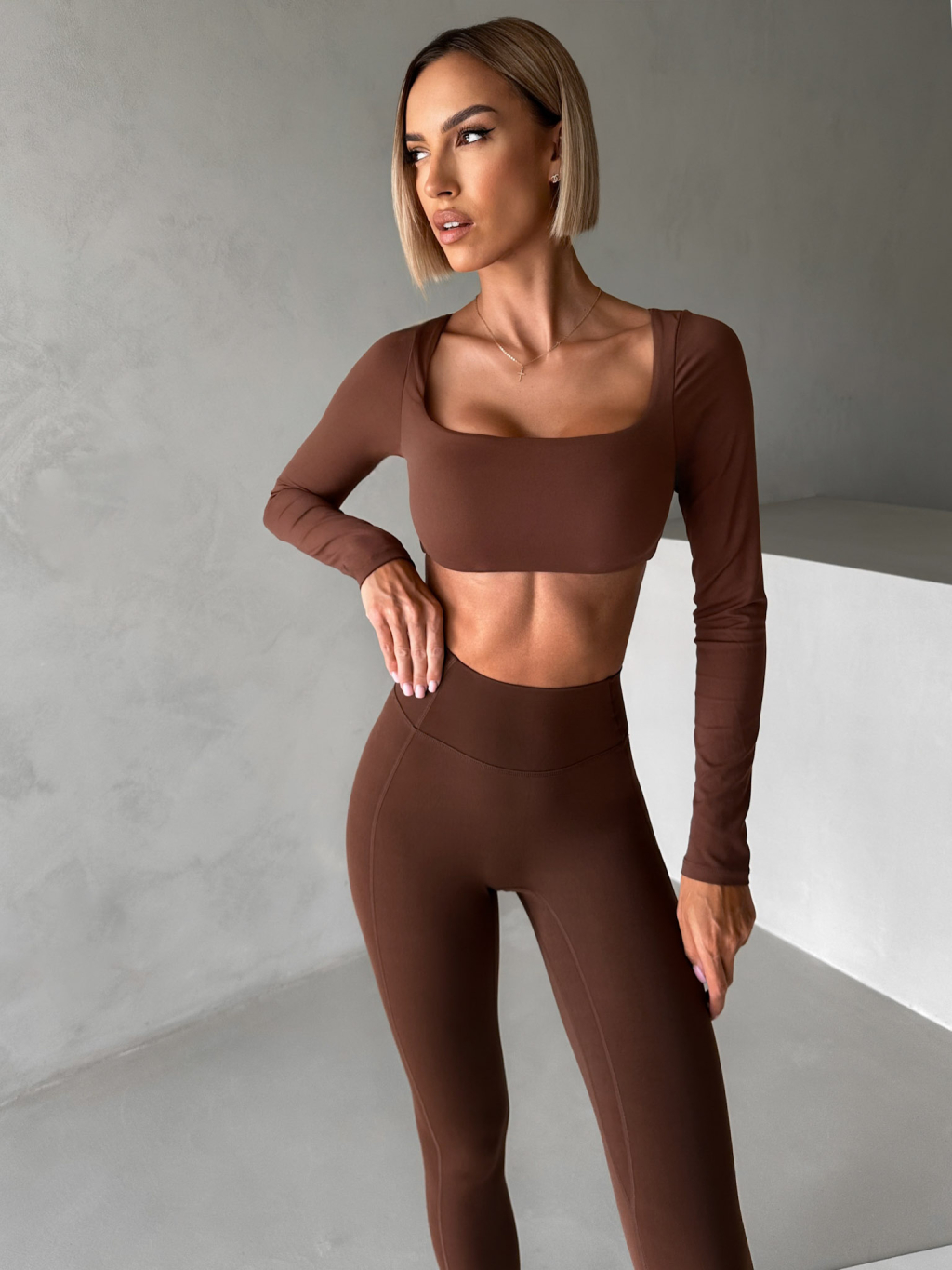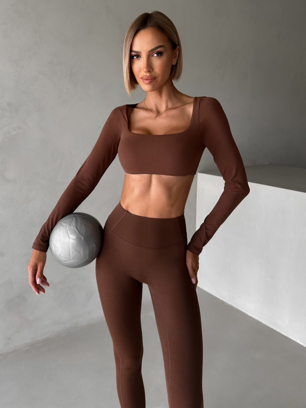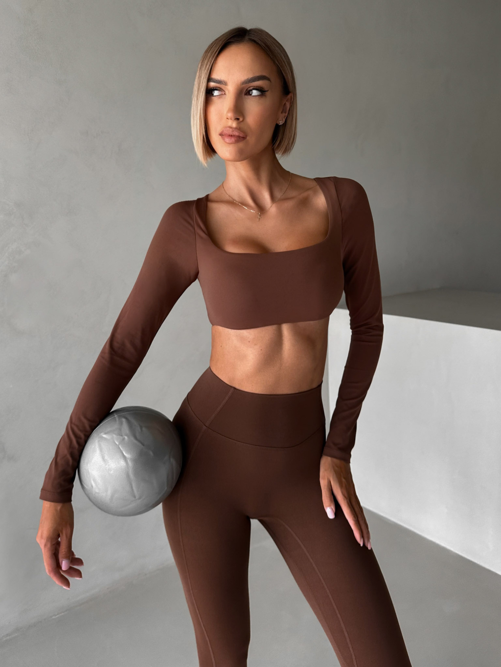 Hnědý jóga krátký top JIMELA s dlouhým rukávem