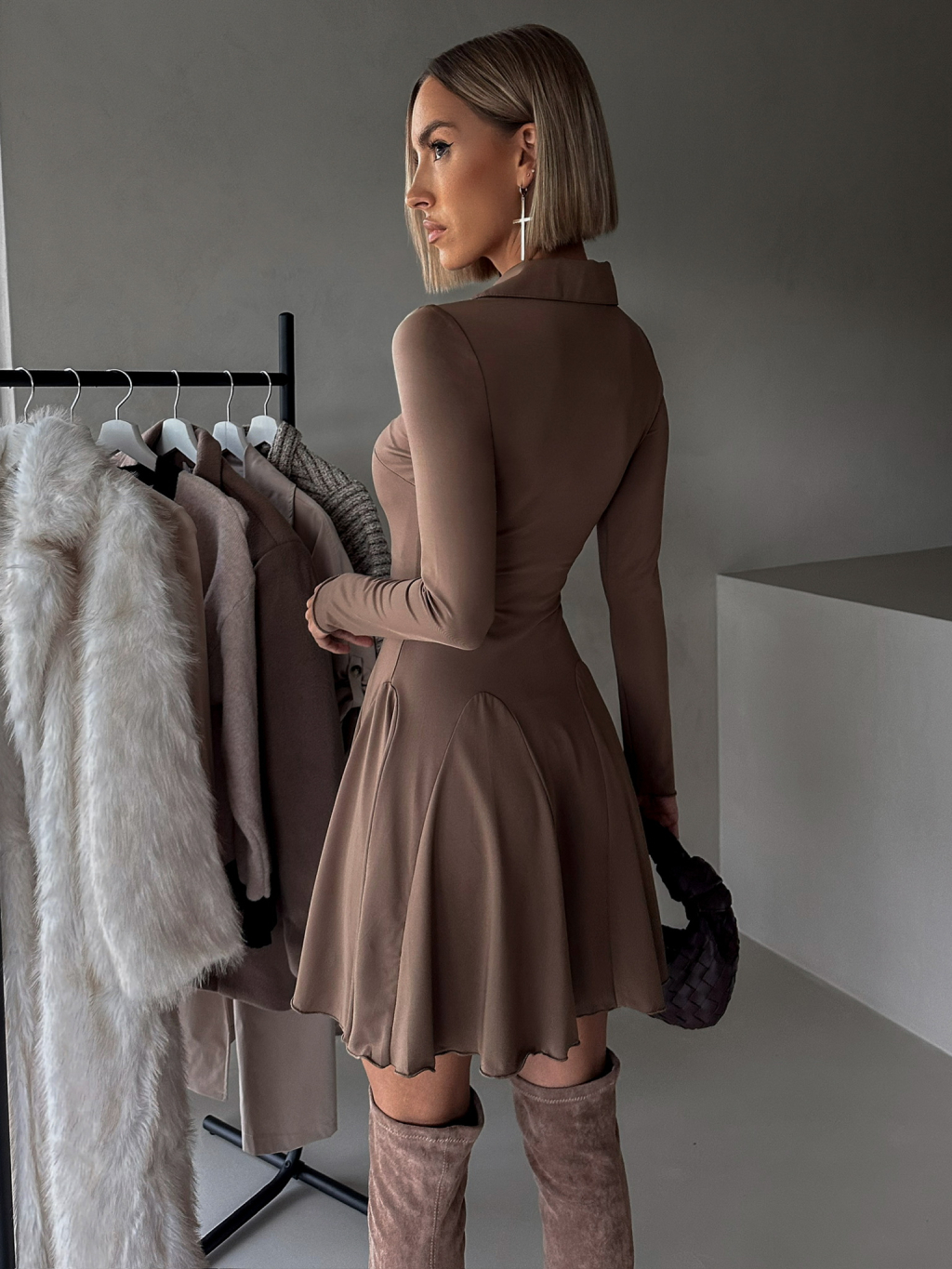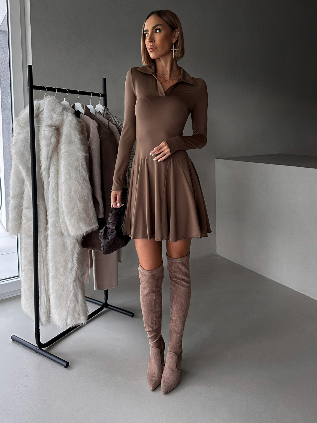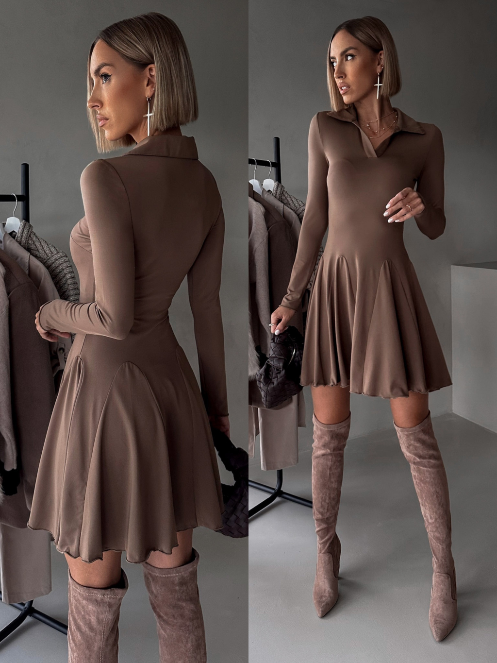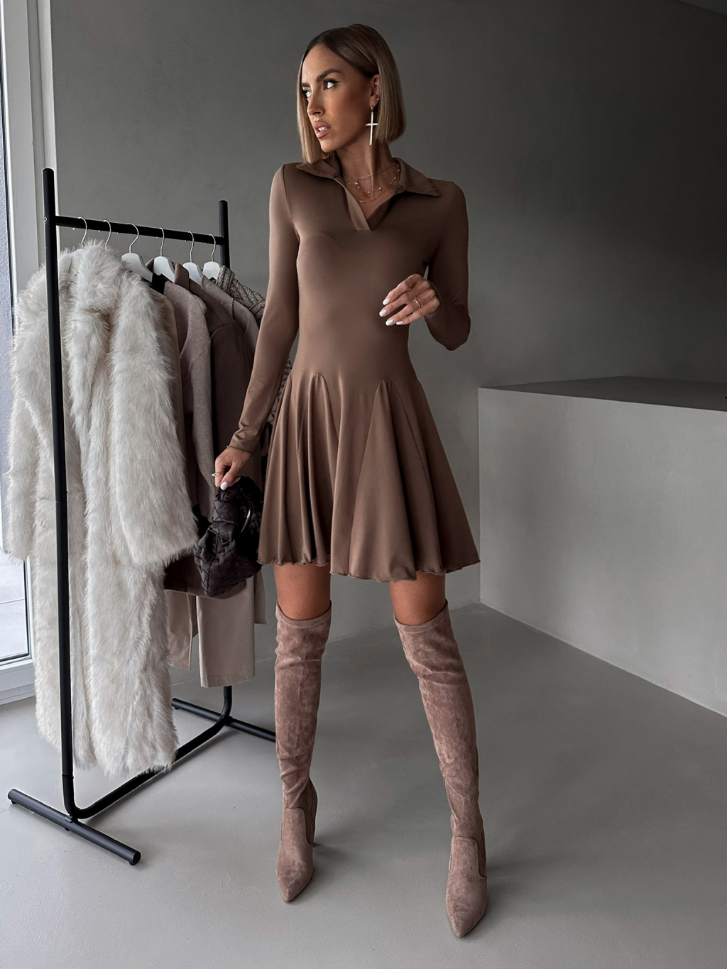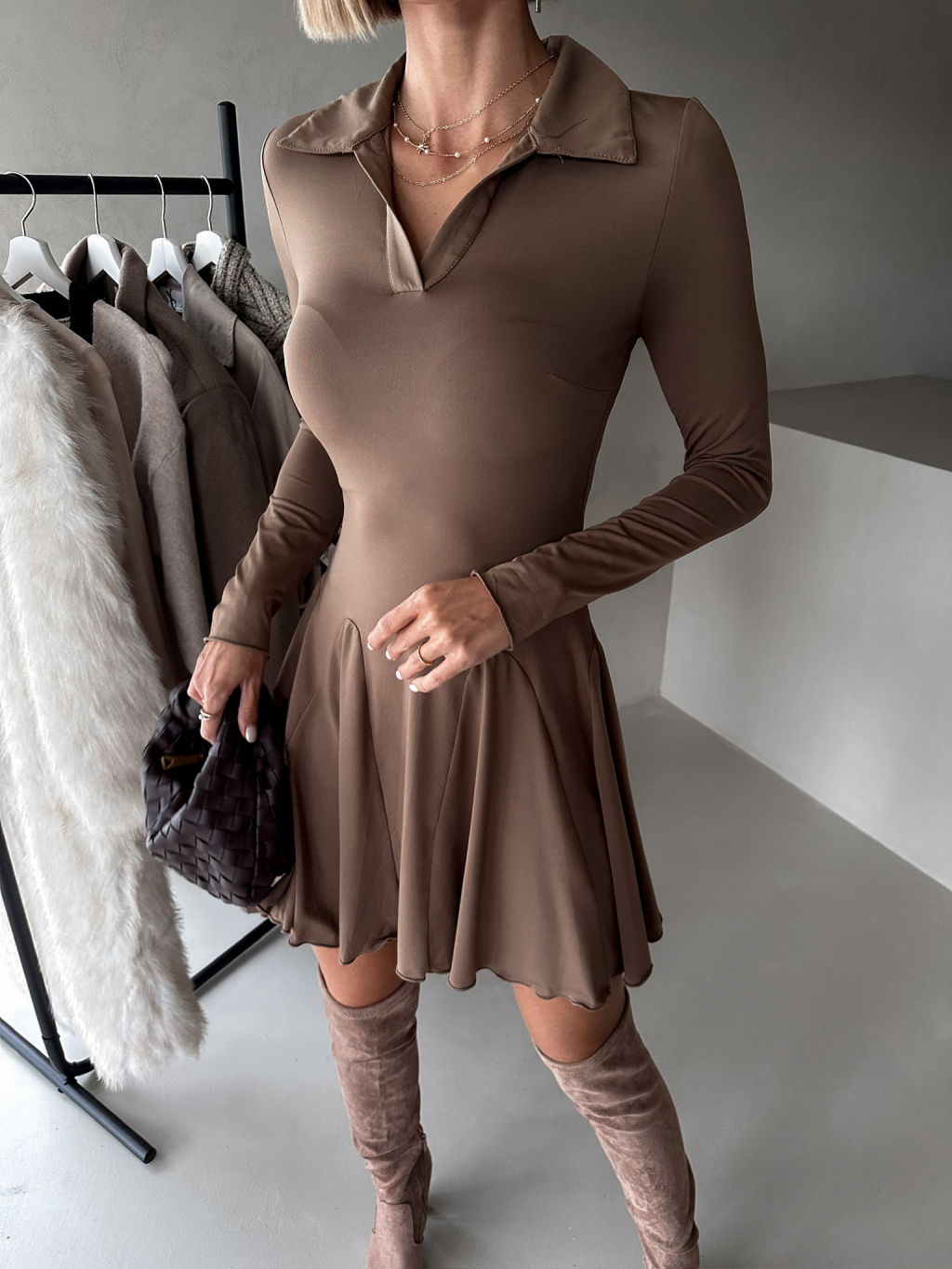 Hnědé áčkové polo šaty HILMAT s dlouhým rukávem