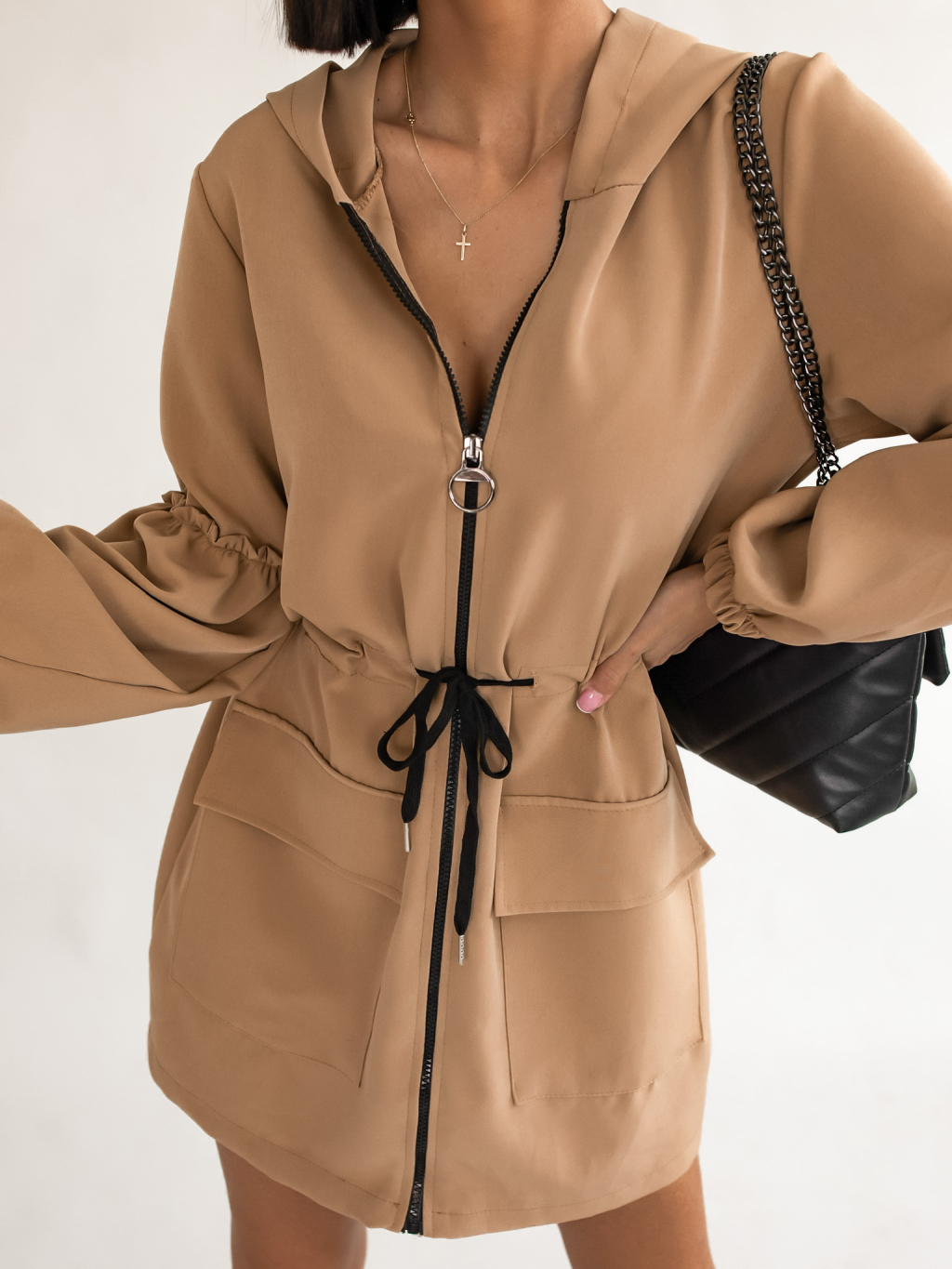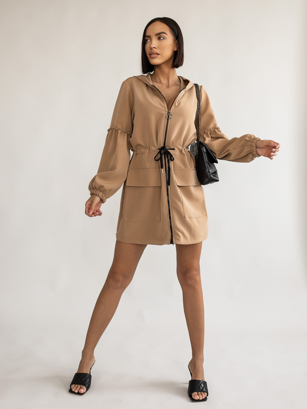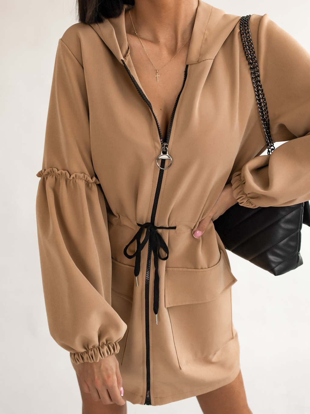 Hnědé šaty na zip SAMANTHA s nabíranými rukávy a kapucí
