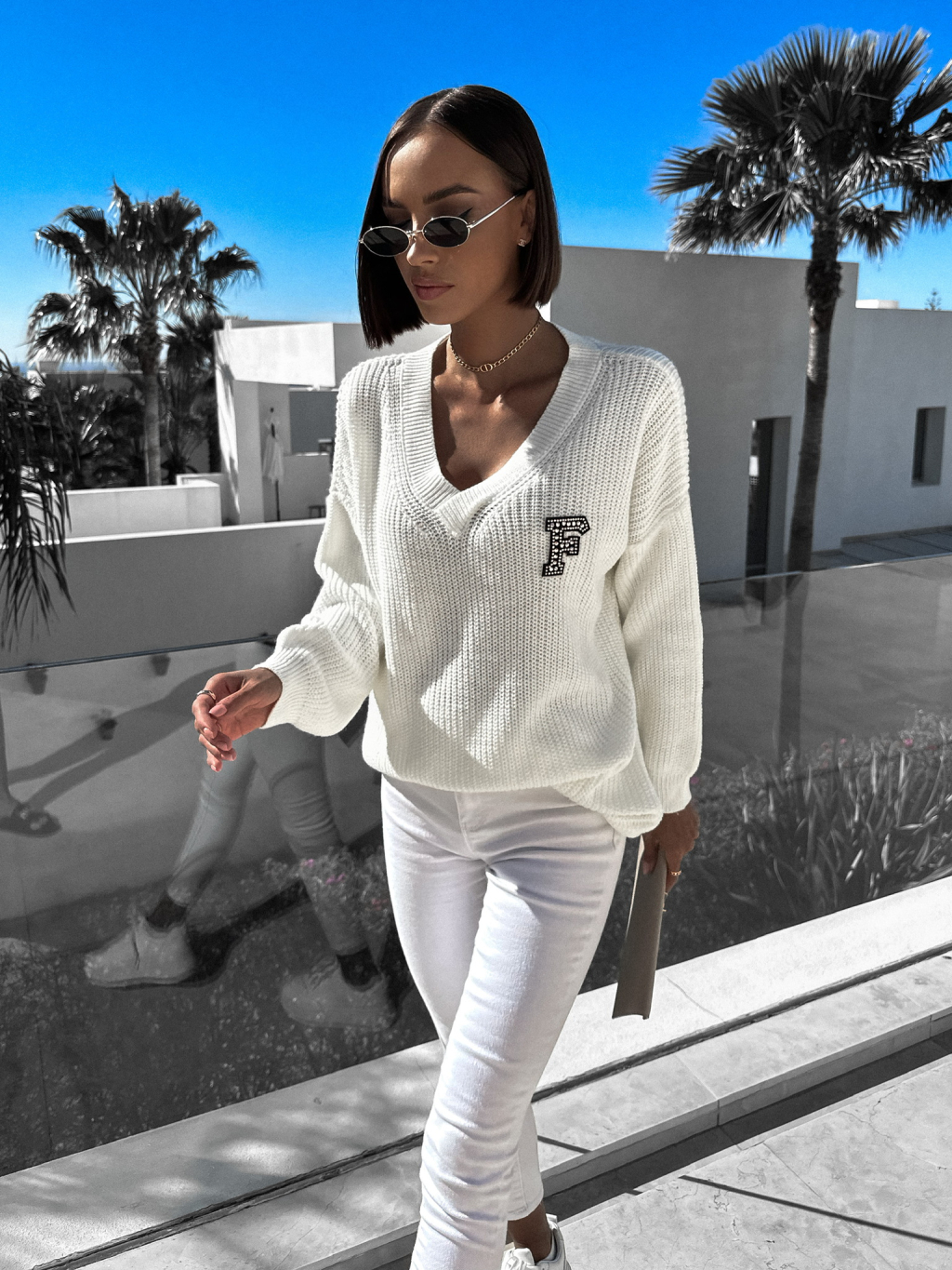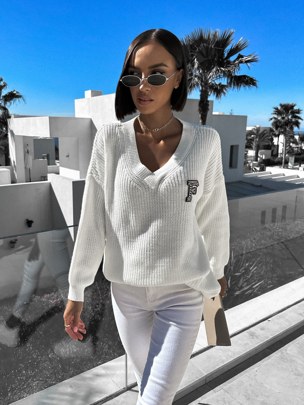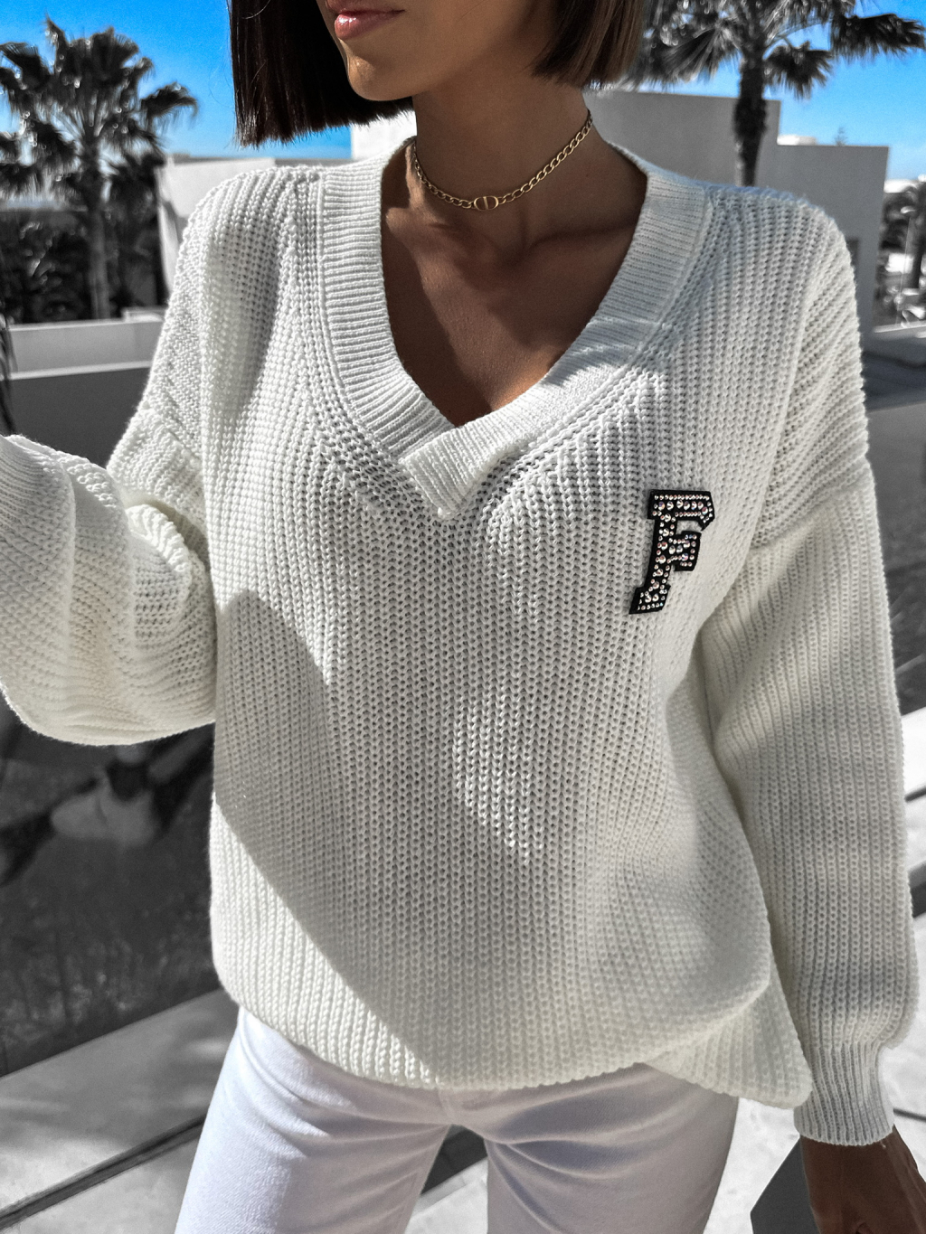 Bílý dlouhý svetr ANNIKA s výstřihem do V