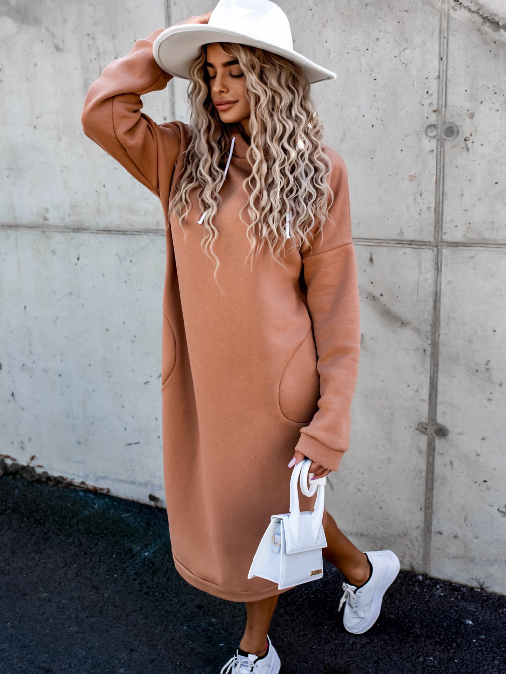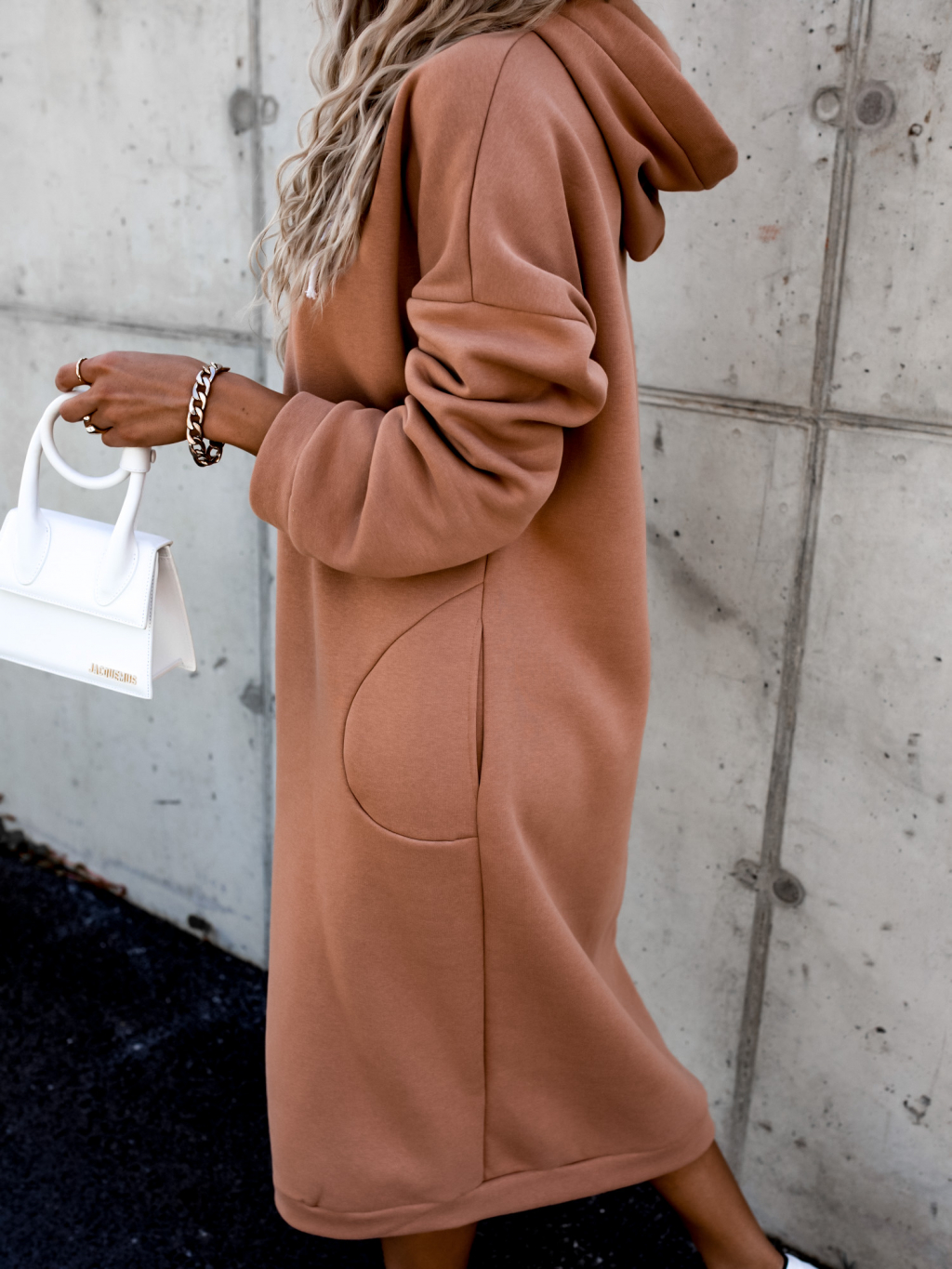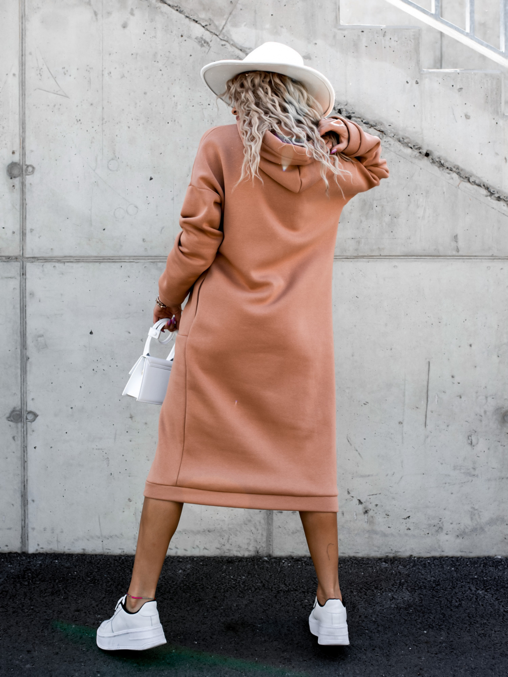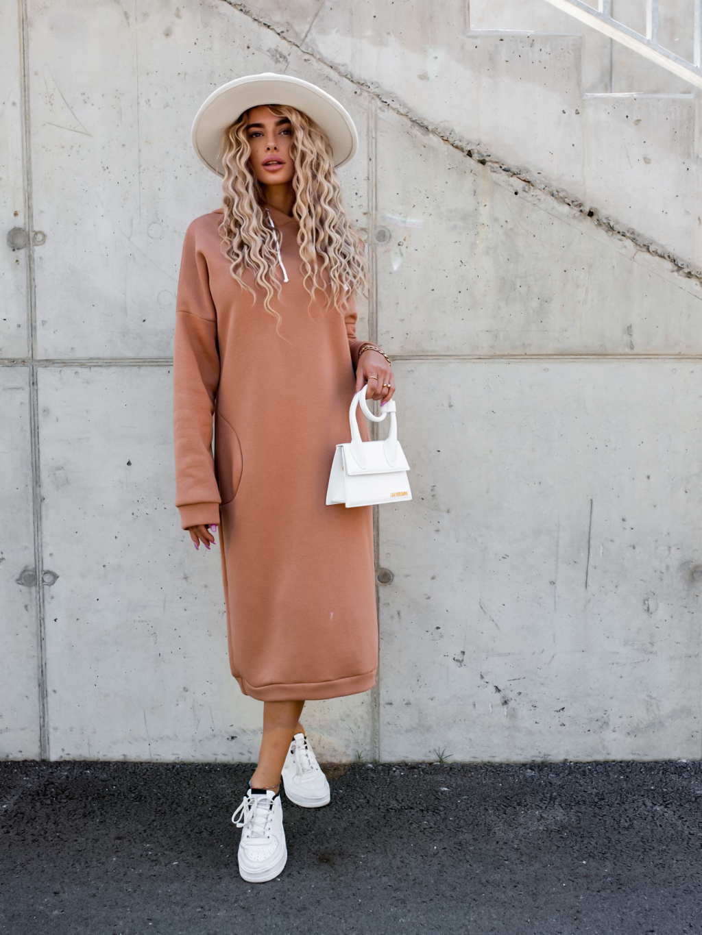 Hnědé dlouhé mikinové šaty DARINNE s kapucí