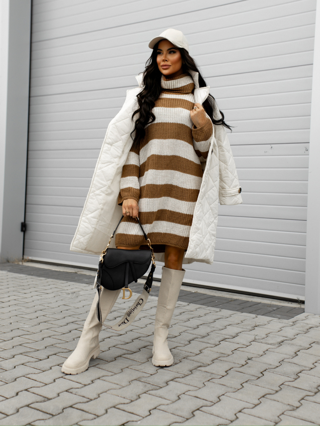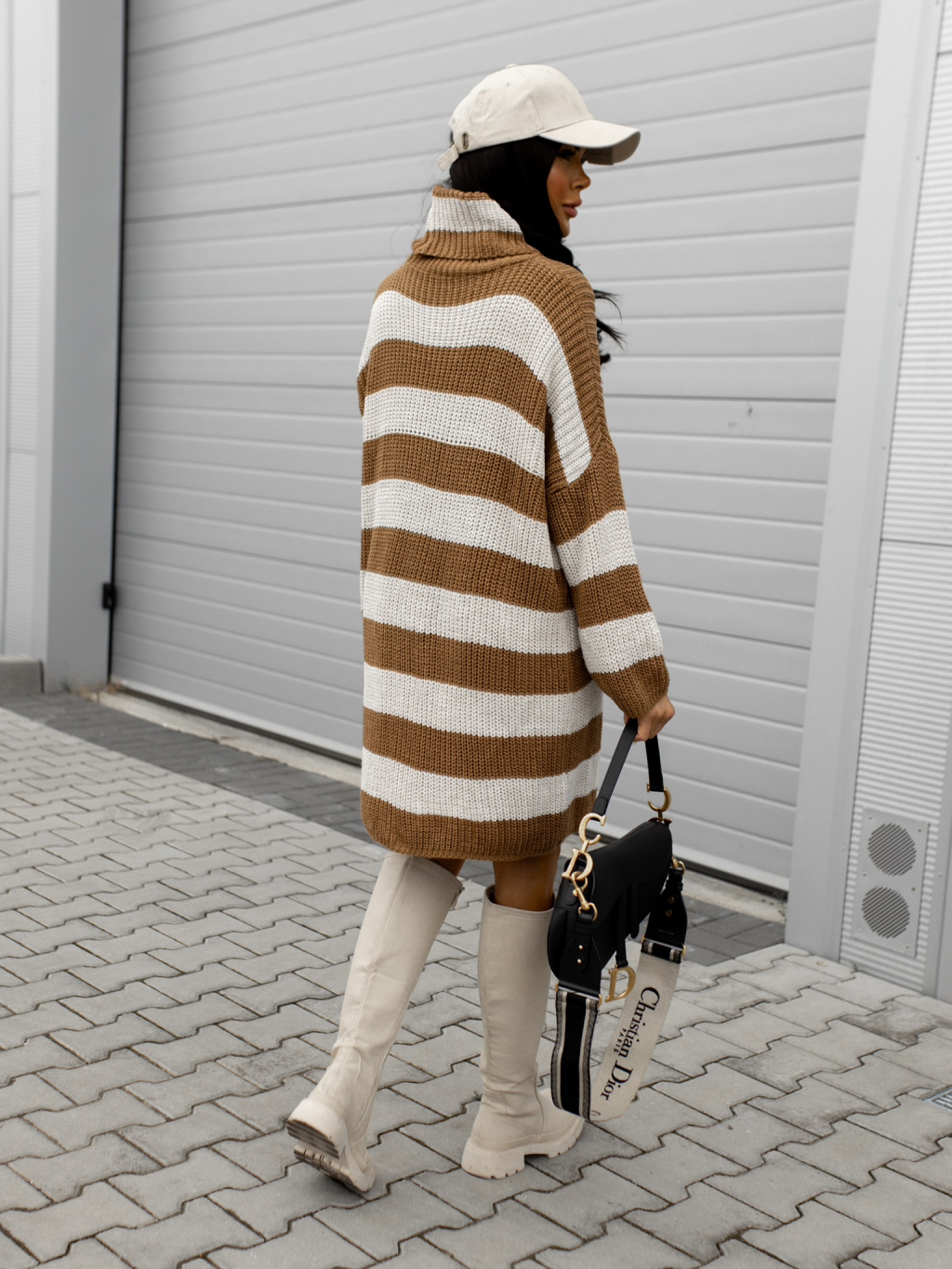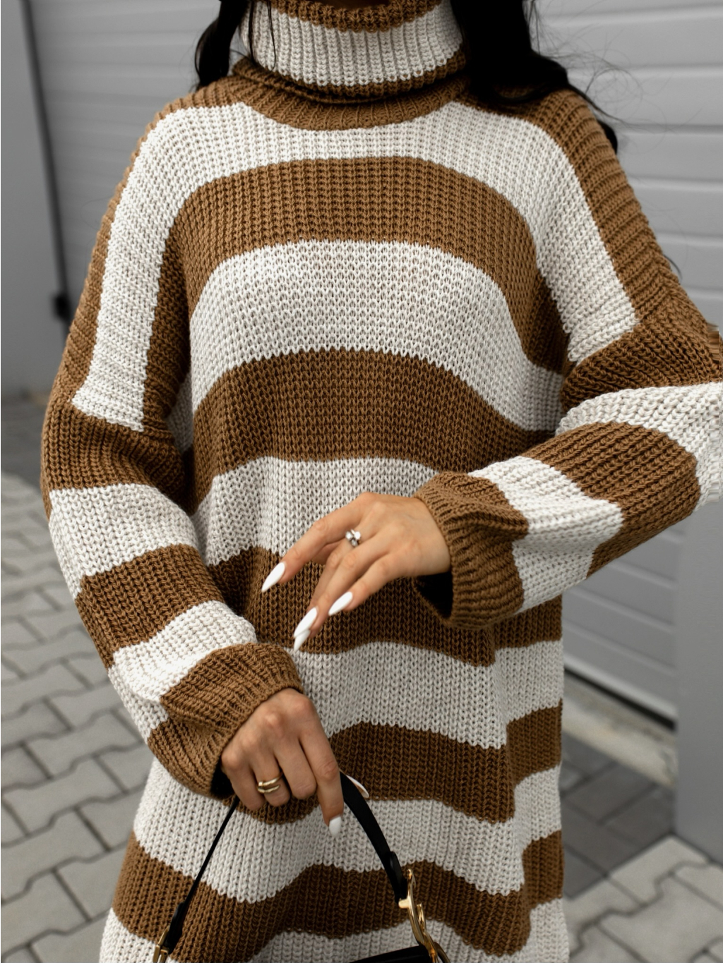 Hnědobéžový pruhovaný svetr šaty MIAMIS