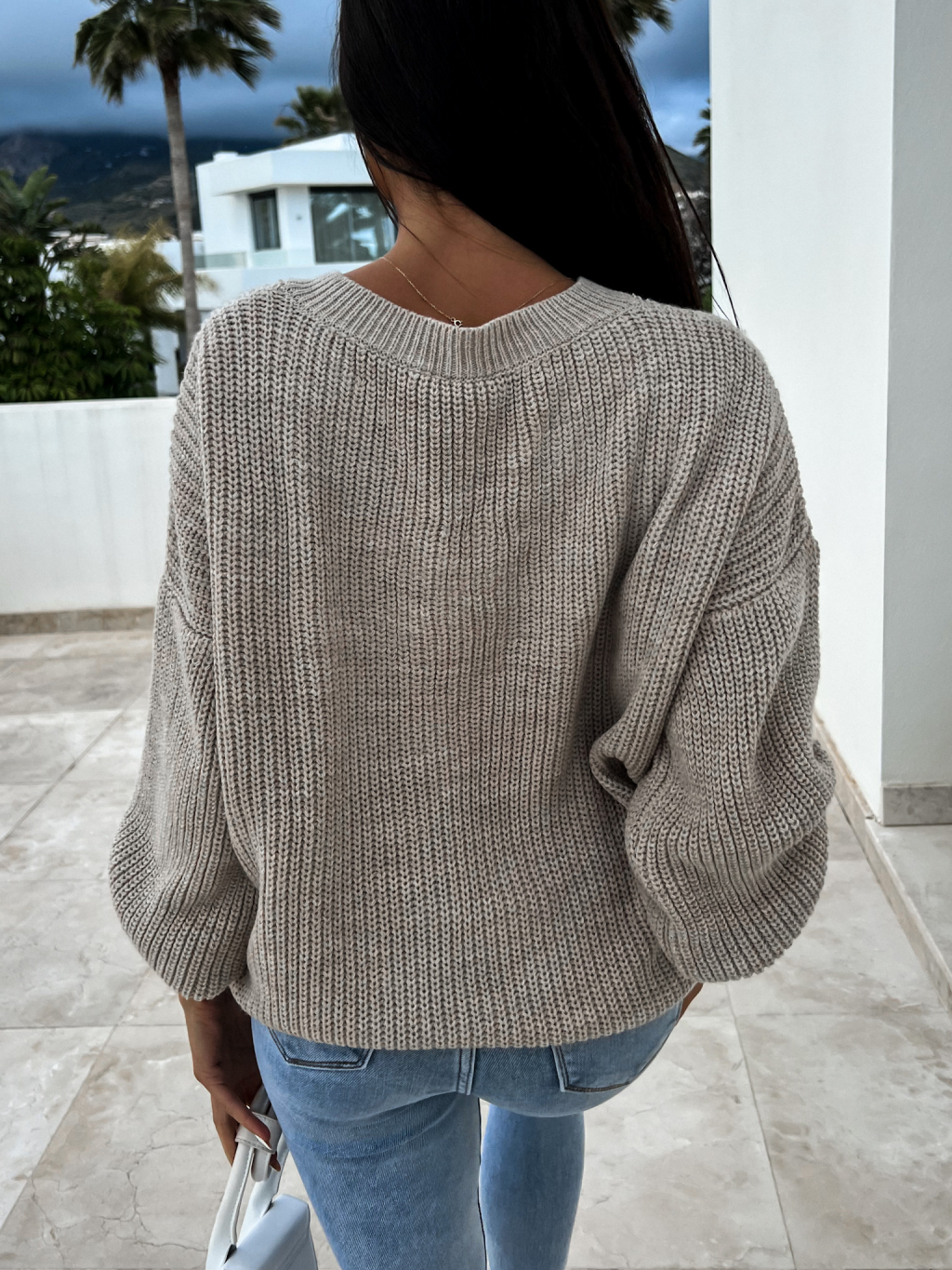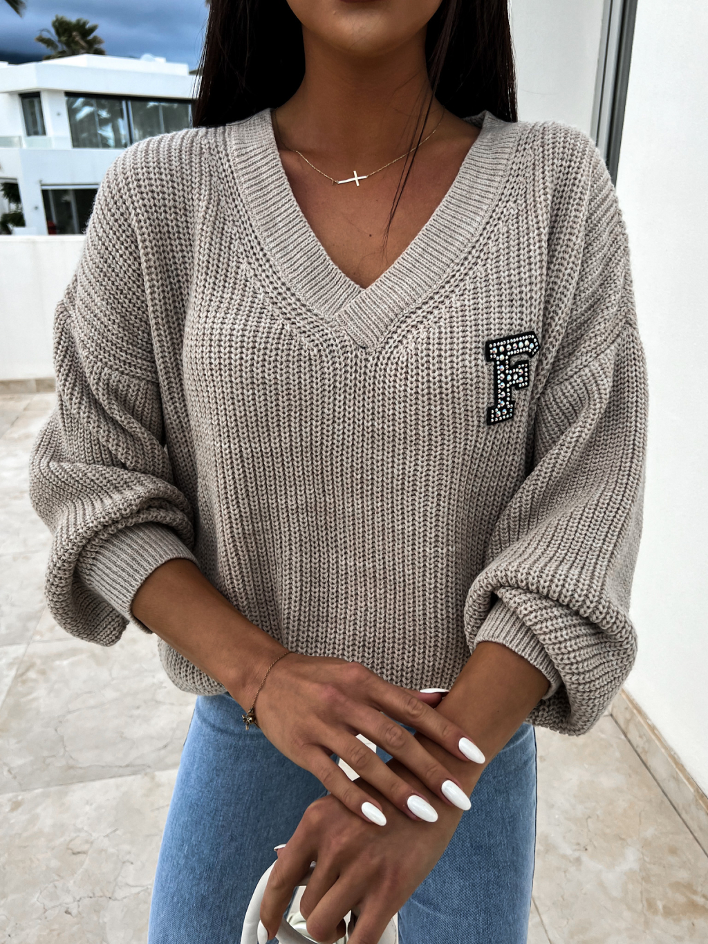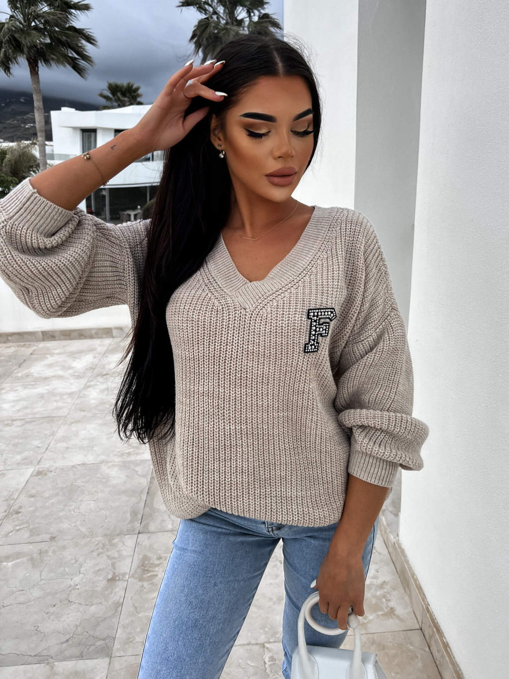 Krémový dlouhý svetr ANNIKA s výstřihem do V