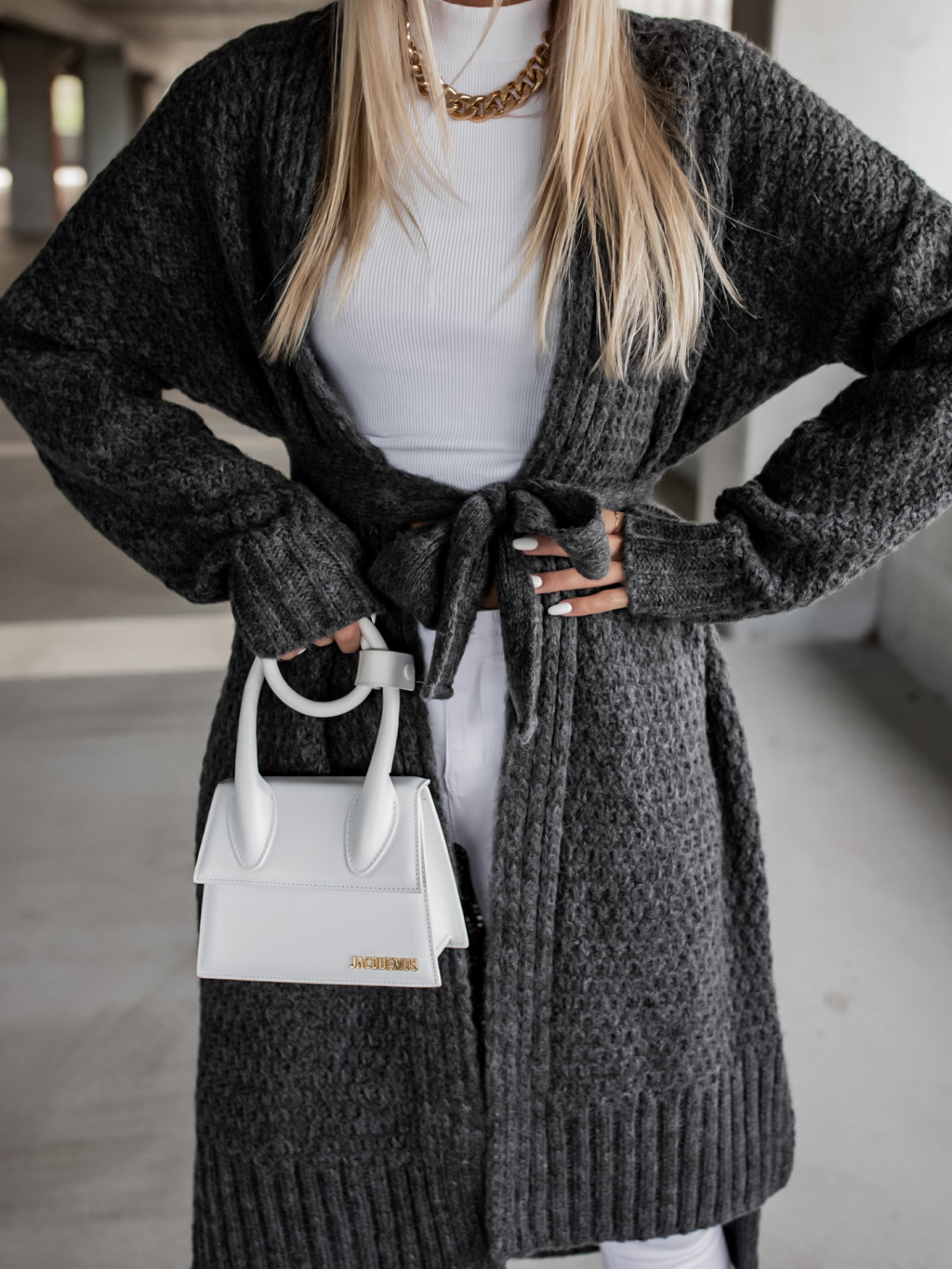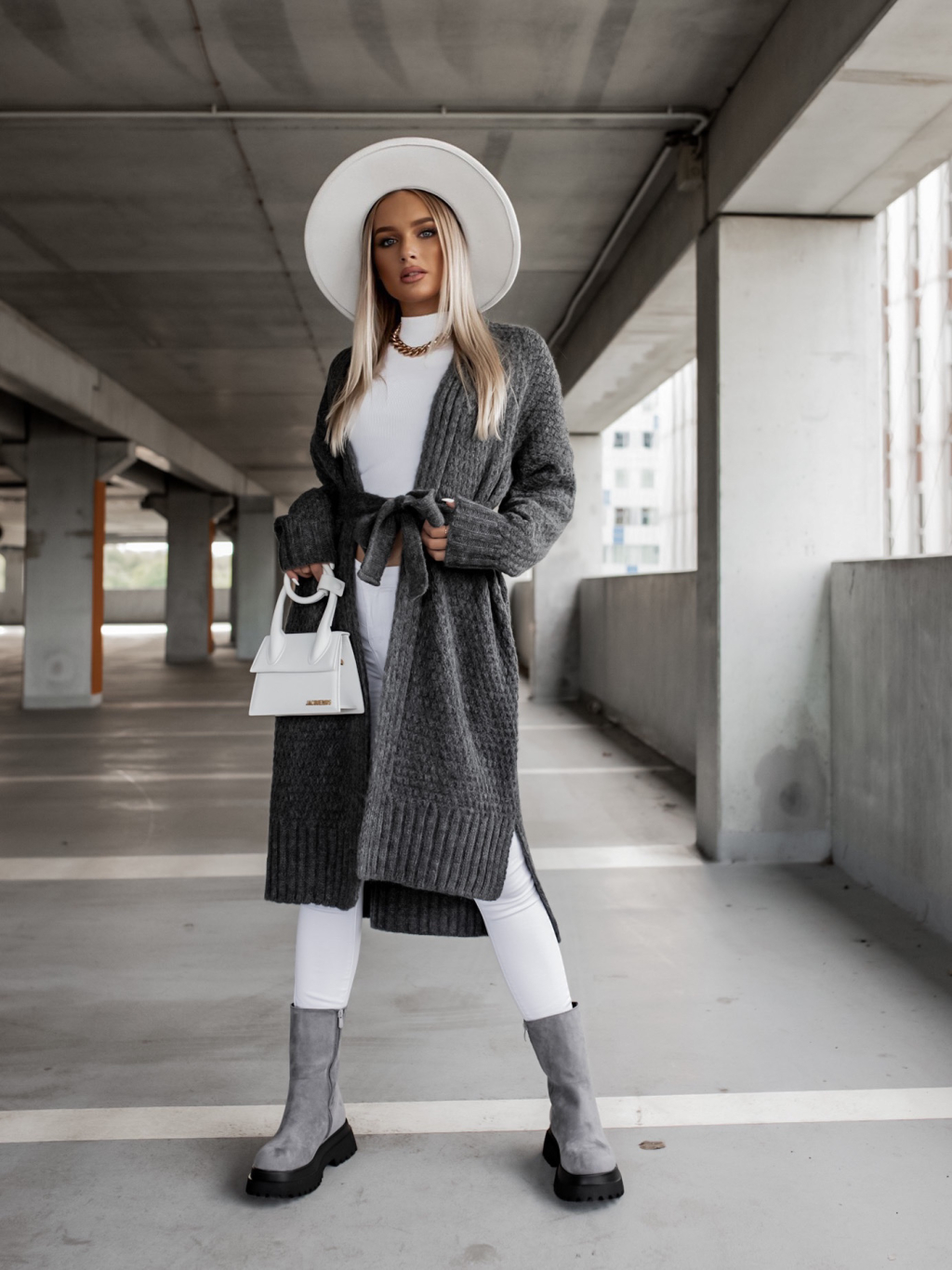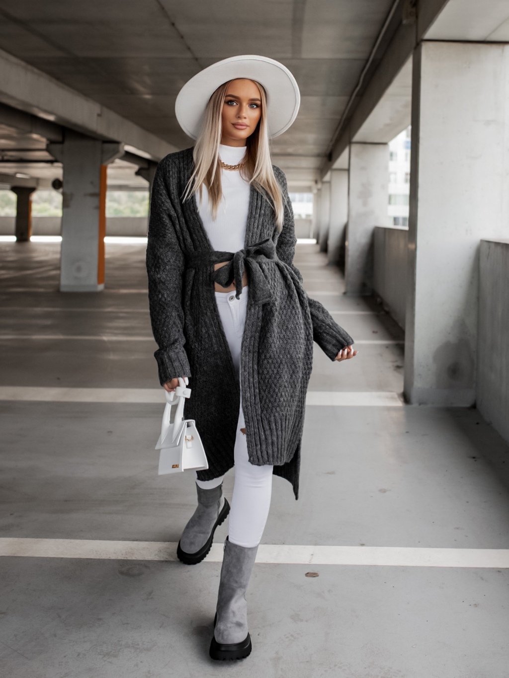 Tmavě šedý pletený cardigan FLAWLESSLY se zavazováním v pase