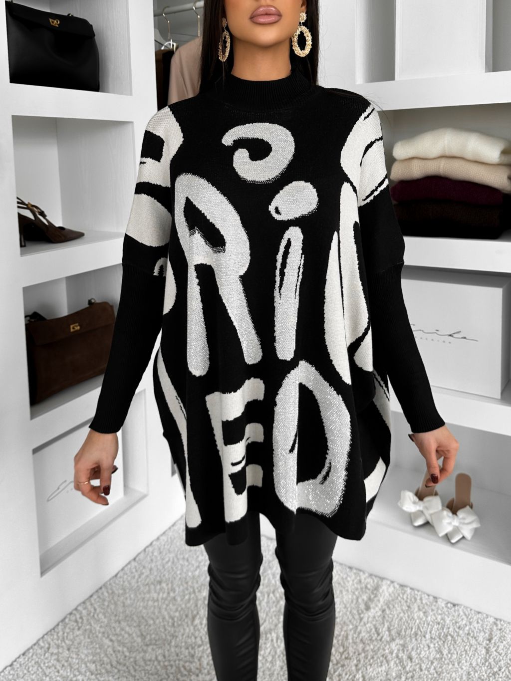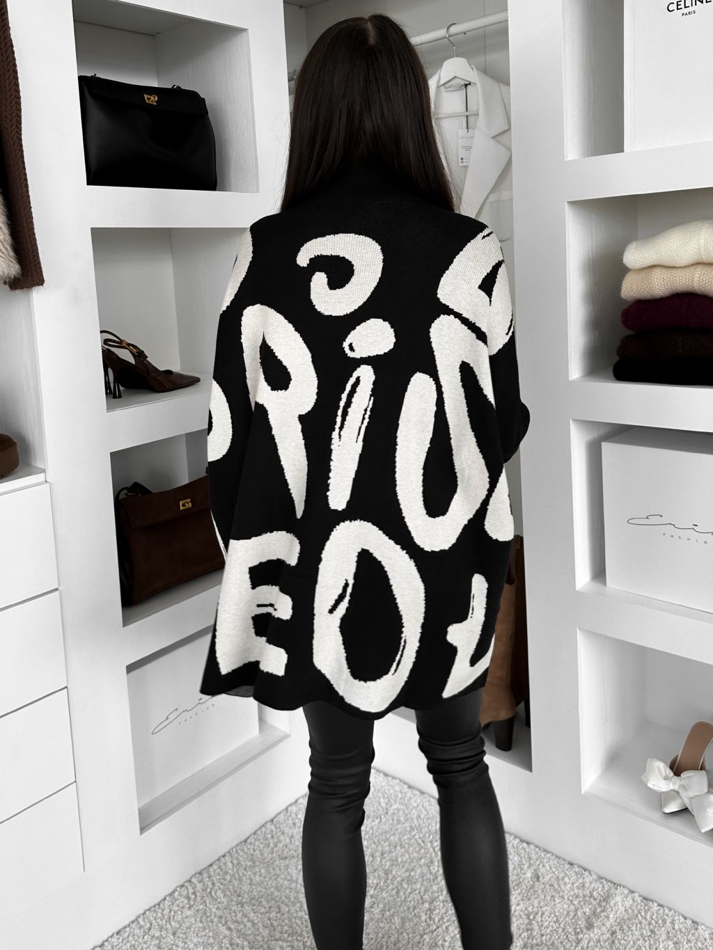 Černý dlouhý stylový svetr MINADRA s potiskem