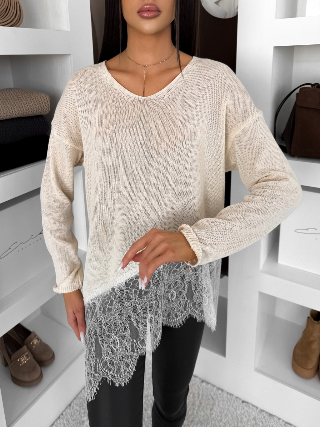 Krémový oversize svetřík MALFIO s krajkou