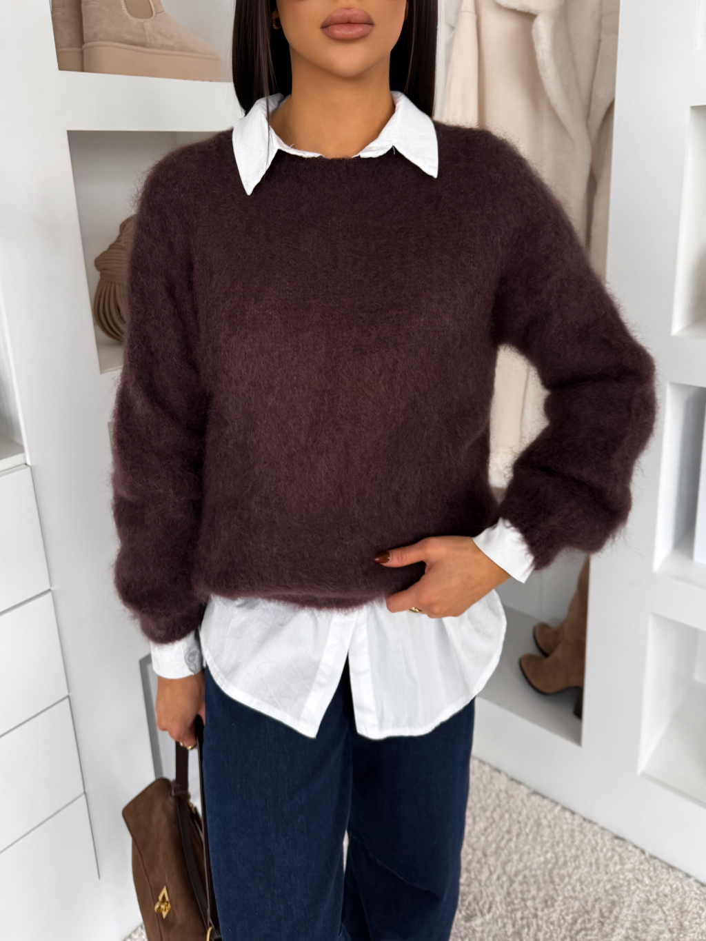 Tmavě hnědý vlněný krátký svetr JERSEY
