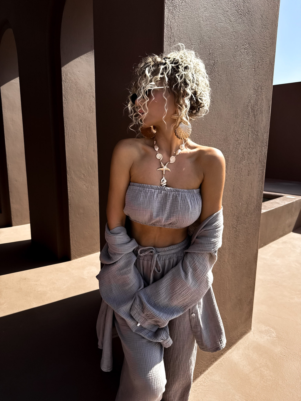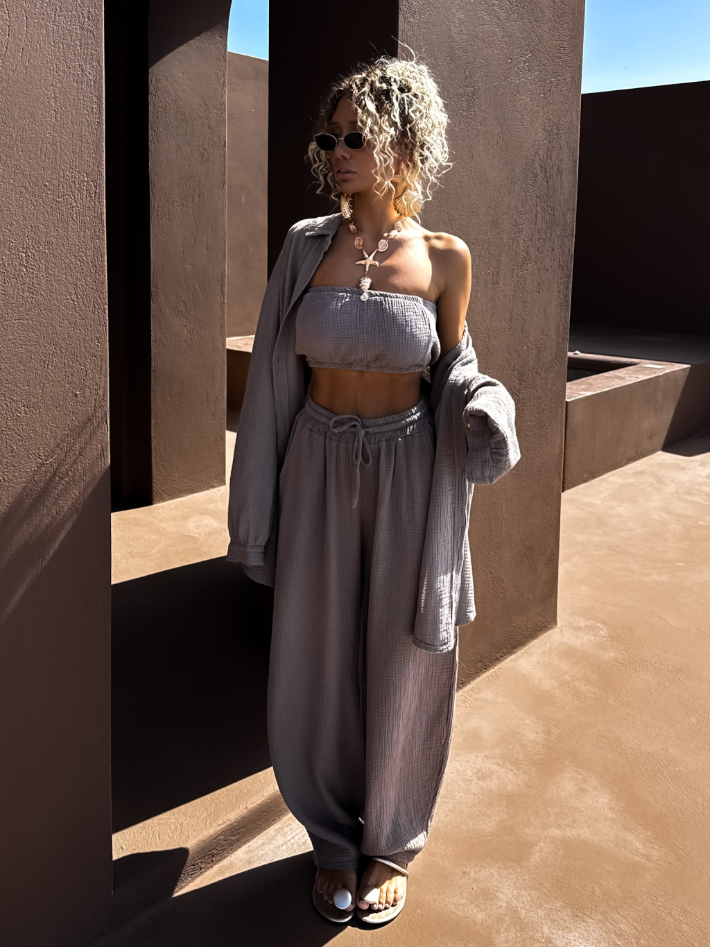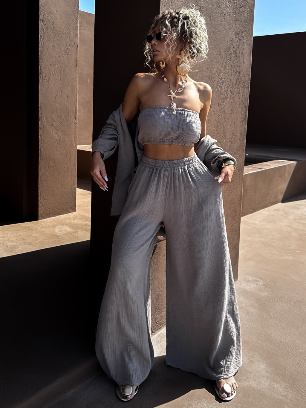 Šedohnědý mušelínový top BALEEN pás přes prsa