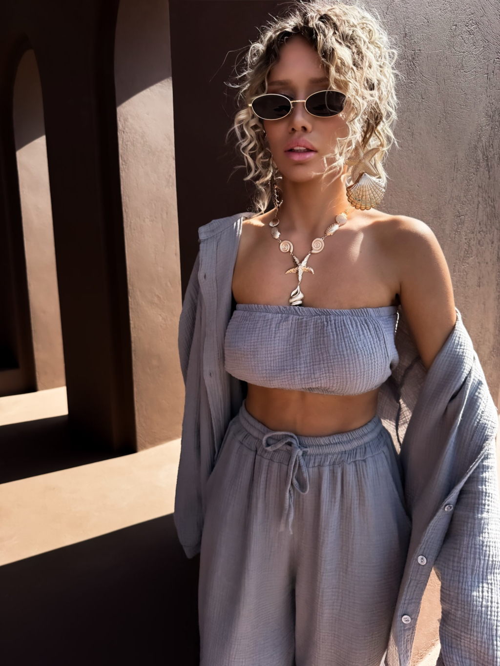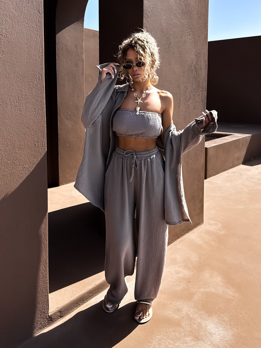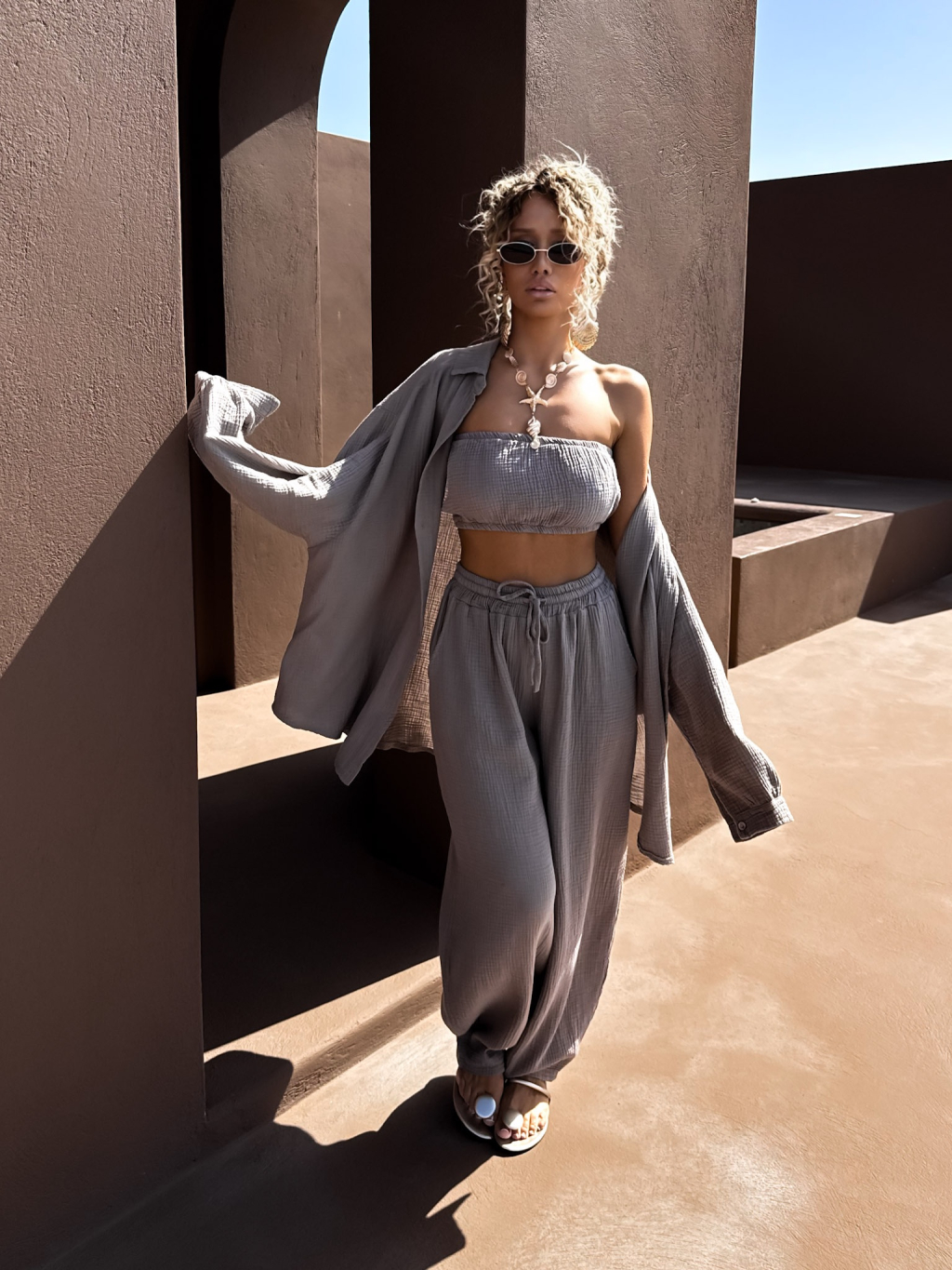 Šedohnědý mušelínový top BALEEN pás přes prsa