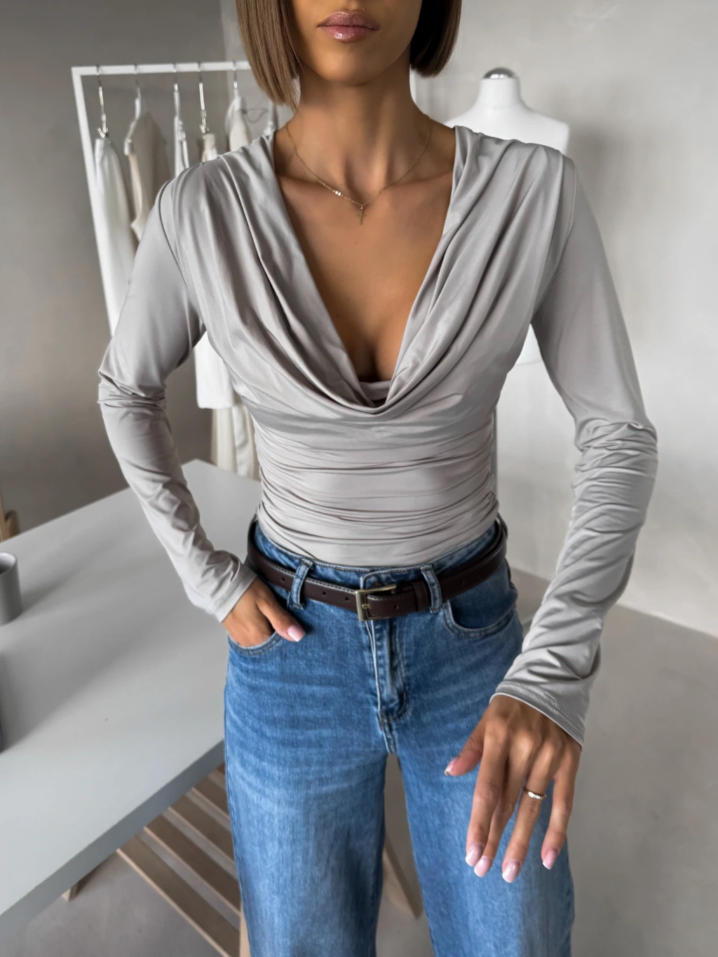 Béžové elegantní triko CALIRA s výstřihem