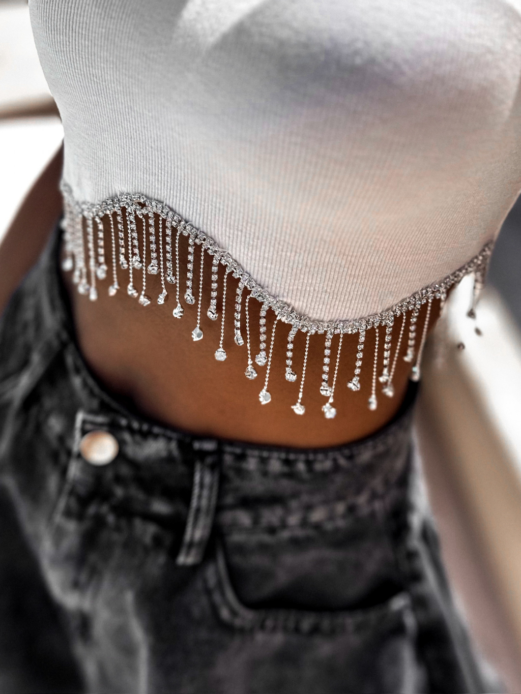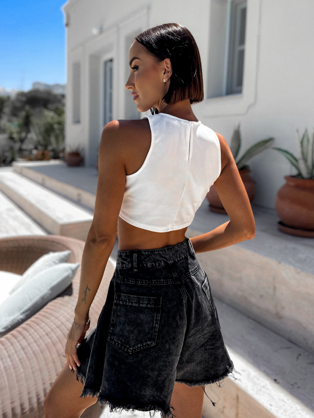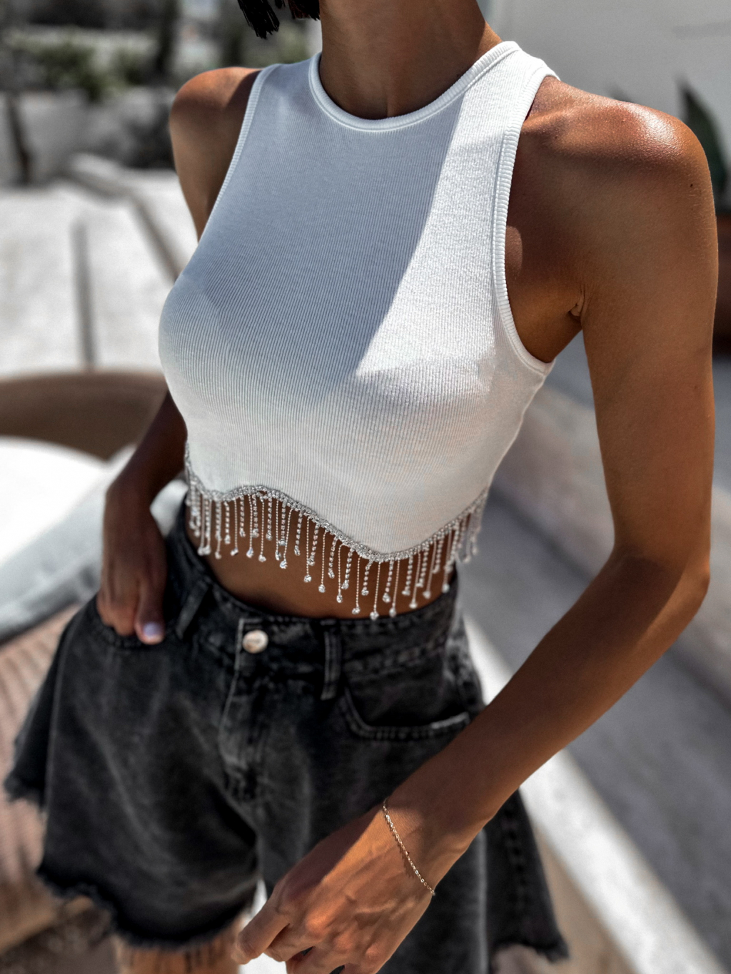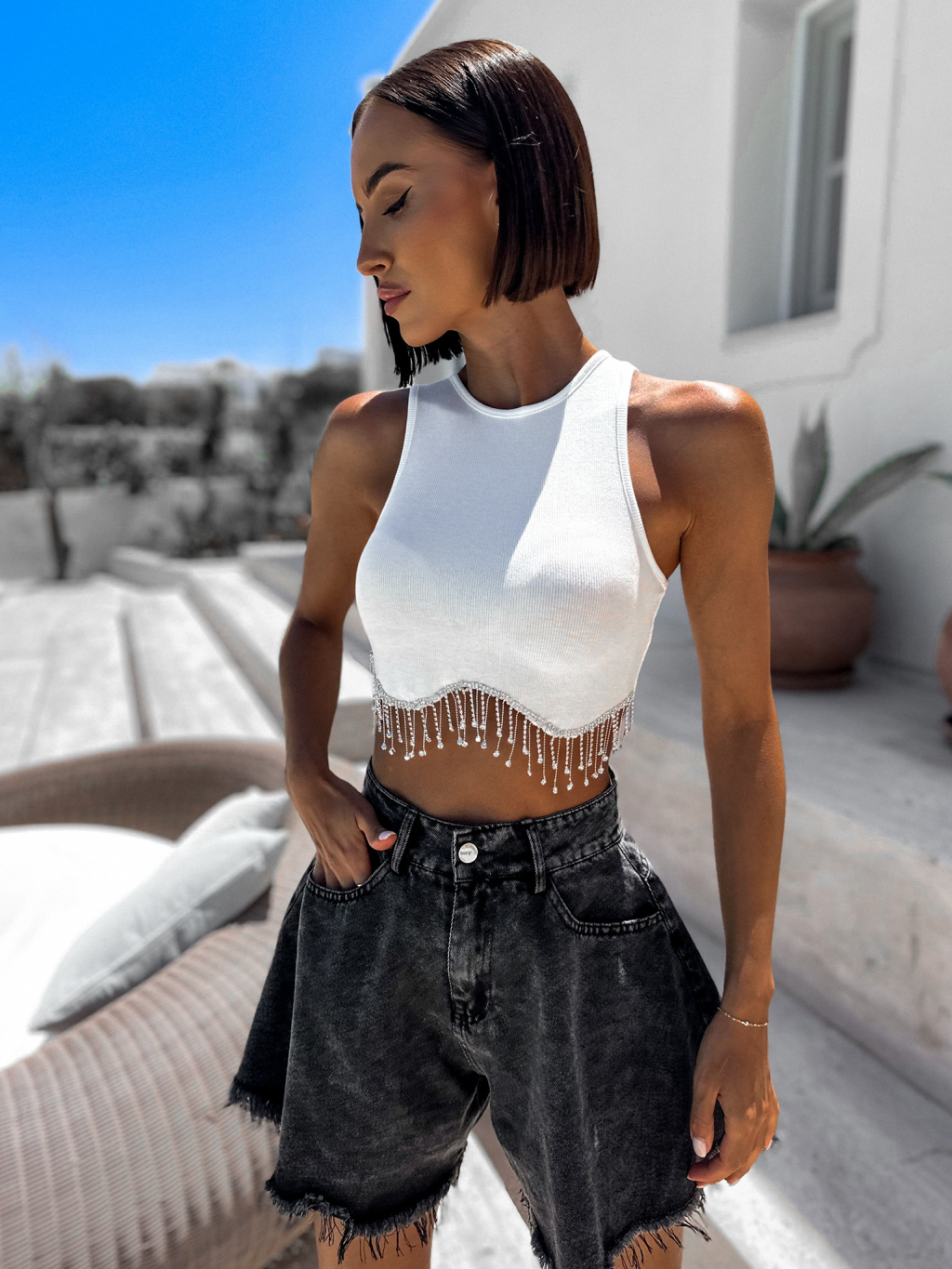 Bílý elegantní crop top POMPENE se stříbrným detailem