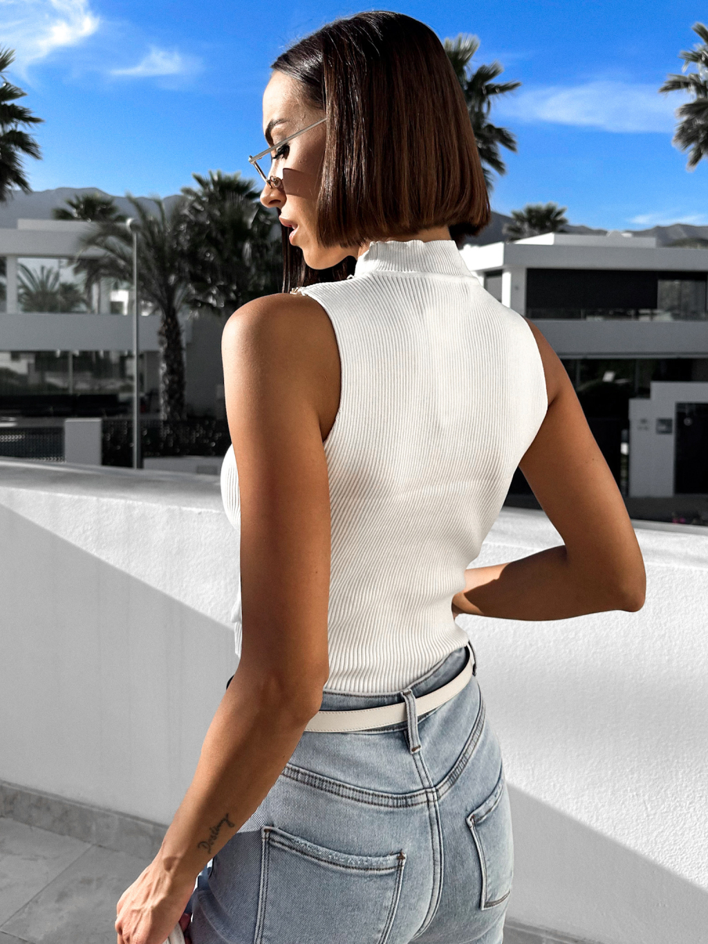 Bílý žebrovaný top BOLSANE se zlatým detailem